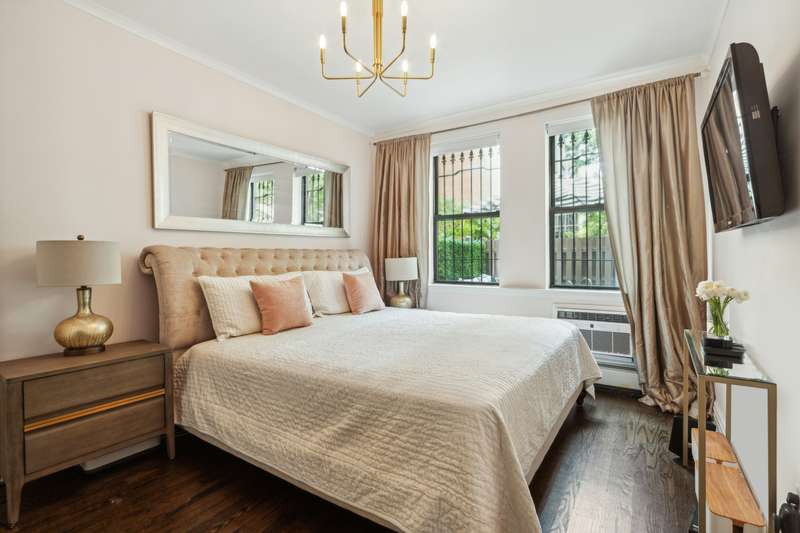 Elegantly upgraded by the owners, their bright full floor garden 2-bedroom/1.5 bath home is now being offered for rent. The charm is all in the details. High ceilings allow for oversized windows to provide lots of light and a leafy green view of Marcus Garvey Park across the street from the large east facing living/dining room. The spacious open kitchen design not only adds to the big airy space, but it adds to the home's superior functionality. High quality fixtures, cabinets and hardware are complemented by a matching panel Bosch dishwasher, Bosch stainless steel range and microwave, and a large stainless steel LG refrigerator. The counter seating blends the kitchen into the living area and facilitates serving into the dining area.