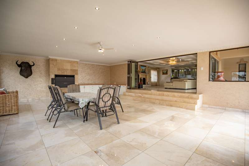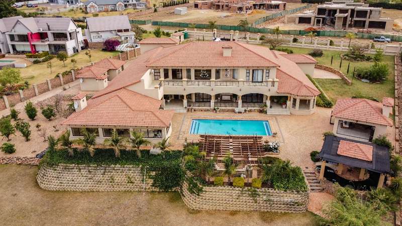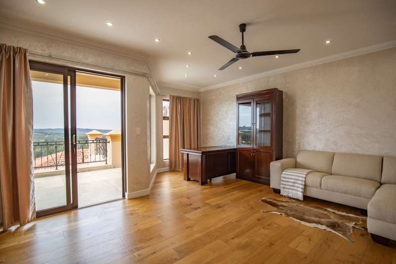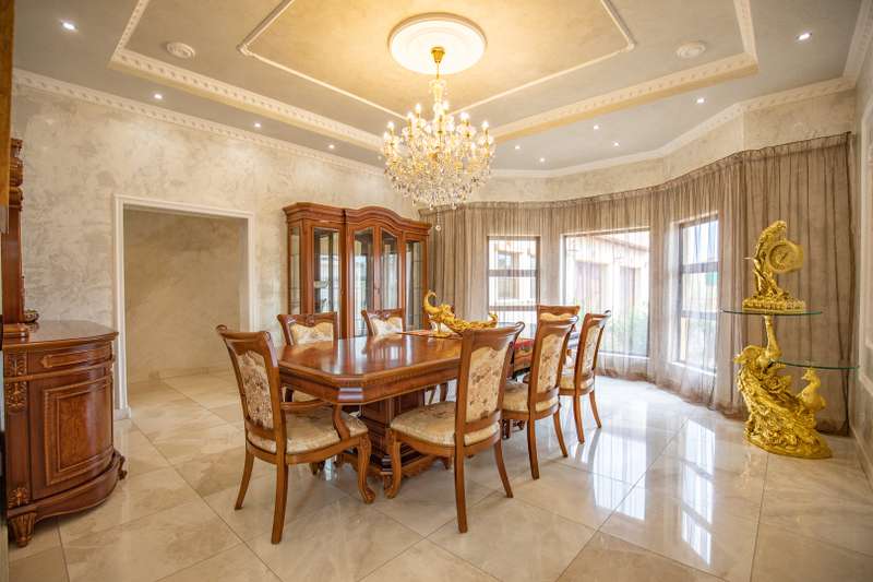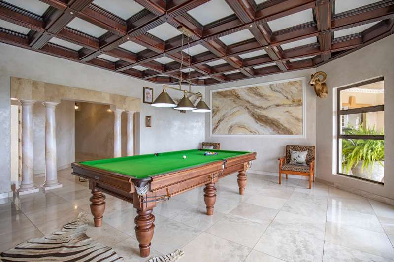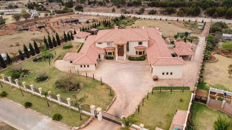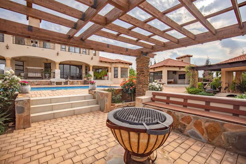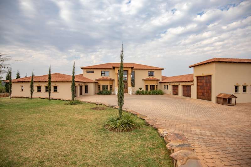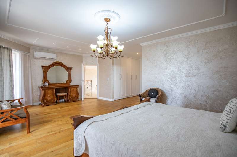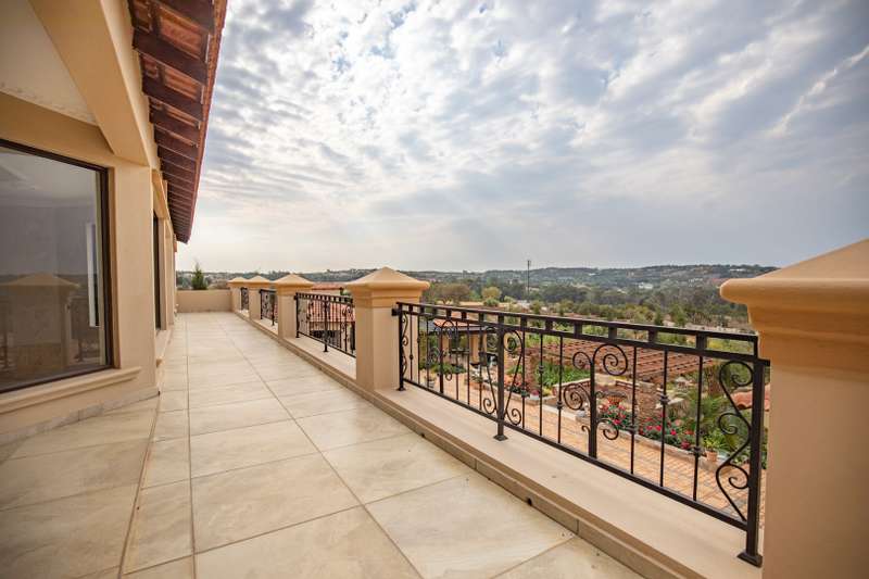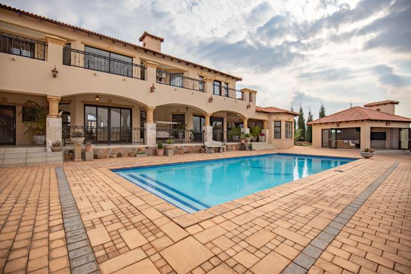 Looking at this property you might believe that you are is a chateau, on the Amalfi coast in Italy overlooking the Mediterranean see. This magnificent property offers luxurious finishes bound believe with uninterrupted views over Mooikloof and the Zwawelpoort valley. Solid oak front- and garage doors, marble flooring throughout almost the entire home, solid wooden flooring fitted in all bedrooms, a combination of stucco and "wet silk" paint on the walls, exquisite detail on the ceilings, and two crystal chandeliers that can be hoisted down with a remote control to be cleaned. The entire home is air-conditioned. The entire home has been furnished with imported Italian furniture. ALL FURNITURE INCLUDED. The lower level offers a double volume entrance hall, a double volume formal lounge, a movie theatre, a billiard room with bar area & fireplace, a separate dining room, a spacious family lounge with fireplace, an enormous entertainment room with built-in braai, a fully equipped kitchen with central island + walk-in pantry, a separate scullery / laundry room, and a breakfast room next to the kitchen. The billiard room, family lounge and entertainment room all open up to the garden and sparkling pool area with the Zwavelpoort valley in the background. The guest toilet can be used from both inside and outside when using the pool and outside entertainment areas. The master bedroom and office are also situated on the lower level. The master bedroom has a private lounge that overlooks the garden and pool area, and is served by a separate dressing room, a walk-in closet, and a beautiful en-suite bathroom with travertine tiles and roman style double jacuzzi bath. The office is also served by an en-suite bathroom and could be utilized as a fifth bedroom. The upper level offers another three very spacious bedrooms. Each bedroom opens up to a balcony and is served by a dressing room, and full en-suite bathroom. The second bedroom has a separate lounge area that could be converted into a sixth bedroom. The outside area offers a 12m x 5m pool, a boma area covered by a pergola, a second covered entertainment area surrounded by a Koi-pond, and a braai room / lapa with built-in braai and stacking doors to open or close according to the weather. Four extra-wide garages and a fifth garage to fit a boat or caravan. Work room leading out of garage. Bore hole with Jo-Jo water storage tanks. 3-Phase electricity. Irrigation. Domestic accommodation.