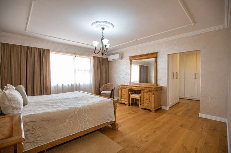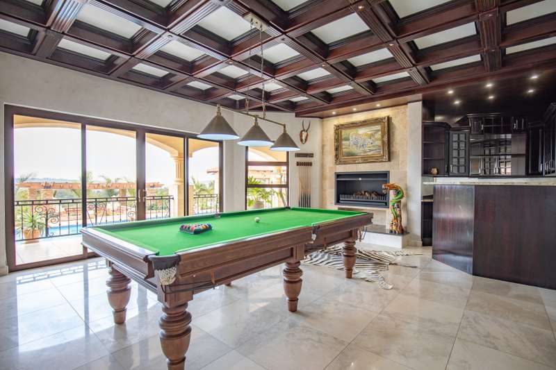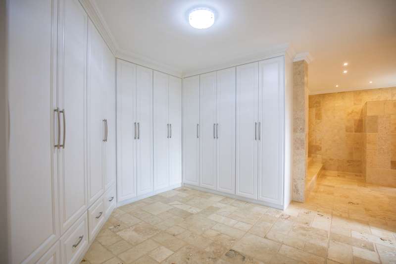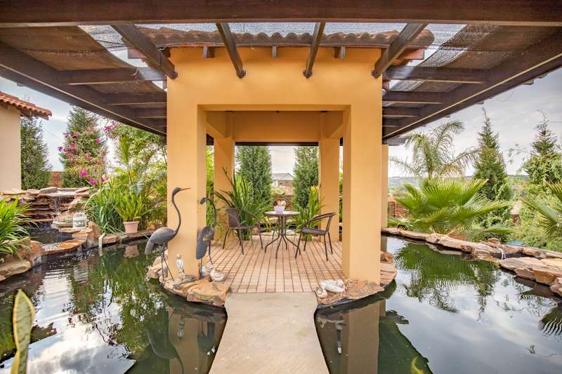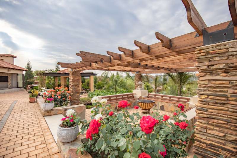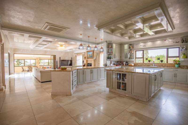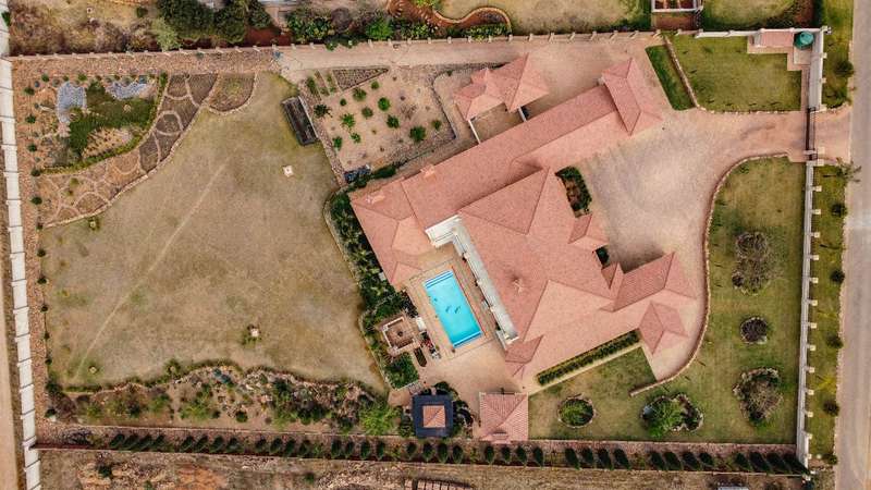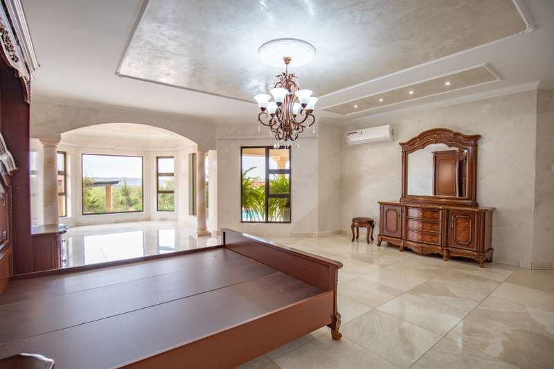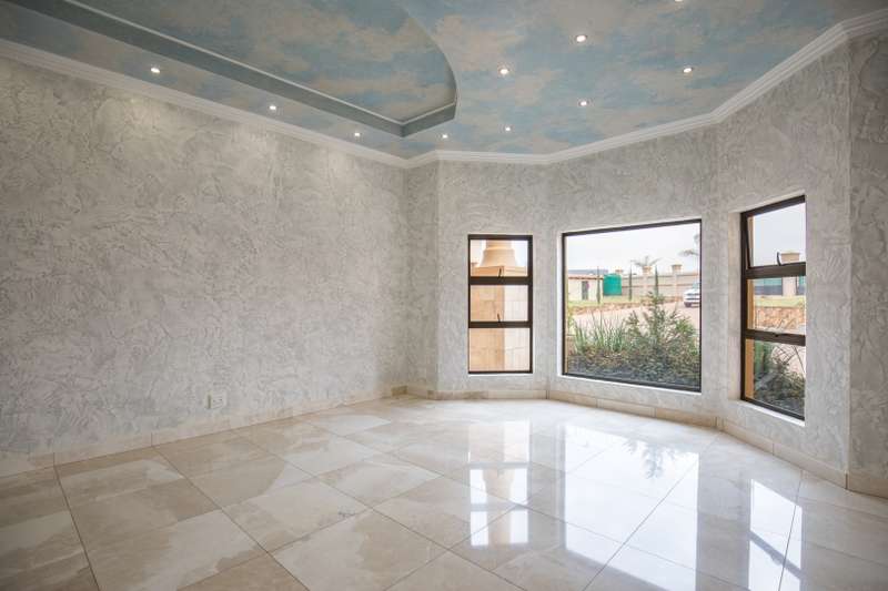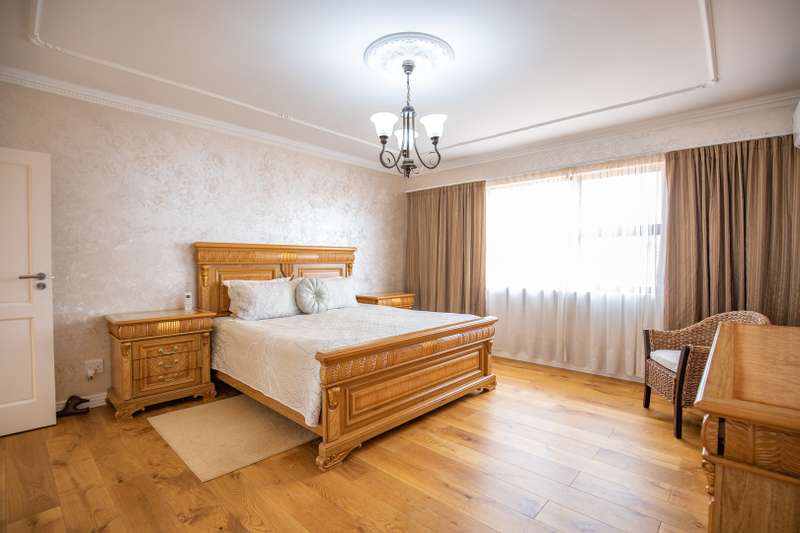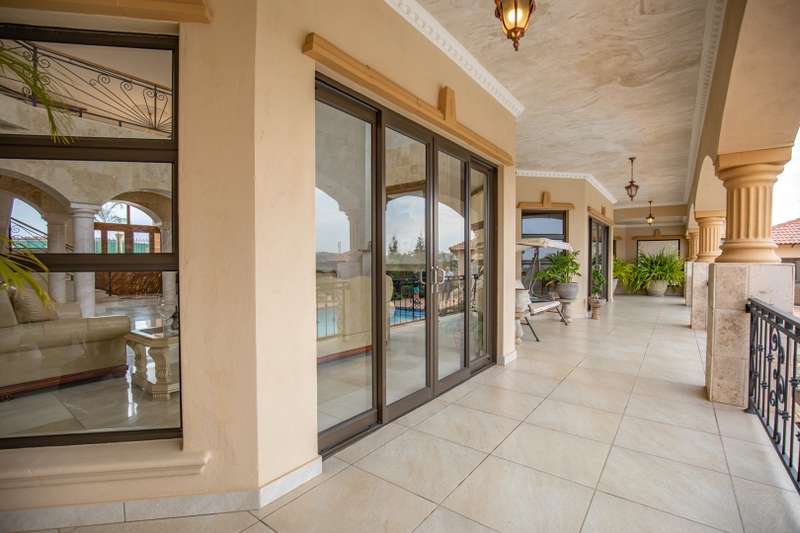 Looking at this property you might believe that you are is a chateau, on the Amalfi coast in Italy overlooking the Mediterranean see. This magnificent property offers luxurious finishes bound believe with uninterrupted views over Mooikloof and the Zwawelpoort valley. Solid oak front- and garage doors, marble flooring throughout almost the entire home, solid wooden flooring fitted in all bedrooms, a combination of stucco and "wet silk" paint on the walls, exquisite detail on the ceilings, and two crystal chandeliers that can be hoisted down with a remote control to be cleaned. The entire home is air-conditioned. The entire home has been furnished with imported Italian furniture. ALL FURNITURE INCLUDED. The lower level offers a double volume entrance hall, a double volume formal lounge, a movie theatre, a billiard room with bar area & fireplace, a separate dining room, a spacious family lounge with fireplace, an enormous entertainment room with built-in braai, a fully equipped kitchen with central island + walk-in pantry, a separate scullery / laundry room, and a breakfast room next to the kitchen. The billiard room, family lounge and entertainment room all open up to the garden and sparkling pool area with the Zwavelpoort valley in the background. The guest toilet can be used from both inside and outside when using the pool and outside entertainment areas. The master bedroom and office are also situated on the lower level. The master bedroom has a private lounge that overlooks the garden and pool area, and is served by a separate dressing room, a walk-in closet, and a beautiful en-suite bathroom with travertine tiles and roman style double jacuzzi bath. The office is also served by an en-suite bathroom and could be utilized as a fifth bedroom. The upper level offers another three very spacious bedrooms. Each bedroom opens up to a balcony and is served by a dressing room, and full en-suite bathroom. The second bedroom has a separate lounge area that could be converted into a sixth bedroom. The outside area offers a 12m x 5m pool, a boma area covered by a pergola, a second covered entertainment area surrounded by a Koi-pond, and a braai room / lapa with built-in braai and stacking doors to open or close according to the weather. Four extra-wide garages and a fifth garage to fit a boat or caravan. Work room leading out of garage. Bore hole with Jo-Jo water storage tanks. 3-Phase electricity. Irrigation. Domestic accommodation.