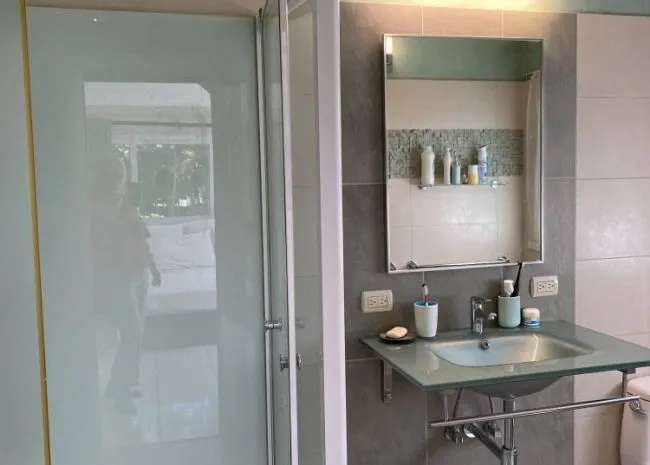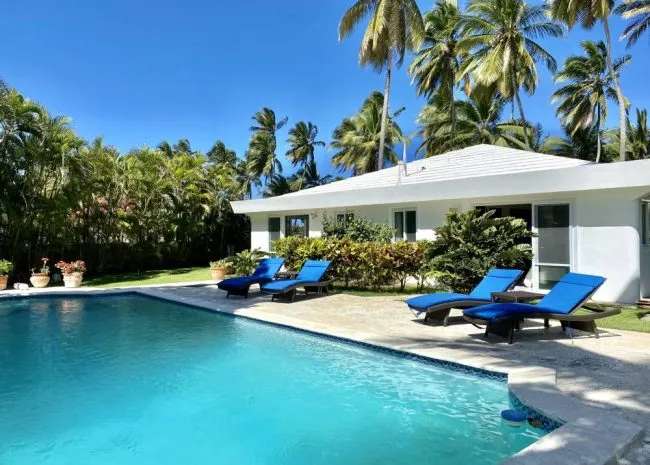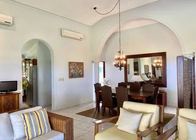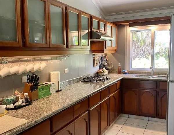 This adorable Cabarete beach house features 3 lovely bedrooms and 3 bathrooms. It was built on a 1,458 square meter right by the ocean. The inside is clean with crisp white walls and rich wooden cabinetry combined with tasteful furniture.