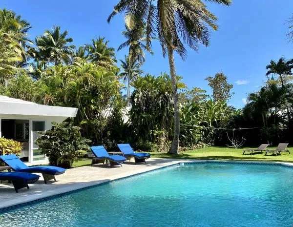 Only a few miles out of the town of Cabarete the property benefits from cooling trade-wind breezes and an abundance of shade trees. A nicely manicured lawn leads past the swimming pool to a low stone wall and a wooden gate. From there you walk to the beach and the enjoy ocean breeze. The small rooftop terrace allows you to the ocean and at night the stars.