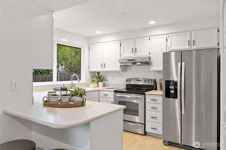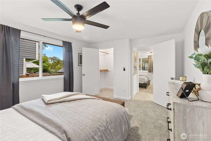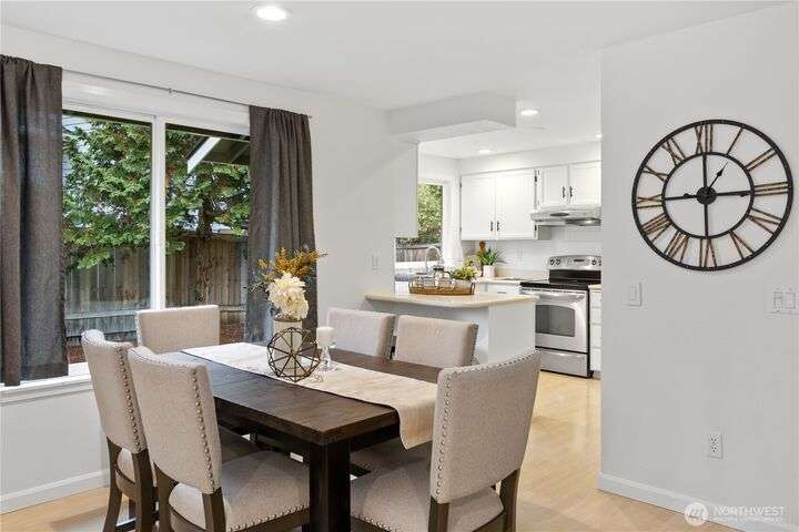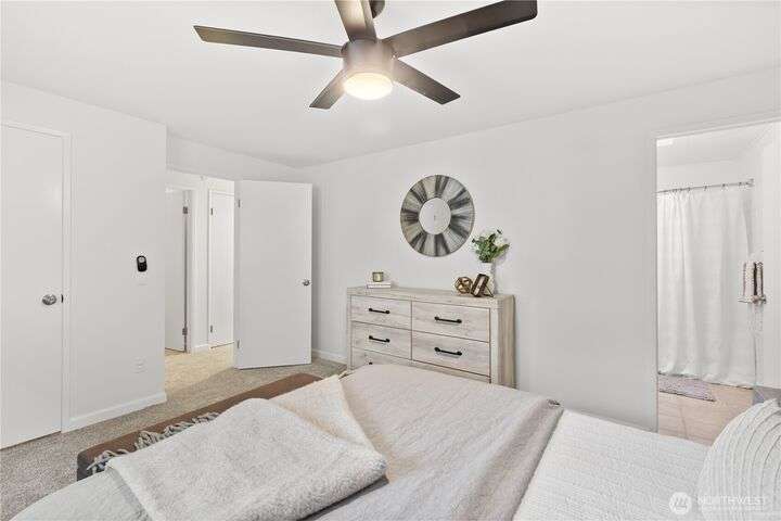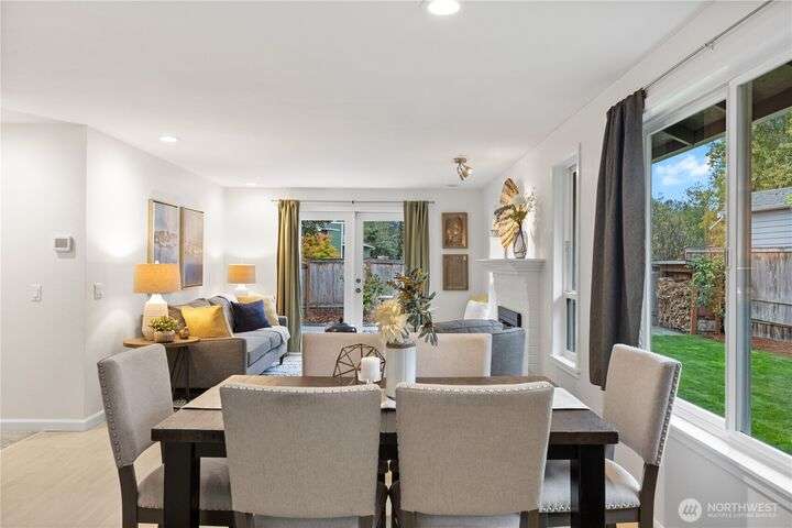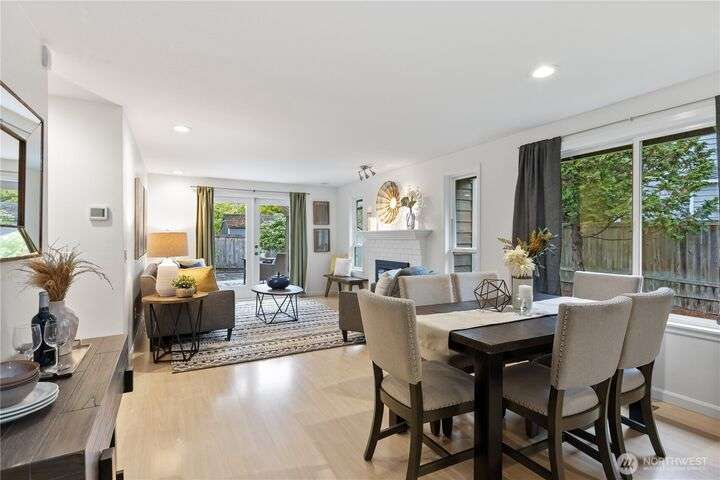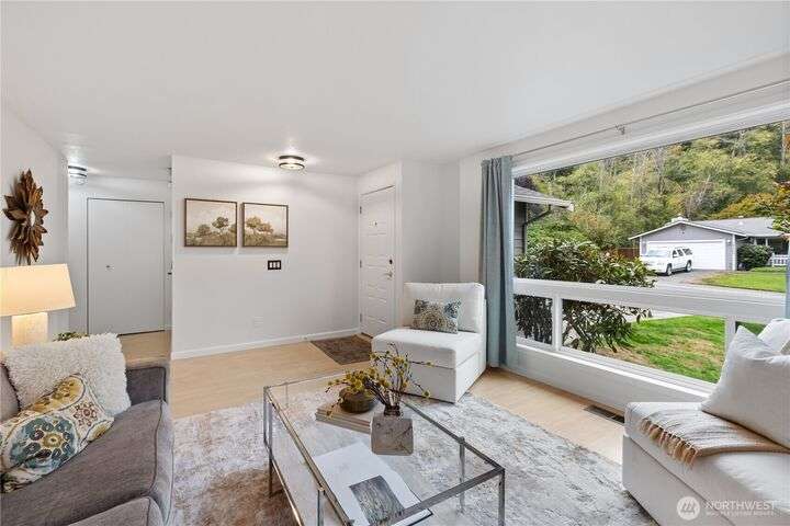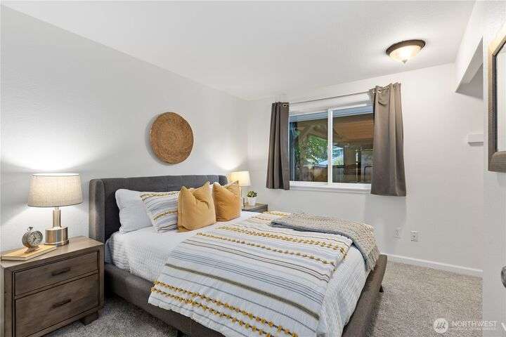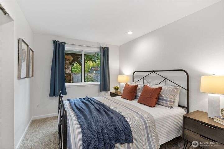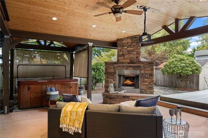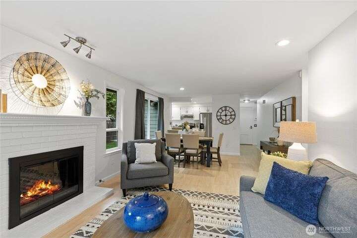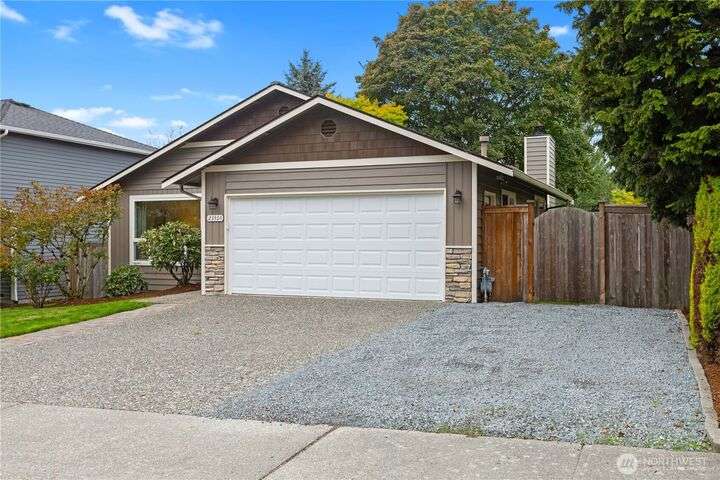 Welcome home to this beautifully refreshed rambler in the coveted Meadow Creek Park neighborhood. New carpet and fresh paint create a bright, modern aesthetic. The spacious living area centers around a stunning brick gas fireplace. Stay cool in our warmer months with air conditioning.Kitchen with newer appliances & ample pantry. Entertain in style in the outdoor room featuring a private hot tub, projection screen and wood burning fireplace. Backyard garden shed and covered firewood storage, as well as lawn for yard games and fun for all ages! The exterior is freshly painted and the roof was replaced five years ago.Northshore School District. Conveniently located to I-5 and I-405, shopping, parks.