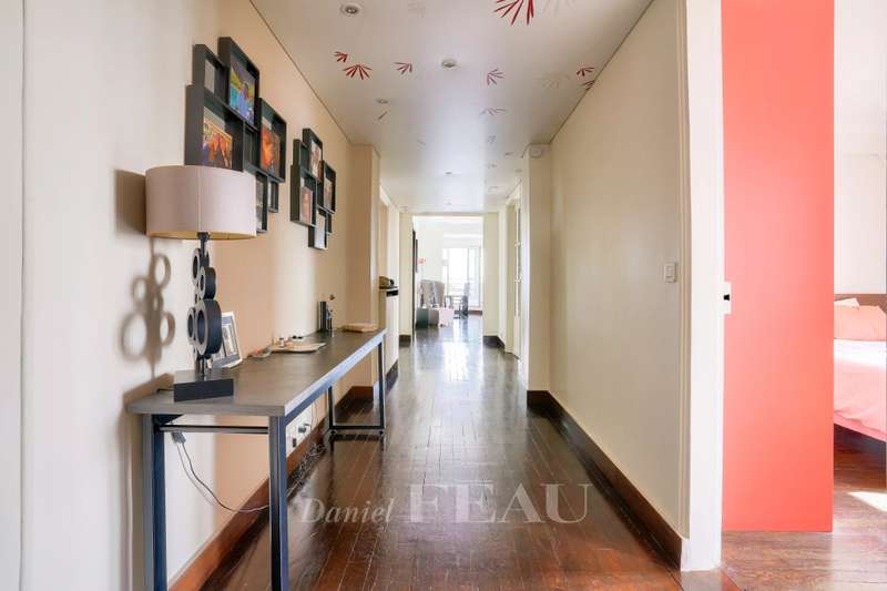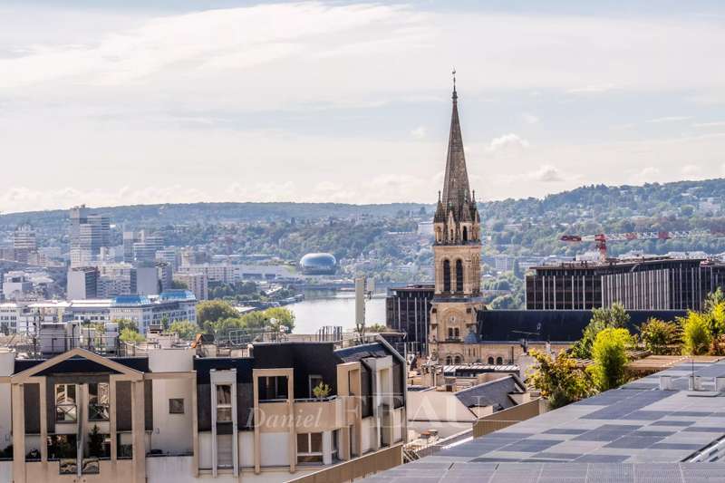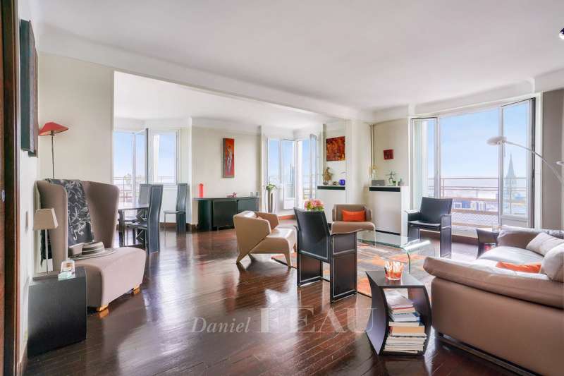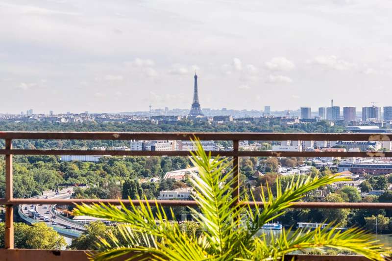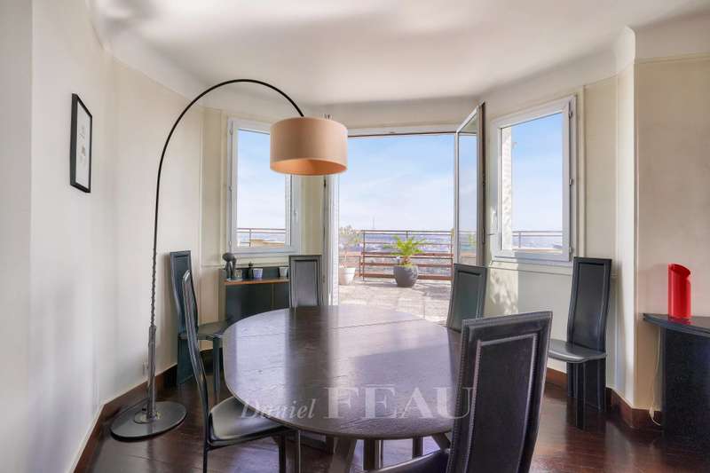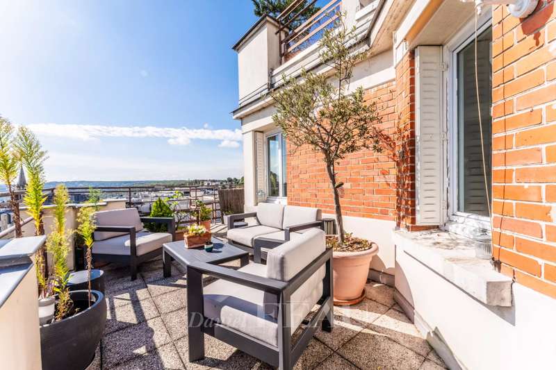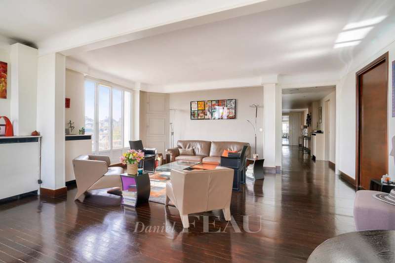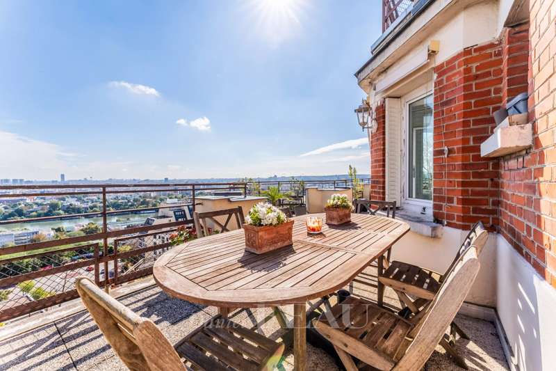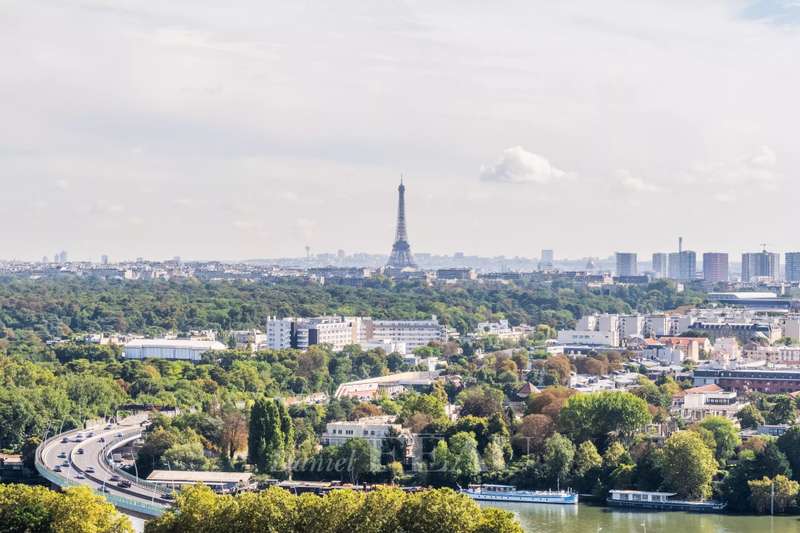 This bright apartment offering 155.13 sqm of living space as defined by the Carrez Law is on the seventh floor of a fine 1930’s rt Deco building. Benefiting from a 37 sqm terrace commanding an exceptional view of the capital and the Eiffel Tower, it includes a 41 sqm living/reception room, an equipped kitchen (both opening onto the terrace), three bedrooms (two with shower rooms), a master suite with a bathroom, two wc and a utility area. All bedrooms enjoy an open view. With a parking space in a nearby residence and a cellar. In a convenient location near the shops and the station a short distance west of the capital.