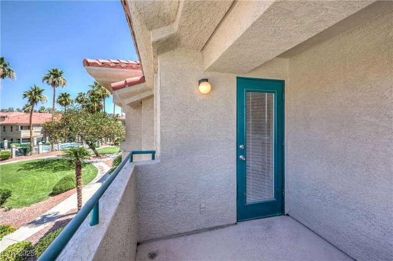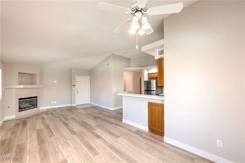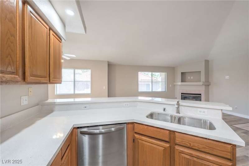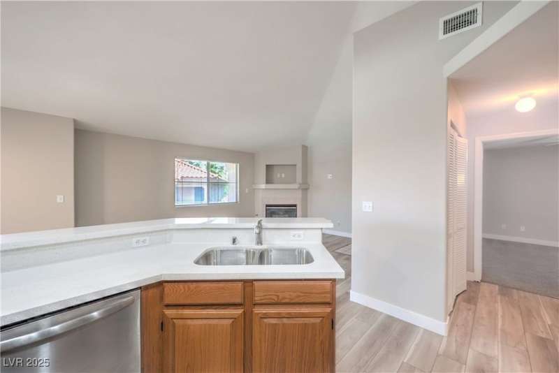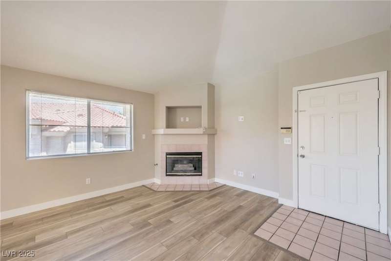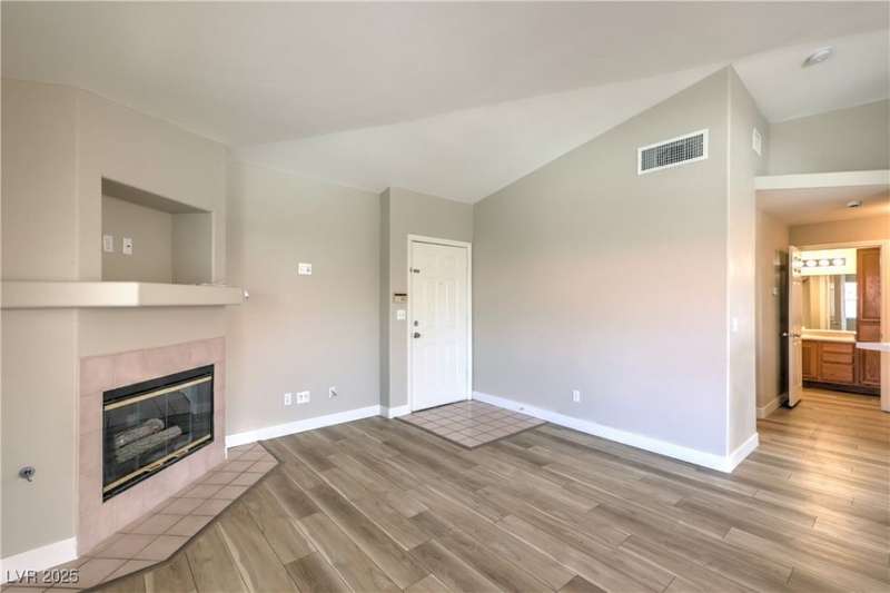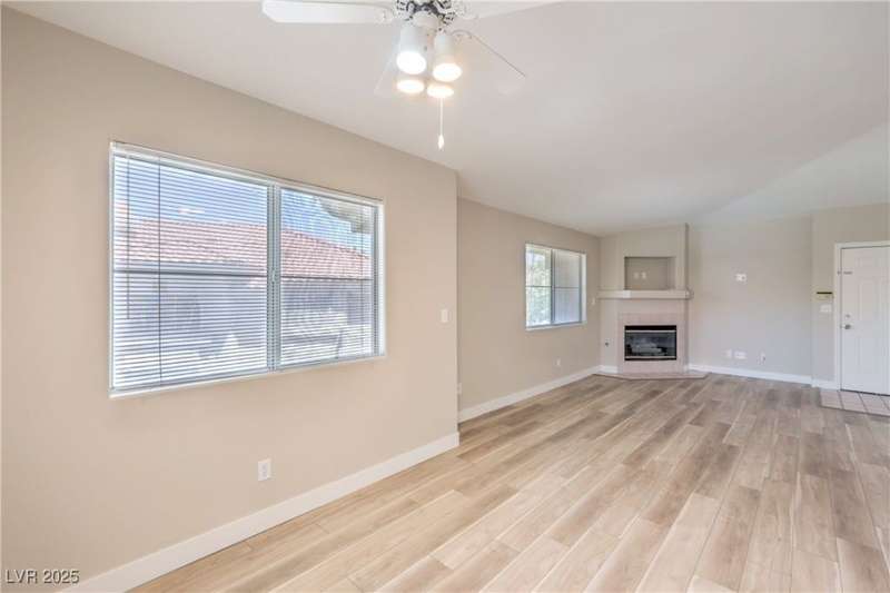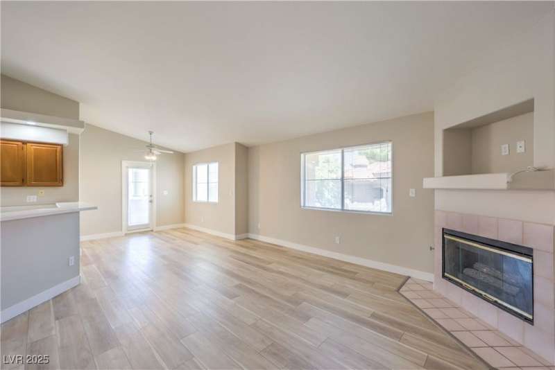 Bank Owned Beauty in Green Valley! Freshly updated with brand new flooring throughout, new paint, and sleek countertops?this spacious corner unit is move-in ready! Soaring cathedral ceilings in the living room create an open, airy feel, complemented by a cozy gas fireplace and stylish ceiling fans throughout. The kitchen shines with updated surfaces and natural light. The oversized primary suite boasts 10-ft ceilings, a massive walk-in closet, dual sinks, and a walk-in shower. The large second bedroom has its own full bath?perfect for guests or roommates. Enjoy your morning coffee on the French-doored balcony overlooking the sparkling community pool. Solar-screened entry, upgraded flooring, and convenient parking near the unit complete the package. Priced to sell?don't miss this Green Valley gem!