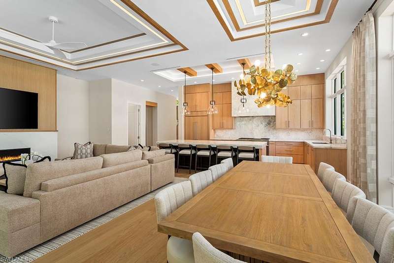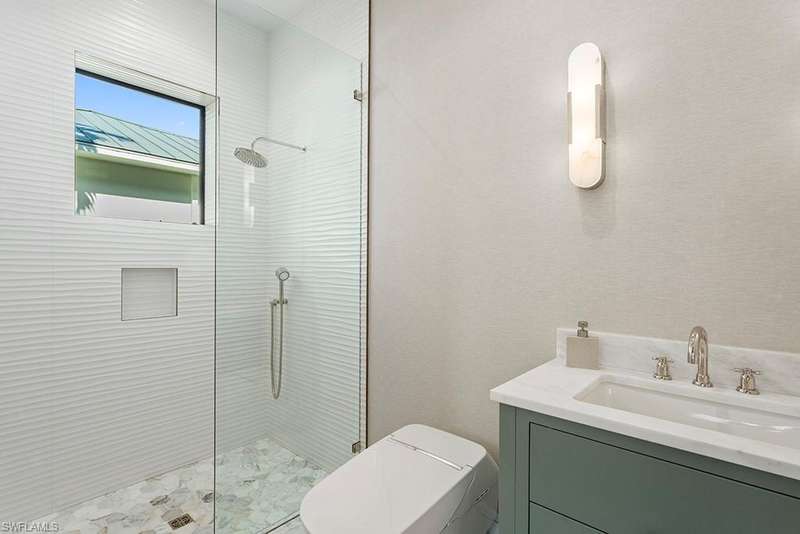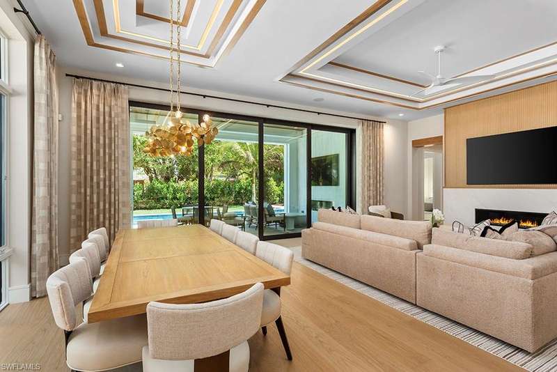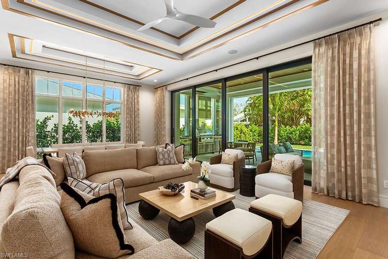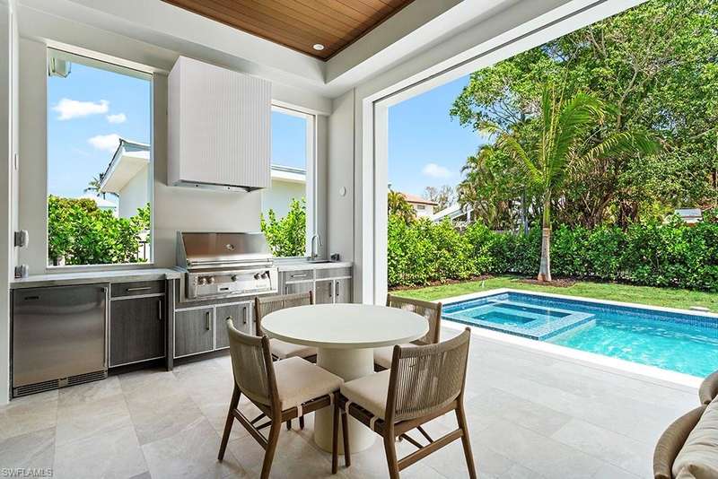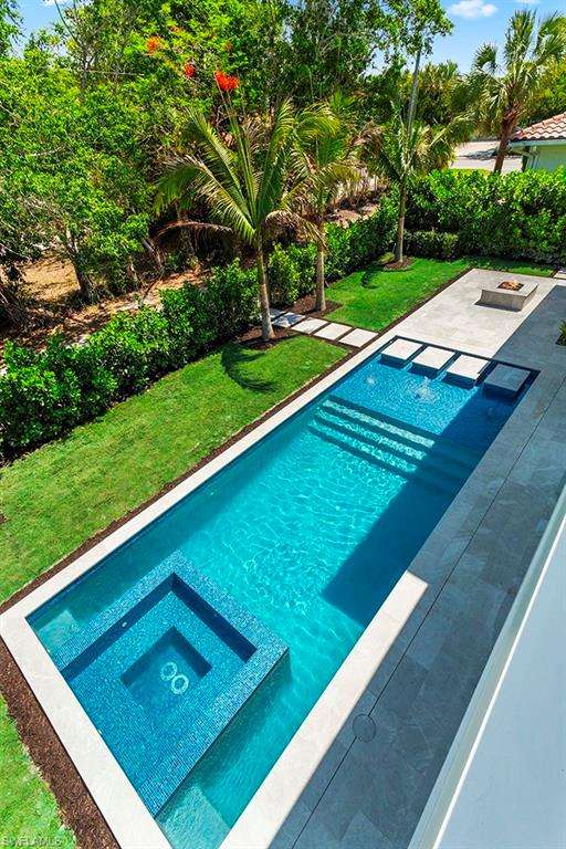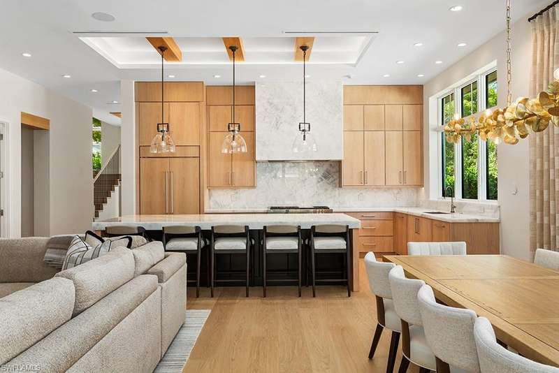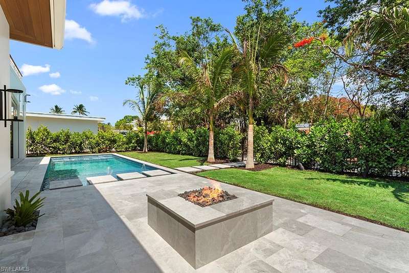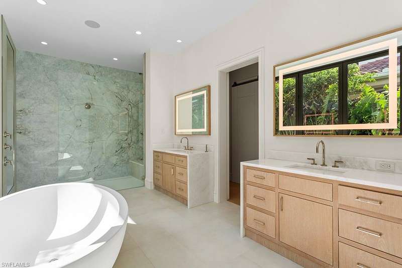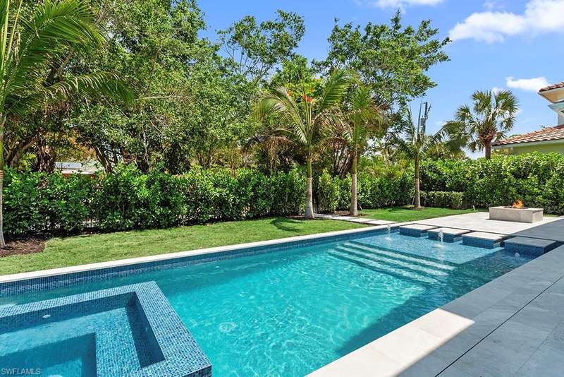 Exceptional new construction home in Old Naples with 5,000 square feet of open-floor-plan living space. 5 bedrooms and 6 bathrooms. Walk or bike to the beach and the new Four Seasons resort and restaurants. Top-of-line, sophisticated finishes throughout. The great room and kitchen are surrounded by floor-to-ceiling windows and sliding doors that open out to a covered patio and generous backyard with a lushly landscaped lawn, pool, spa, and fire table for effortless indoor/outdoor living. The ground floor includes a luxurious master suite & sitting room with a spacious, oversized bathroom and two enormous walk-in closets. A guest bedroom with bath is also on the 1st floor. The kitchen is equipped with custom cabinetry, Wolf/Subzero appliances, two dishwashers and an island with seating for five. A walk-in pantry includes a wine cooler, two pull-out refrigeration drawers, and lighted, open shelving. The second floor has 3 additional large bedrooms, all with en-suite bathrooms and walk-in