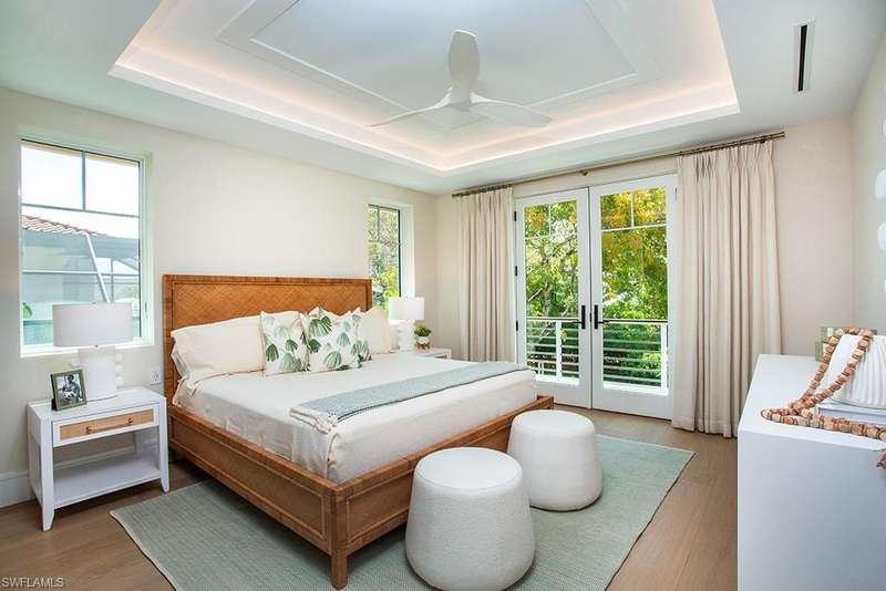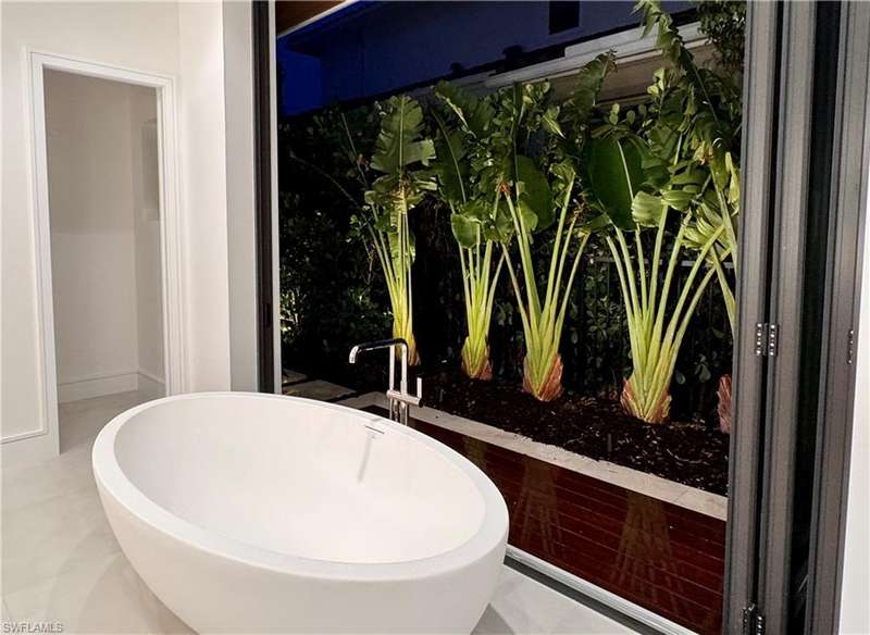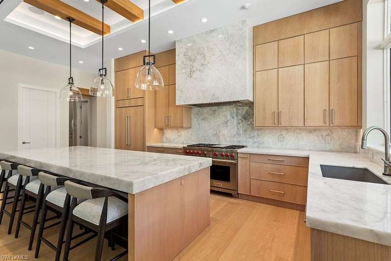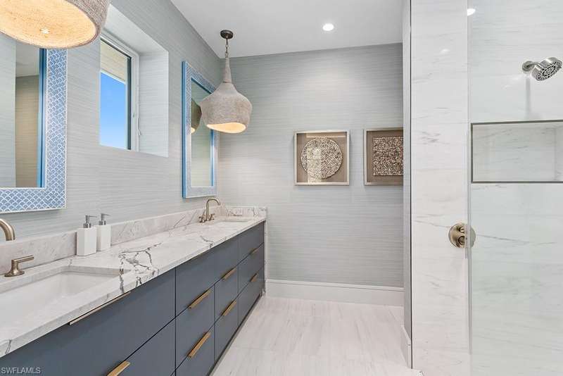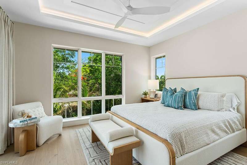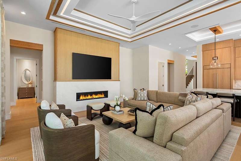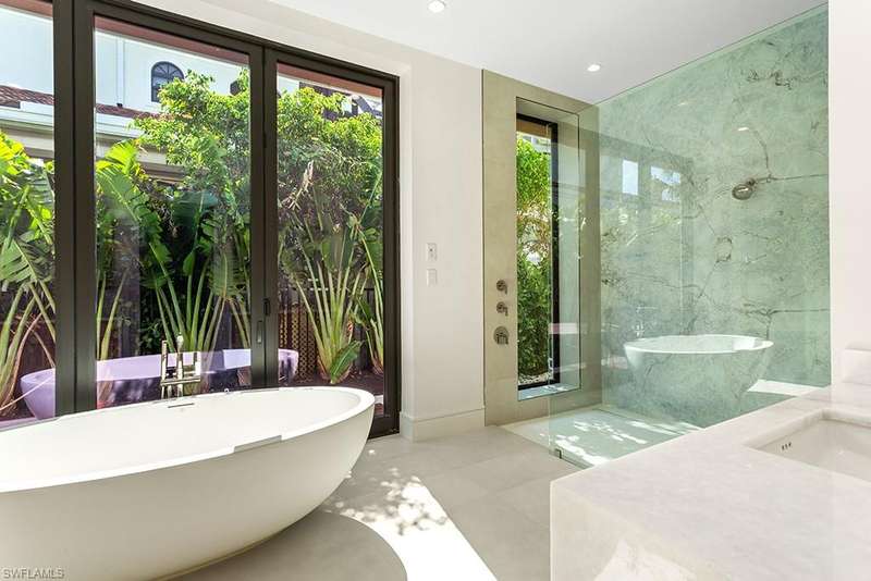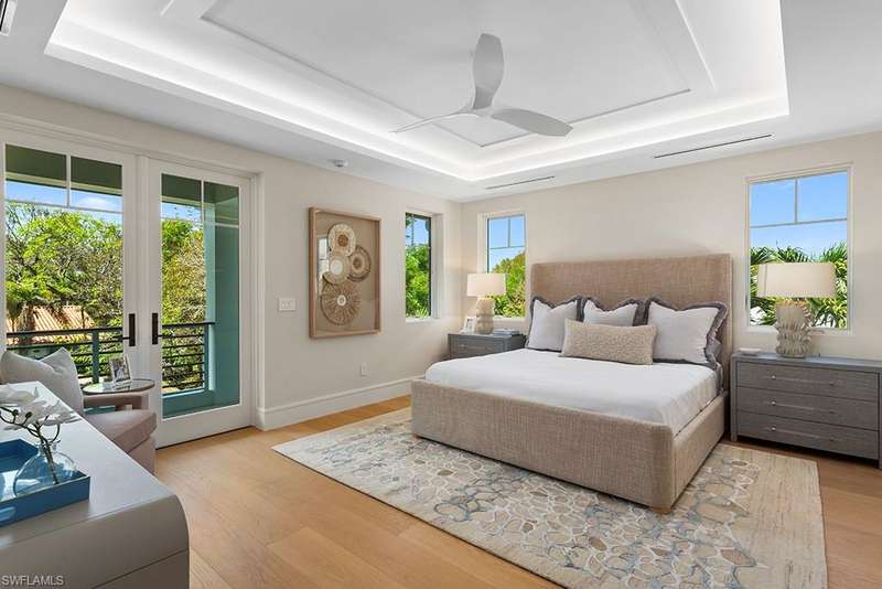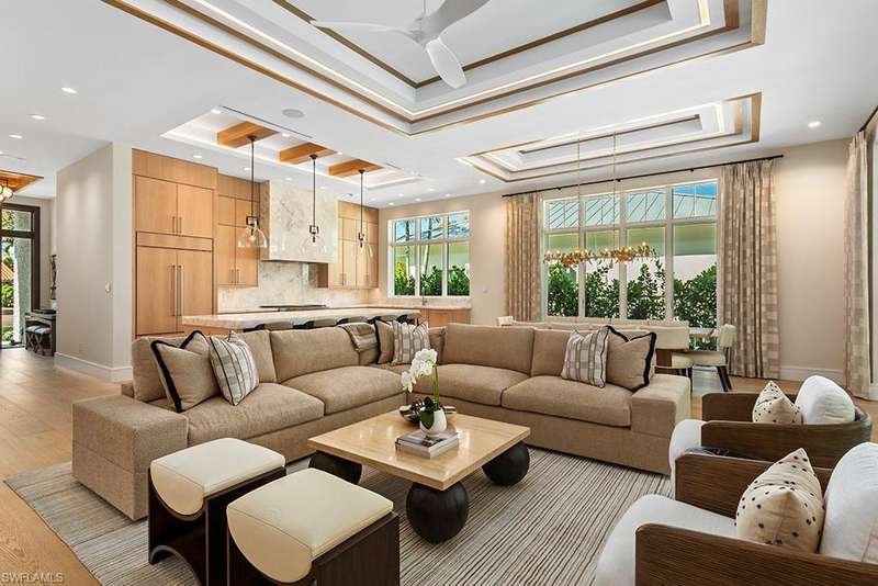 Exceptional new construction home in Old Naples with 5,000 square feet of open-floor-plan living space. 5 bedrooms and 6 bathrooms. Walk or bike to the beach and the new Four Seasons resort and restaurants. Top-of-line, sophisticated finishes throughout. The great room and kitchen are surrounded by floor-to-ceiling windows and sliding doors that open out to a covered patio and generous backyard with a lushly landscaped lawn, pool, spa, and fire table for effortless indoor/outdoor living. The ground floor includes a luxurious master suite & sitting room with a spacious, oversized bathroom and two enormous walk-in closets. A guest bedroom with bath is also on the 1st floor. The kitchen is equipped with custom cabinetry, Wolf/Subzero appliances, two dishwashers and an island with seating for five. A walk-in pantry includes a wine cooler, two pull-out refrigeration drawers, and lighted, open shelving. The second floor has 3 additional large bedrooms, all with en-suite bathrooms and walk-in