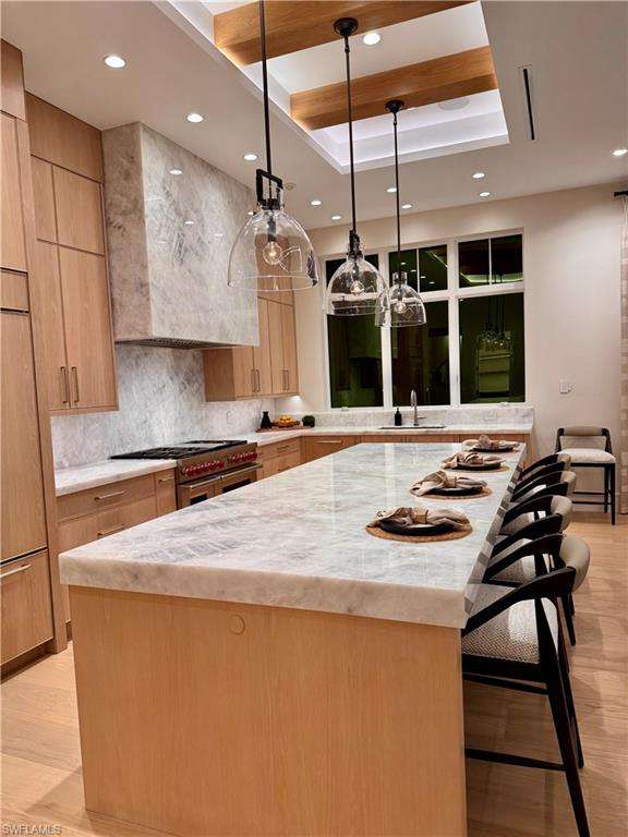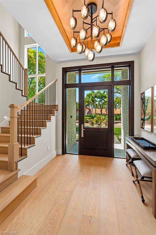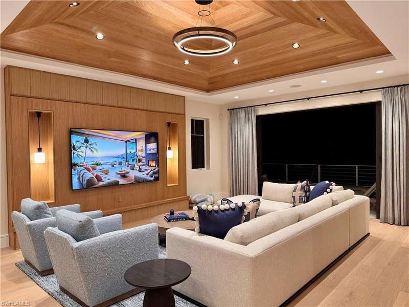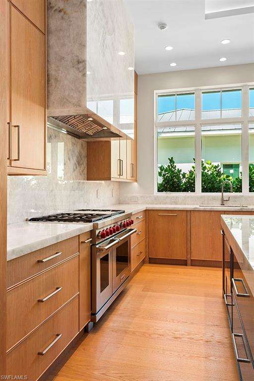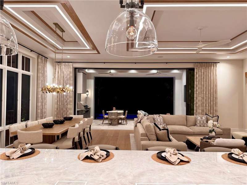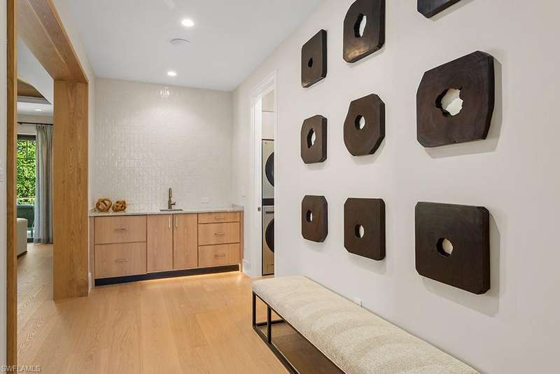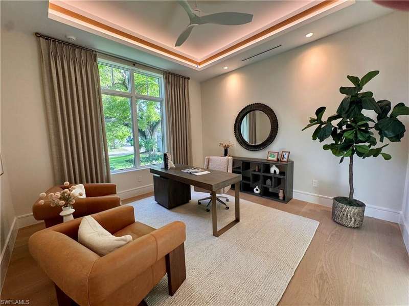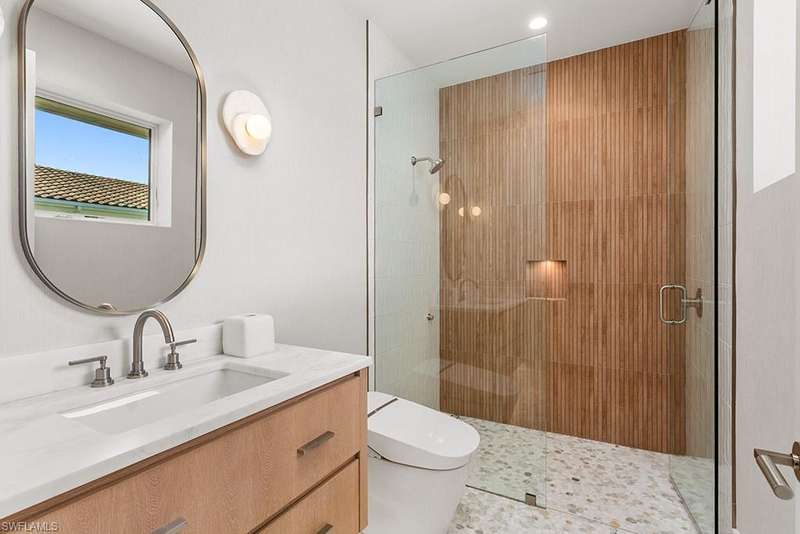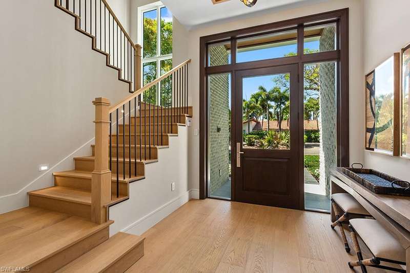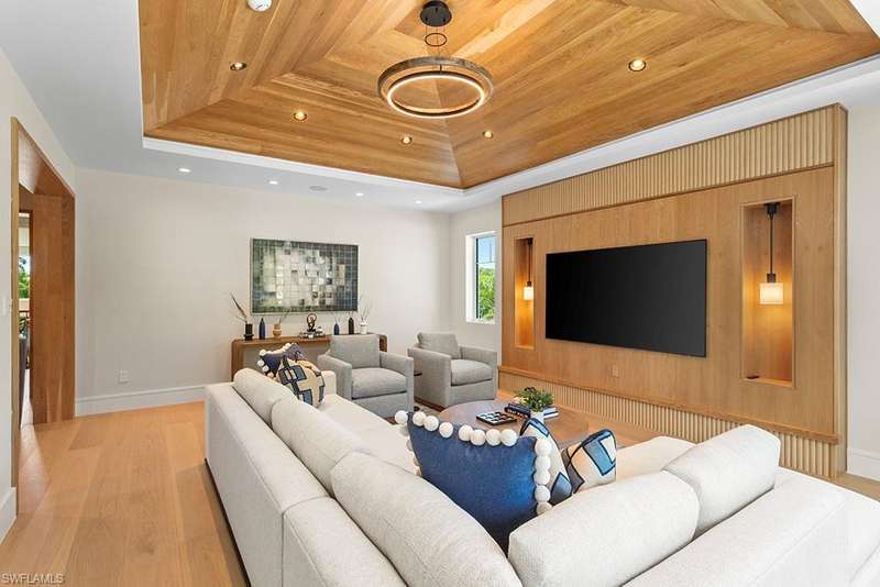 Exceptional new construction home in Old Naples with 5,000 square feet of open-floor-plan living space. 5 bedrooms and 6 bathrooms. Walk or bike to the beach and the new Four Seasons resort and restaurants. Top-of-line, sophisticated finishes throughout. The great room and kitchen are surrounded by floor-to-ceiling windows and sliding doors that open out to a covered patio and generous backyard with a lushly landscaped lawn, pool, spa, and fire table for effortless indoor/outdoor living. The ground floor includes a luxurious master suite & sitting room with a spacious, oversized bathroom and two enormous walk-in closets. A guest bedroom with bath is also on the 1st floor. The kitchen is equipped with custom cabinetry, Wolf/Subzero appliances, two dishwashers and an island with seating for five. A walk-in pantry includes a wine cooler, two pull-out refrigeration drawers, and lighted, open shelving. The second floor has 3 additional large bedrooms, all with en-suite bathrooms and walk-in
