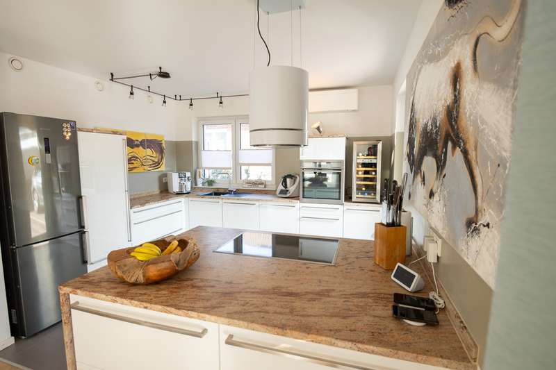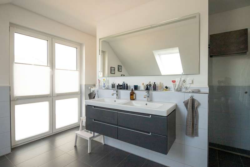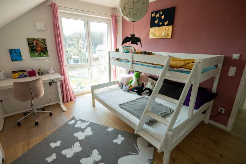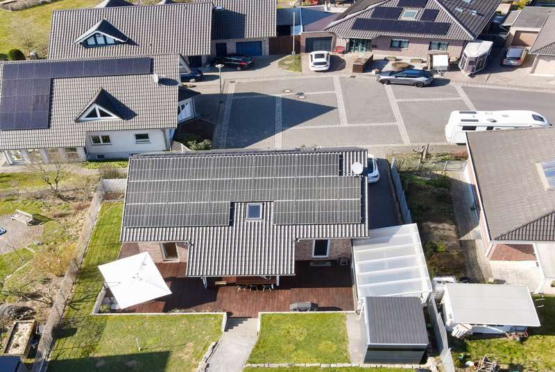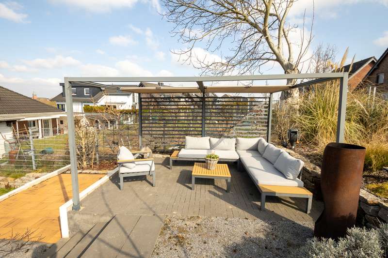 This detached family home, built in 2015, offers a living space of approx. 176.87 m² and stands on a generous plot of approx. 613 m². With a total of 5 rooms, including 3 bedrooms, and 2 modern bathrooms, it leaves nothing to be desired. The property is designed as an energy-efficient KfW-55 house by Viebrockhaus and impresses with a remarkable final energy requirement of just 23.8 kWh/m²a. At the heart of the technical equipment is the environmentally friendly exhaust air/water heat pump system from NIBE, type F755G, which controls both the underfloor heating and the hot water supply. The pleasant indoor climate is supported by a central ventilation system and triple-glazed windows, some of which are floor-to-ceiling. All rooms are equipped with modern Daikin air conditioning units, which can be used for both cooling and heating purposes and can be conveniently controlled via an app. The interior features a high-quality design concept: high-quality laminate flooring in the living areas and high-quality ceramic tiles in the bathrooms create a harmonious living ambience. The bathrooms are equipped with floor-to-ceiling showers; the bathroom on the upper floor also has a large bathtub and is fitted with bathroom fittings from Villeroy & Boch, Subway 2.0 version. The open fitted kitchen is functionally designed and equipped with numerous amenities. Electric shutters ensure comfort and security. The spacious terrace is partially covered and invites you to relax. A carport measuring 3.00 m x 6.24 m is available for vehicles, in addition to further parking spaces in front. A fiber optic connection guarantees fast internet, while a PV system with 19.50 kWp including storage of 13.50 kWh and inverters from Fronius ensure a sustainable energy supply. A wallbox with 11 kW charging power is available for charging electric vehicles. The garden irrigation can be conveniently controlled via app, which makes it much easier to maintain the outdoor area. A robotic mower ensures a perfectly manicured lawn. Another highlight is the elaborately designed garden with 2 terraces - one partially covered with real wood decking and a sun terrace with pergola - as well as a fire pit, a greenhouse and a large shed for garden furniture and equipment. These exceptional features are just a glimpse of what this house has to offer. The outstanding quality of the fixtures and fittings combined with the modern central and underfloor heating as well as the environmentally friendly energy solutions underline the high standard of this property. Do not hesitate to arrange a viewing appointment to see the many advantages of this detached house for yourself. You can expect a well thought-out room concept and fittings that leave nothing to be desired.