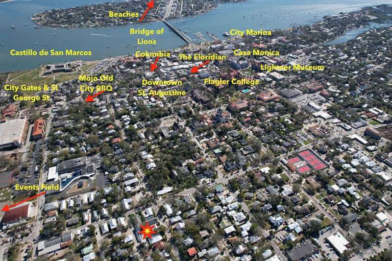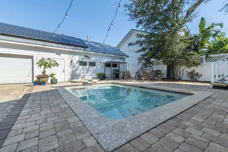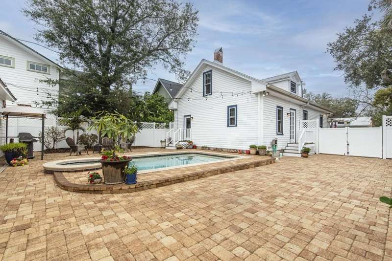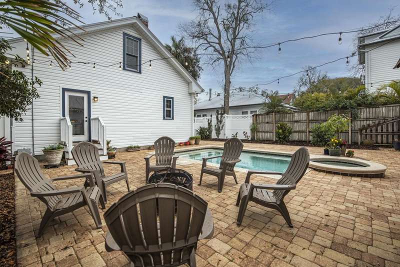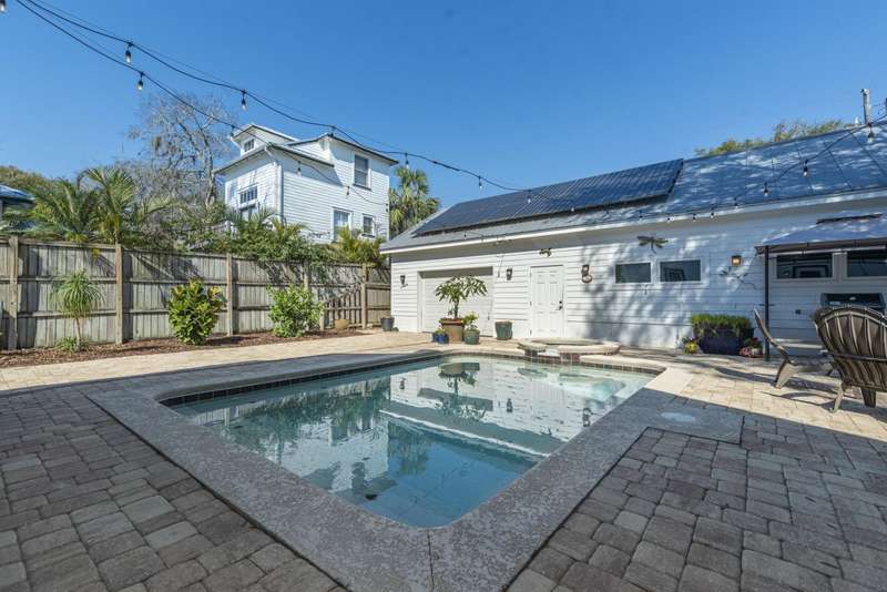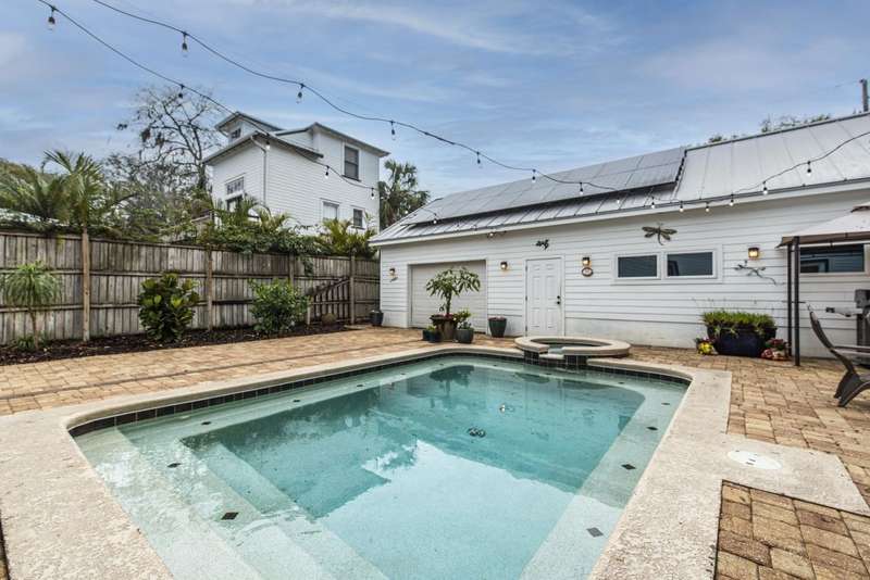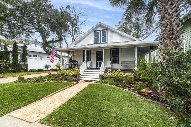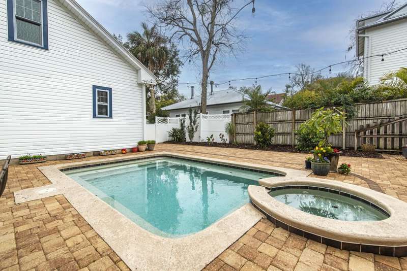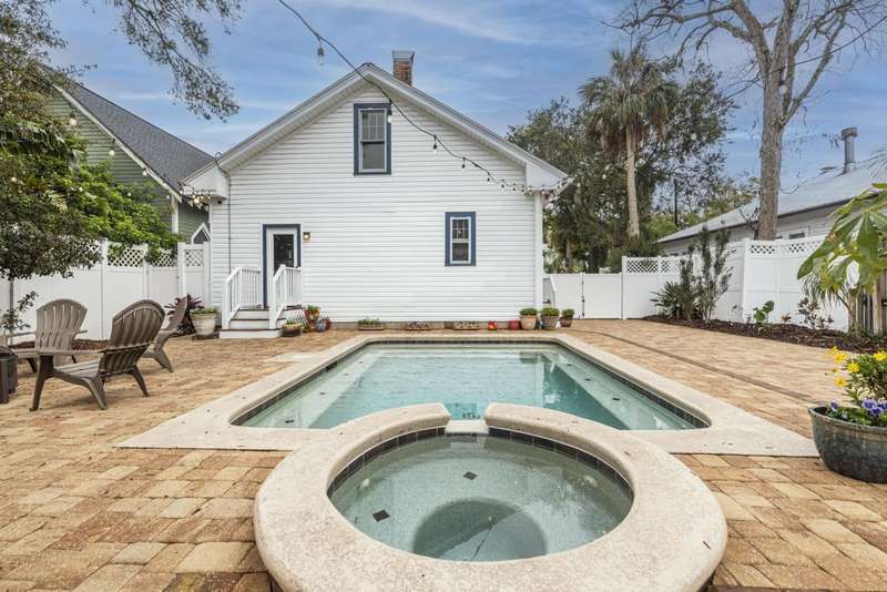 Flexible Zoning for homestead or a vacation rental! Step into a perfect blend of historic charm and contemporary convenience with this beautifully renovated 1910 home which hosts one of St. Augustines famous love trees. Featuring 3 bedrooms, 2.5 baths, and a spacious 4-car garage, this residence offers the ideal balance of character and comfort. Original wood floors, vintage moldings, and exposed chimneys pay homage to its storied past, while thoughtful updates ensure a seamless modern living experience. Designed for both relaxation and entertaining, the heated swimming pool and hot tub???fully controllable via smartphone???transform your backyard into a private oasis ideal for entertaining. A brick paver patio, lush landscaping, and a charming wraparound front porch invite you to unwind in style, while the artificial turf in the front yard and durable vinyl siding ensure low-maintenance living. Inside, the downstairs primary suite provides a retreat of comfort and convenience with a modern walk in shower and double vanities. Gas provisions include a tankless water heater, kitchen range, and the pool heater. The solar system keeps electric costs to a minimum and the home???s RG-1 zoning allows for nightly rentals, making it a fantastic investment opportunity. Nestled in a residential neighborhood just moments from world-class dining, shopping, attractions, and nightlife, this home is an unparalleled find. Whether youre searching for a stunning primary residence, a charming vacation retreat, or a lucrative rental property, this home is ready to exceed expectations. RG1 Zoning with Nightly Rentals allows you to have a great vacation property & recoup expenses while you are away! See attached analysis by ITrip showing a projected vacation rental income of $70k.
