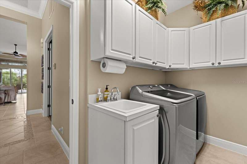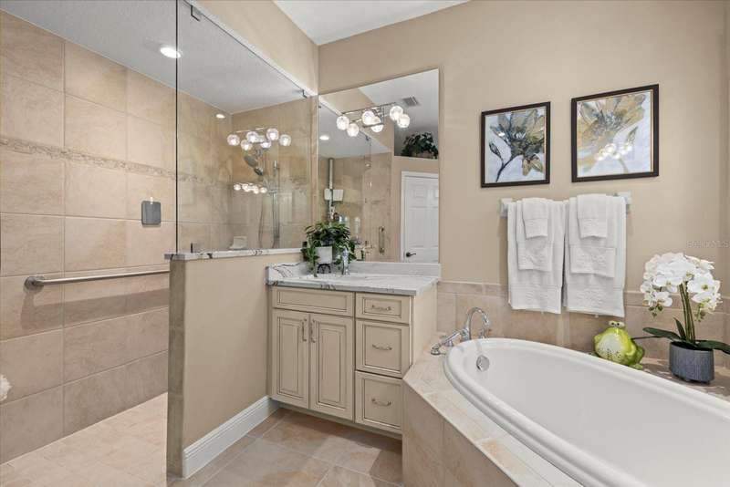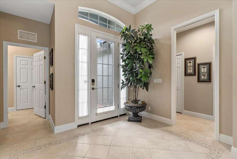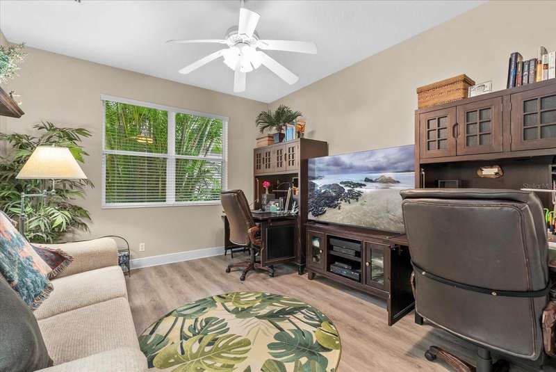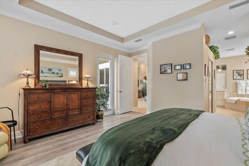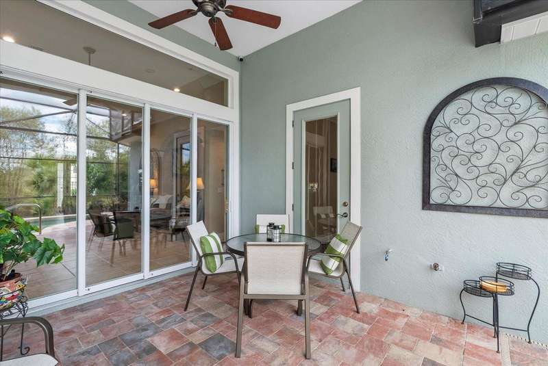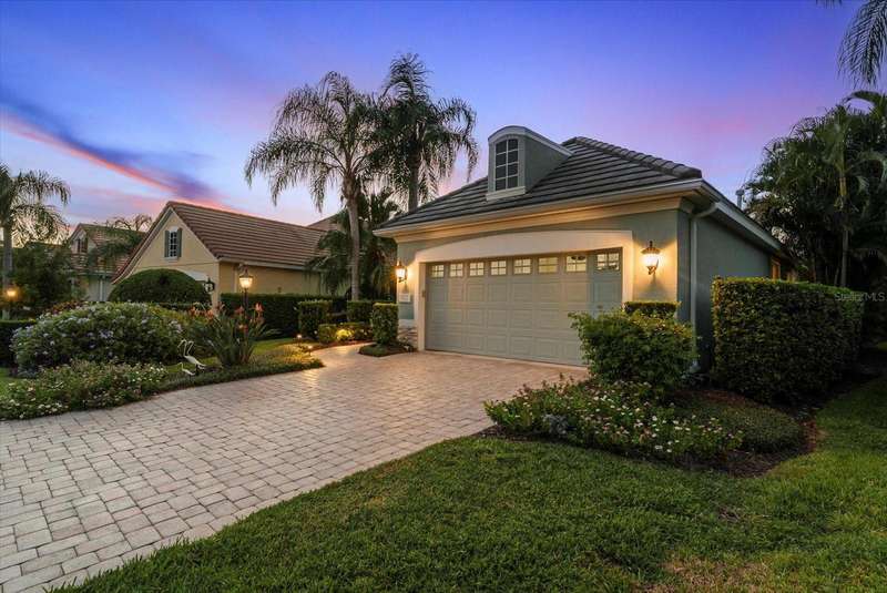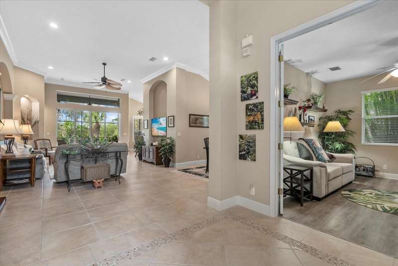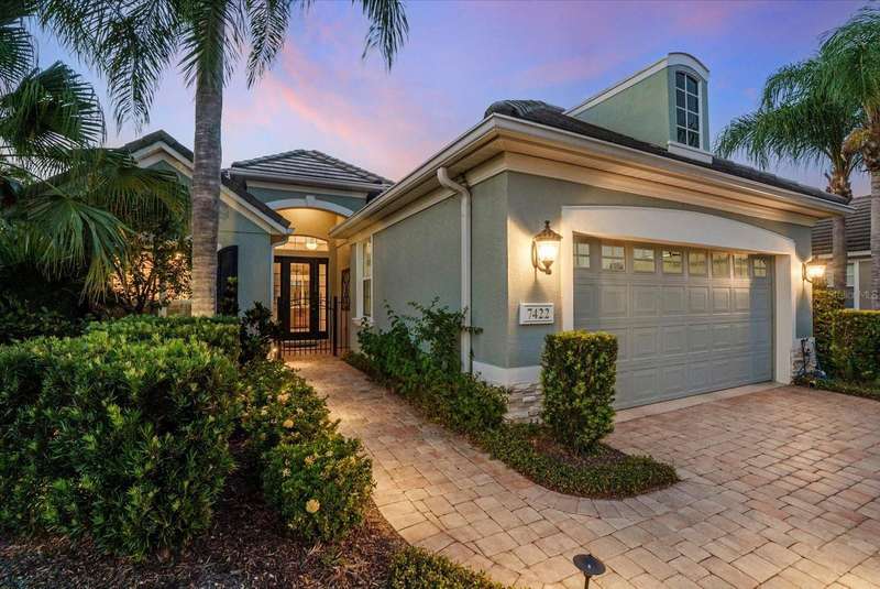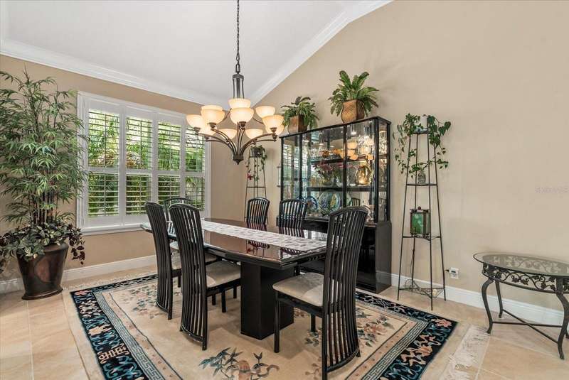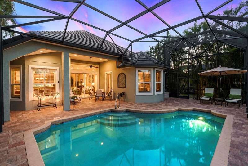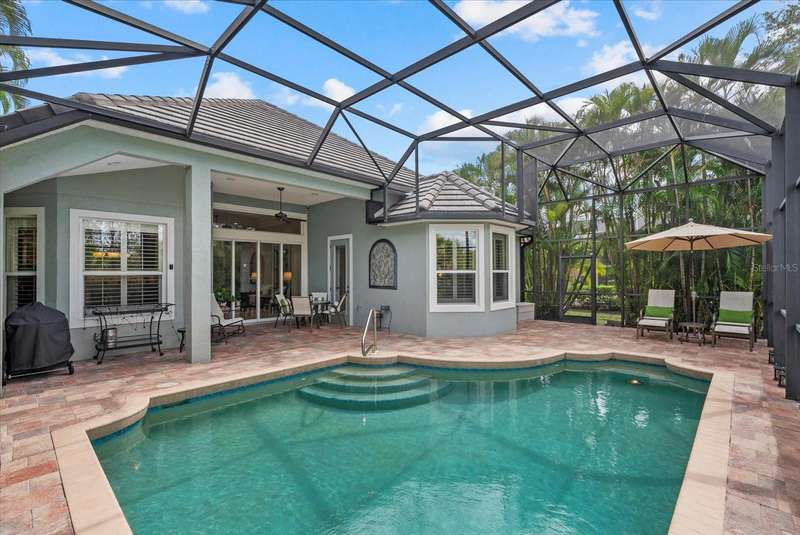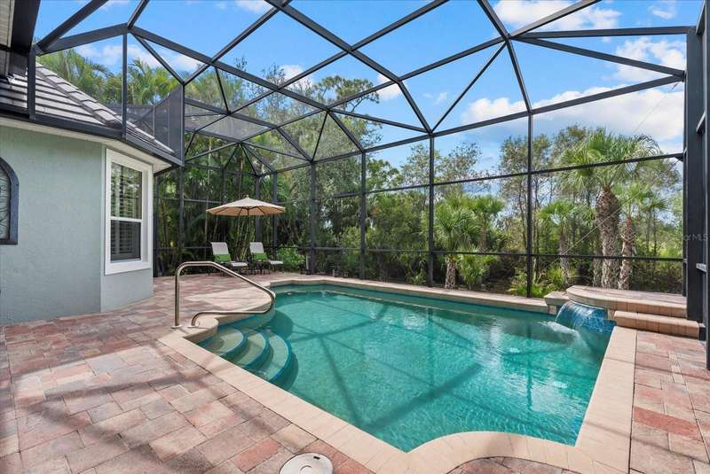 Arrive through the gates of Lakewood Ranch Country Club to this beautifully maintained three-bedroom plus den pool home, perfectly positioned on a private and picturesque preserve lot. Inside, natural light fills the home, highlighting soaring ceilings and elegant finishes throughout. The kitchen boasts rich wood cabinetry, a tile backsplash, granite countertops, and a cozy breakfast nook with views of the sparkling pool. Seamlessly connected to the kitchen, the great room offers a comfortable space for everyday living, while the formal dining room is ideal for hosting and entertaining. A versatile den or office, framed by French glass doors, provides the perfect retreat for work or leisure. The owner’s suite features a tranquil sitting area, dual closets, and an updated bath with split vanities, a soaking tub, and a spacious walk-in shower. Guests will enjoy the generously sized bedrooms with ample storage and convenient access to a second full bath. Outdoor living is elevated by a screened paver lanai, a refreshing pool with a cascading waterfall, and peaceful preserve views, creating a private sanctuary for relaxation and entertaining. This home offers notable upgrades including a brand-new A/C (2024), high-efficiency water heater (2021), double-pane windows and sliders, a spacious two-car garage with additional storage, and the added peace of mind of being located outside of a flood zone. Located in Edenmore, a maintenance-free community, this home offers easy access to optional membership at Lakewood Ranch Country Club featuring championship golf courses, tennis and pickleball courts, a 24-hour fitness center, and a full calendar of social activities. Enjoy the ultimate Florida lifestyle in a prime location near exceptional shopping and dining, Lakewood Ranch Main Street, Waterside, and the world-renowned Gulf beaches.