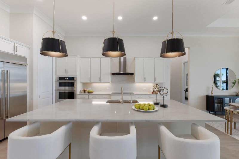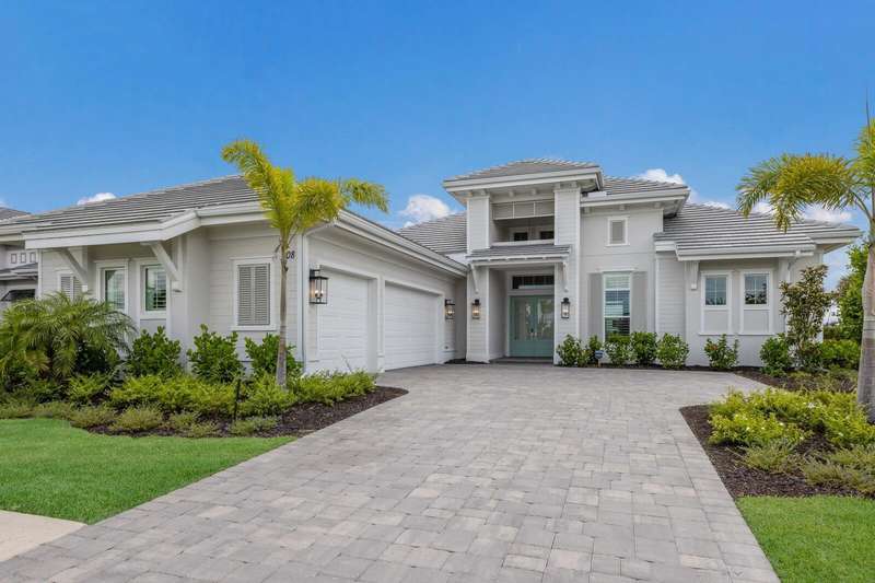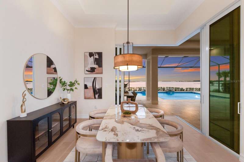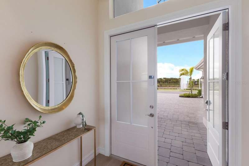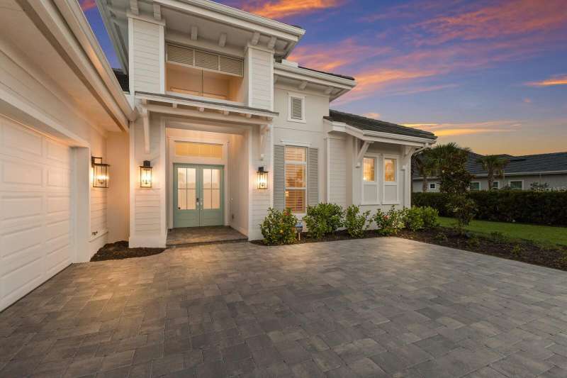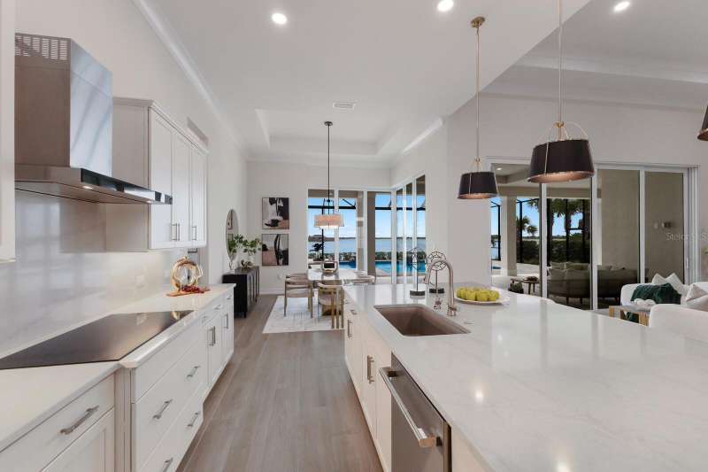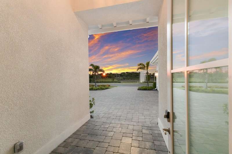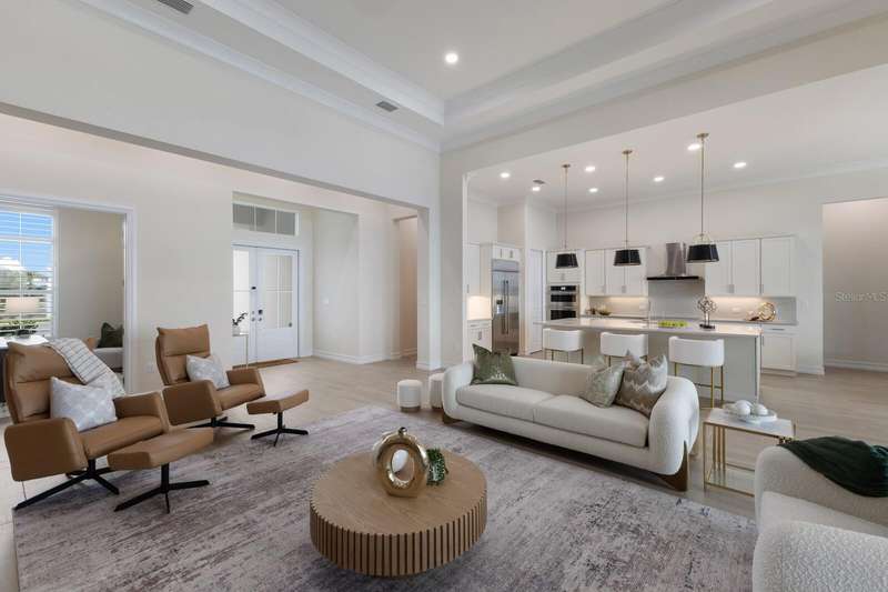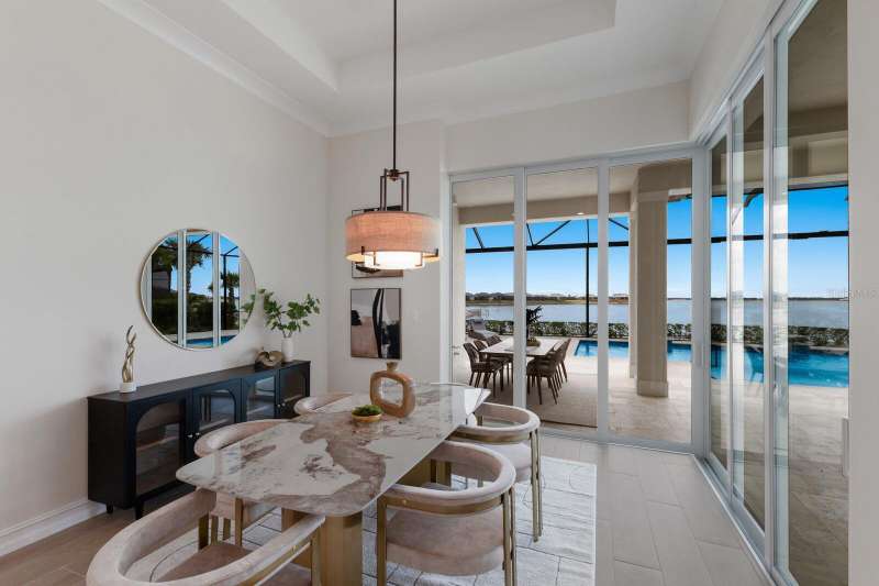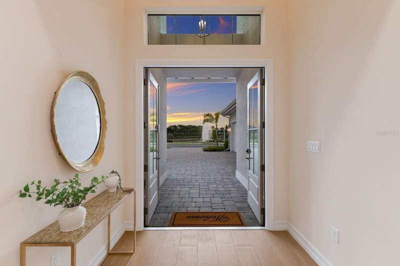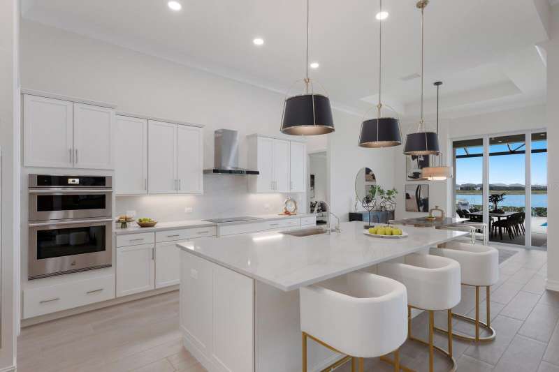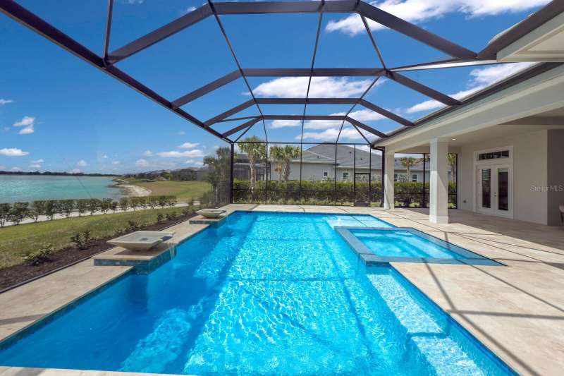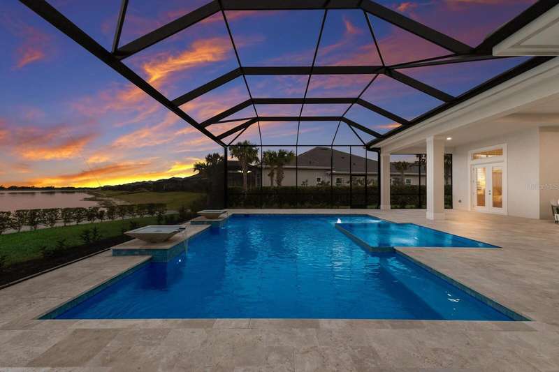 Superior long lake views and exceptional open indoor/outdoor living defines this Madison II residence built in 2024 positioned on a breathtaking southerly waterfront setting in Wild Blue at Lakewood Ranch showcasing generously sized spaces, vibrant clean lines, volume ceilings, and the sought-after far away distance from the new construction activity. A brilliantly planned layout, this three bedroom residence boasts 3,054 square feet of one-story design, a premium lake view, and a vastly extensive outdoor area with abundant open and under cover spaces, travertine deck scape, pre-plumbed for an outdoor kitchen, panoramic screen, and a PebbleTec heated saltwater pool/spa with sun shelf just completed in 2025. Seamlessly connecting this resort-styled lanai to the oversized great room, kitchen, and dining areas are the 10’ IMPACT GLASS doors into an invitingly stylish living area adorned with plank porcelain tile and soaring ceilings. Chefs and guests alike will delight in the beautifully appointed kitchen with stainless steel JennAir appliances, induction cooktop (and also plumbed for natural gas), sprawling quartz counters, oversized island, wood cabinetry, and a walk-in pantry. Relax and unwind in the elegant owner’s retreat positioned on a private wing, offering two oversized walk-in closets, direct lanai access via French doors, and a luxuriously appointed spa-like bath with separate vanities, oversized shower and separate soaking tub. Overnight visitors will be right at home in the two additional guest ensuites, each with their own private full baths. Behind double French doors is a voluminous bonus room, also with its own private full bath offering a multiple array of flex living options. Additionally the residence offers a spacious study/den off the great room with double entry doors and soaring 15’ ceilings. Other highlights of this 4,770 total square foot newly built residence includes a conveniently located half bath off the great room, impact windows/doors/sliders, perfectly sized laundry room with cabinetry and sink, gutters all around home, reverse osmosis in the kitchen, whole home water softener, an oversized three car garage, and even lawn and landscape maintenance is included. Wild Blue will provide its residents a resort-styled 25,000 square foot clubhouse with and an on-site lifestyle director boasting concierge-level amenities to include a fitness center with gym and studio, golf simulator and putting green, dining options for both indoors and out, and a theatre facility. Wild Blue residents also have access to the recently completed hub at Midway Park that offers Wild Blue and Shellstone residents tennis, pickleball, basketball courts, kayak launch, walking trails, dog parks, playground, pro shop, and pavilions. Ideally located in Waterside, renowned for its vibrant Lakewood Ranch lifestyle surrounded by dining, shopping, polo, golf, community events, Waterside Place, UTC Mall, and minutes to SRQ Airport and the beaches of Sarasota.