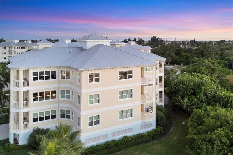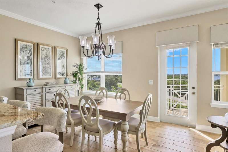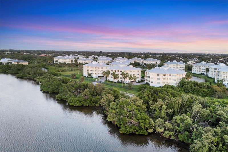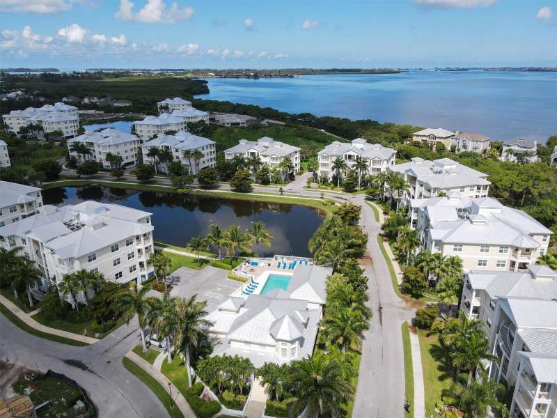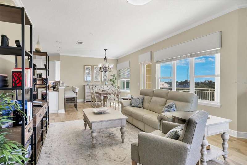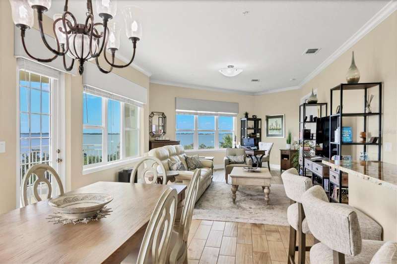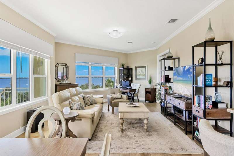 Welcome to Palma Sola Bay Club, an inviting coastal community where style and comfort meet the beauty of the bay. This top-floor residence offers sweeping views of Palma Sola Bay from every room, a backdrop that few homes can claim. A balcony extends the living area outdoors, ideal for morning coffee, evening cocktails, or just observing nature while enjoying the breeze. The kitchen features a large island and breakfast bar, perfect for casual dining or conversation while cooking dinner against the glow of the sunset. Inside, every detail has been thoughtfully chosen, from porcelain tile flooring throughout to custom valances and draperies that frame the view. High ceiling and 8-foot doors throughout with double doors opening to the primary suite, create a sense of arrival and understated grandeur. The suite includes an extended vanity in the bath and a custom-designed walk-in closet system. The split floor plan provides privacy, with a comfortable guest bedroom and full bath on the opposite side. An interior laundry room with upright freezer adds everyday convenience. Professionally decorated and offered turnkey furnished, the home is pristine and move-in ready. Two covered parking spaces and a private storage area are located beneath the building. Palma Sola Bay Club is a gated community offering a pool, clubhouse, bocce courts, putting green, dog park, and a sunset dock with kayak launch. A home where every day feels like a getaway, surrounded by comfort, elegance, and inspiring bay views.