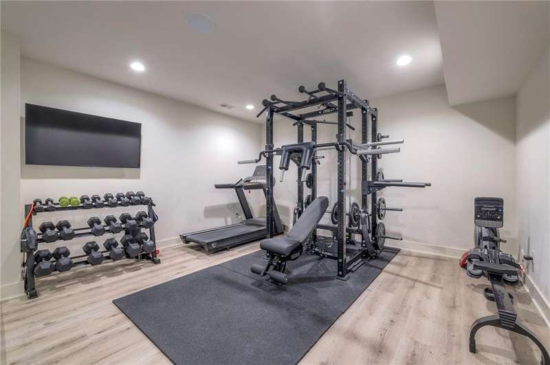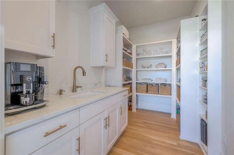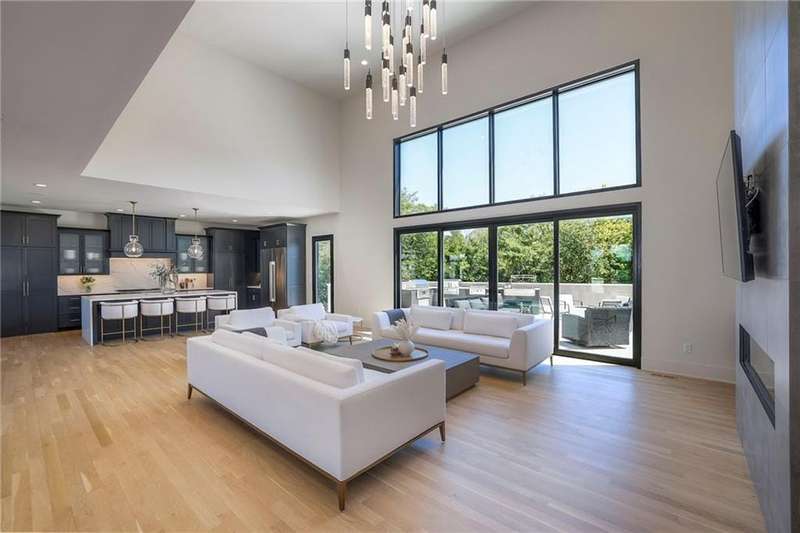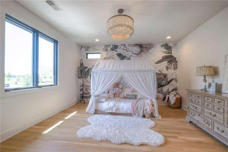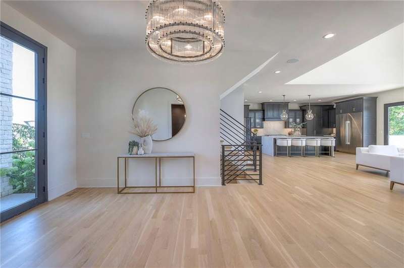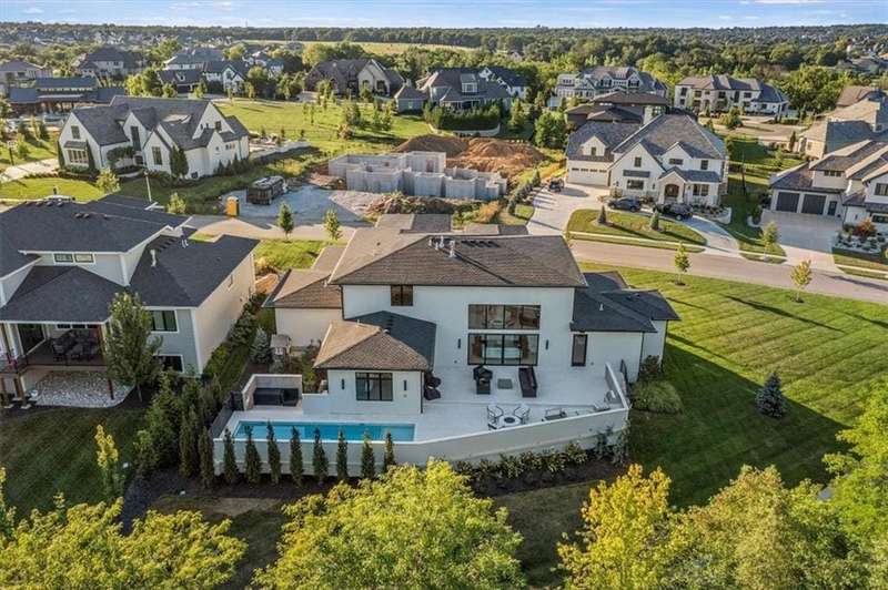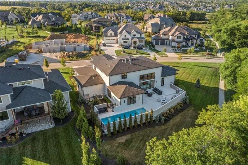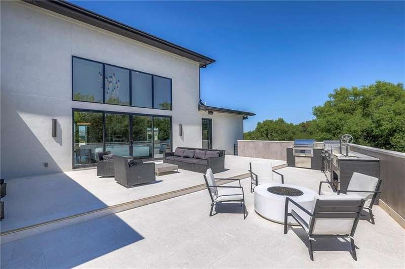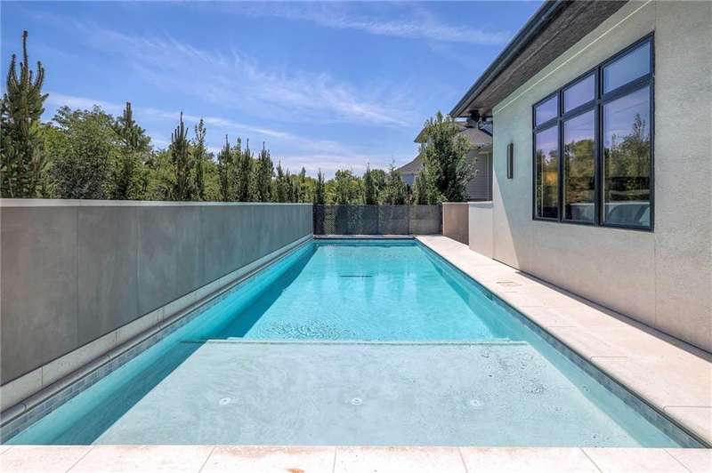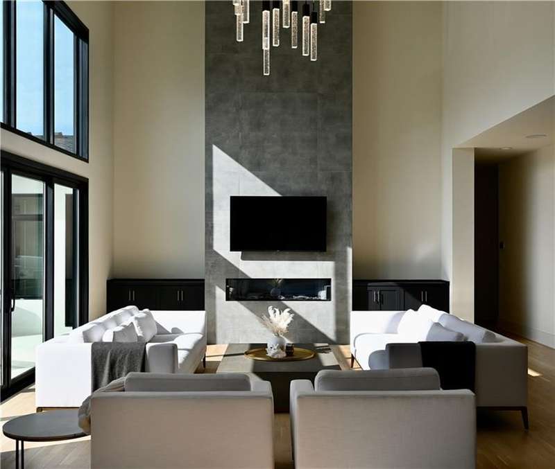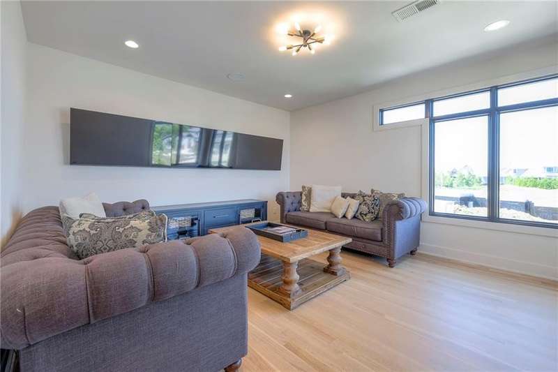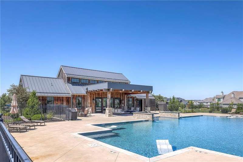 Discover modern elegance in this custom-built 1.5-story home, offering over 5,000 sq. ft. of living space on a private half-acre lot. This residence blends sophisticated design with everyday comfort. Step inside to soaring 20-foot ceilings, a dramatic floor-to-ceiling fireplace, and white oak hardwood floors throughout most of the home. The open main level is filled with natural light and features built-in speakers, Restoration Hardware light fixtures, and a seamless flow into the chefs kitchen. Here youll find LG Signature appliances, quartz countertops, and an oversized walk-in pantry with sink and built-in microwave oven. The main-level primary suite is a retreat of its own with outdoor access, dual walk-in closets, and a spa-like bath with walk-in shower, soaker tub, and modern finishes. A second bedroom with ensuite bath, a dedicated office, large laundry with pet washing station, and an additional powder room complete the first floor. Upstairs offers three oversized secondary bedroomseach with walk-in closets and ensuite bathsplus a versatile loft perfect for a TV room or office. The lower level is designed for wellness and future expansion, featuring a home gym, built-in infrared sauna, daylight/egress windows to add 2 bedrooms, & stubbed plumbing for an additional bath and bar. The garage is a showstopper in itself, with epoxied floors, tinted glass doors, an electric car charging setup, electric heater, battery backup garage door openers, & built-in cabinets. Step outside to your private backyard oasisan entertainers dream. The sport design pool with automatic cover sits alongside a travertine marble tile patio that stays cool underfoot, a gas fire pit, and an outdoor kitchen loaded with a smoker, pizza oven, wood-fire grill, freezer/fridge, and griddle (all never used). Built-in speakers extend outside as well. Additional highlights include a dual-zone HVAC system, pre-wiring for a generator, & outstanding neighborhood amenities.