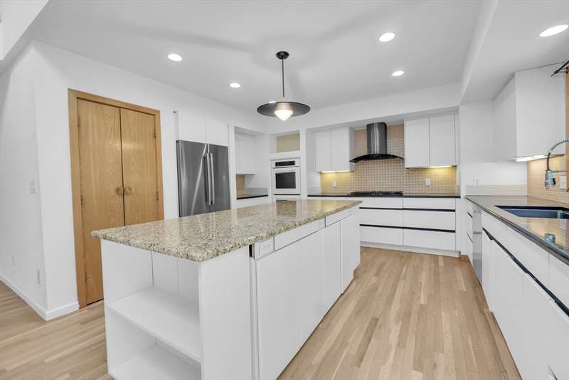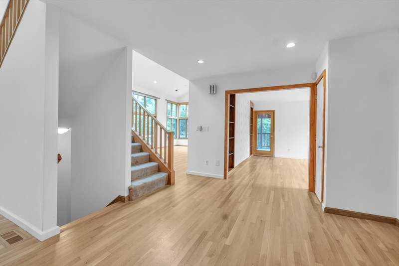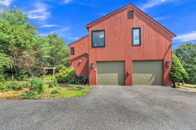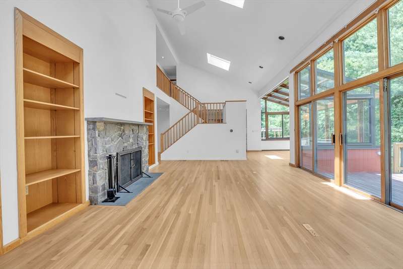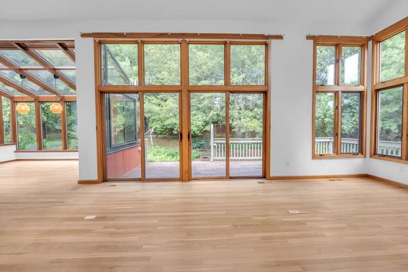 This beautifully maintained contemporary home is privately set back by a winding driveway through vibrant perennial gardens, fruit, & ornamental trees. Enjoy stunning sunset views from both the front porch and rear deck.The open-concept first floor features hardwood floors, cathedral ceilings, skylights, & a chef s kitchen with a granite island, white cabinetry, stainless appliances, 5-burner gas range, funnel vent hood, and walk-in pantry. The kitchen opens up to a new glass atrium, dining room and a spacious great room with built-ins, oversized windows, and a granite fireplace with bluestone mantel. First floor also includes an office/living room, half bath, and laundry. Upstairs, the ensuite primary bedroom offers a large tiled bath and walk-in closet. Two additional bedrooms & a full bath complete the second floor. This exceptional home blends elegance & functionality in a truly tranquil setting-perfect for those who appreciate natural beauty, privacy, & architectural distinction.