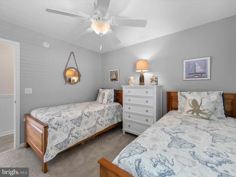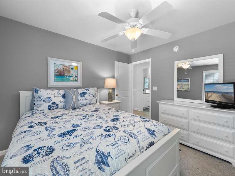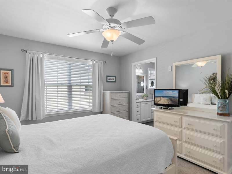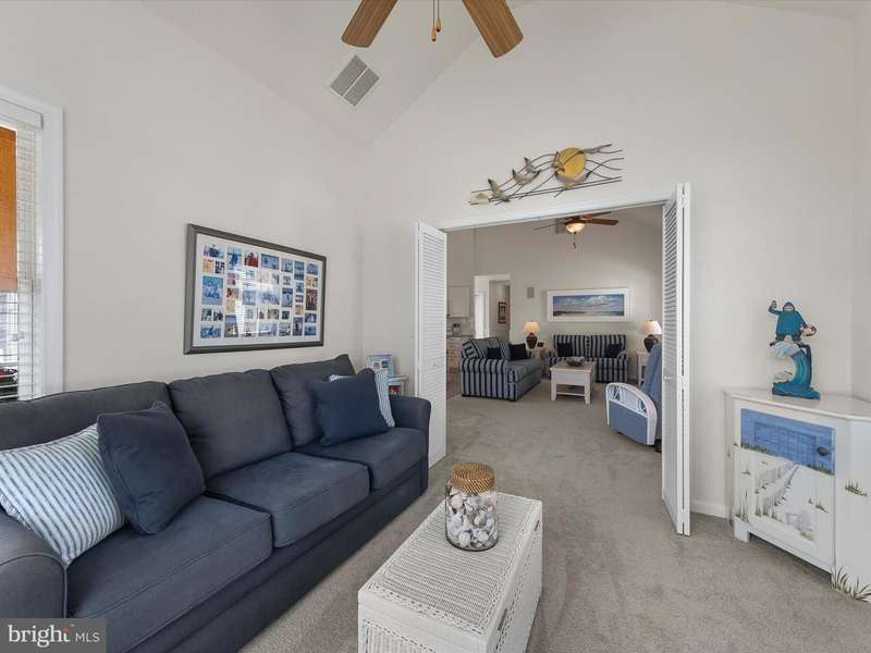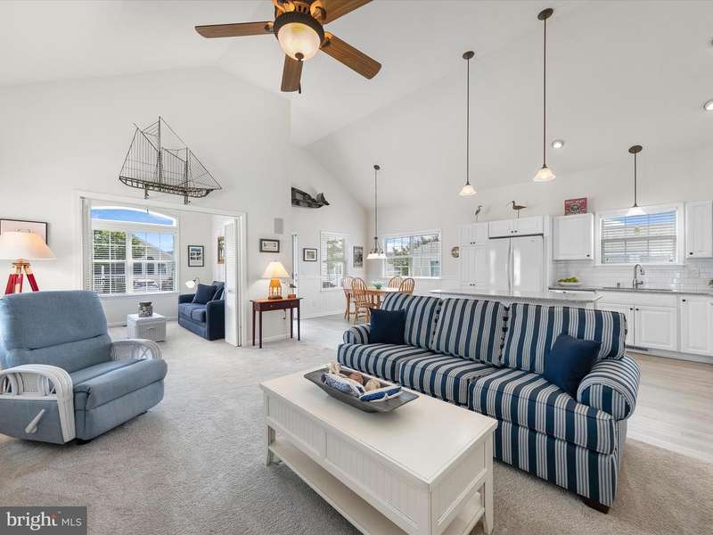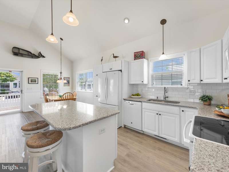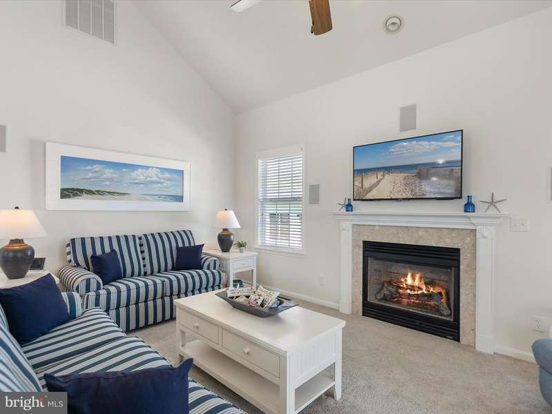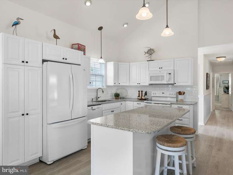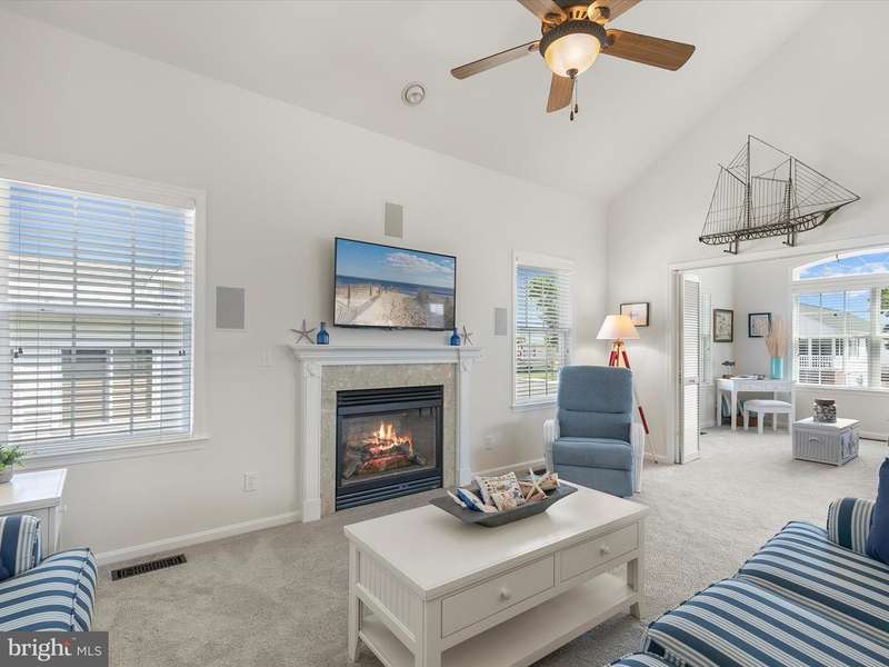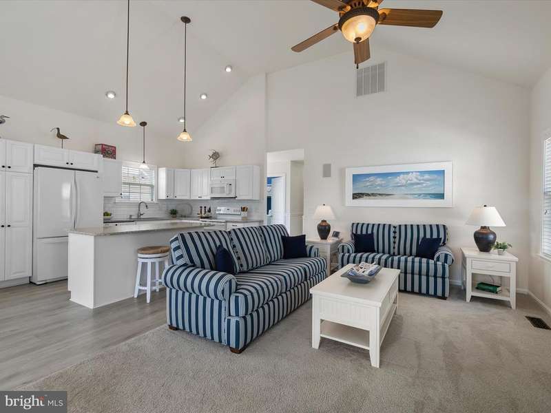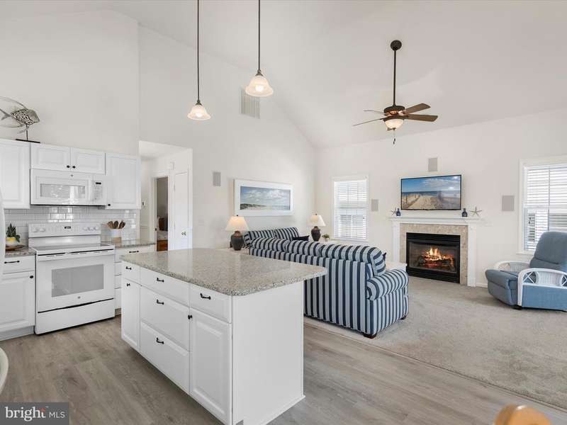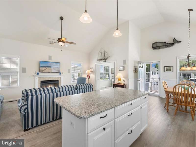 Welcome to this beautifully furnished, 3-bedroom, 2-bath, home located in the sought-after Montego Bay community of Ocean City. From the moment you arrive, you'll be charmed by the home's curb appeal, with its attractive dual gables, classic red brick foundation, and low-maintenance vinyl façade. Beautifully manicured landscaping and a welcoming covered front porch invite you to relax and enjoy the coastal breeze. Inside, the bright and airy open-concept layout features soaring vaulted ceilings that enhance the sense of space and light. The kitchen is a true highlight, with crisp white cabinetry, white appliances, Quartz countertops, a stylish subway tile backsplash, and a central island illuminated by chic pendant lighting-ideal for casual meals or entertaining guests. The adjoining great room is centered around a cozy gas fireplace and features a built-in 5-speaker audio surround system for the ultimate movie night experience. A separate sunroom with double French doors offers a private retreat for guests or a quiet place to unwind. The spacious primary suite includes an en-suite bath with a stall shower accented by floor-to-ceiling tile. Two additional bedrooms and a second full bath offer comfortable accommodations, and a separate laundry room adds everyday convenience. Outdoor features include a private outside shower-perfect after a day at the beach-and a storage shed for all your gear. Whether you're looking for a full-time residence, a beach retreat, or an investment opportunity, this turn-key, well-maintained home in Montego Bay offers the perfect blend of comfort, style, and location.