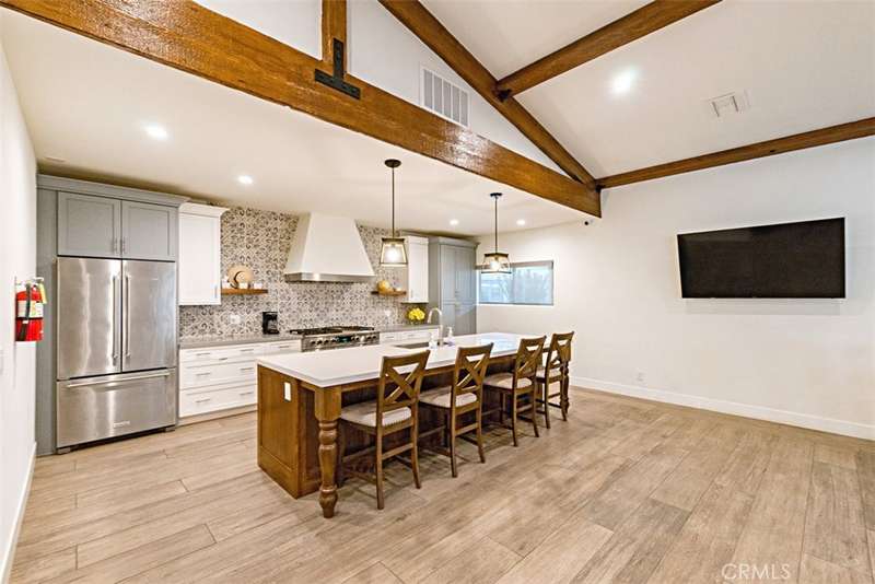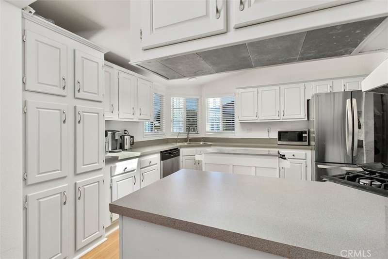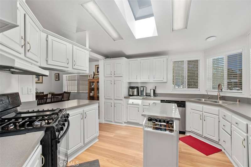 A stunning remodeled island kitchen serves as the heart of the home, spacious, stylish, and made for entertaining, boasting white cabinetry, quartz stone countertops, stainless steel appliances, a skylight, and a brand-new dishwasher and brand new wood-style tile flooring adds warmth and character.