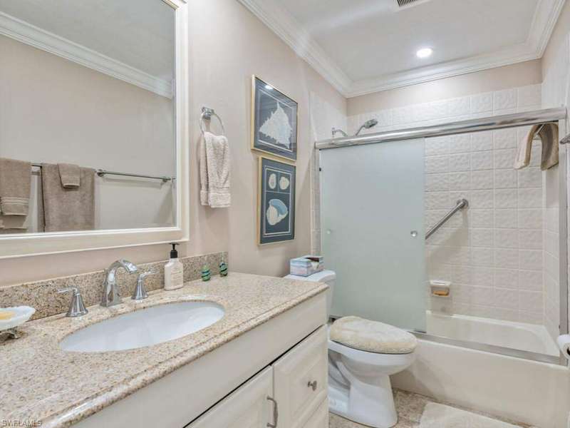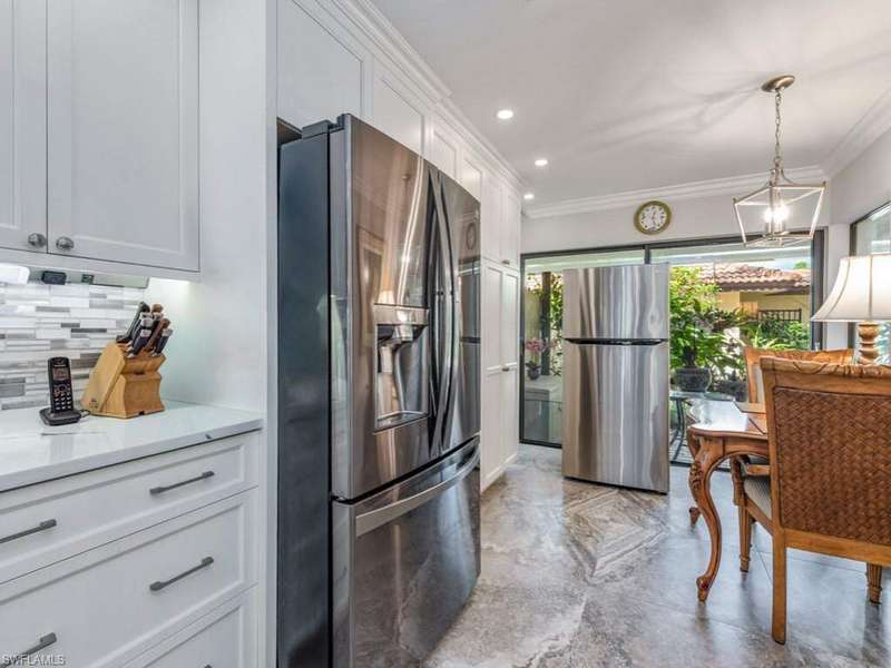 Step into elegance and comfort with this beautifully updated residence. From the moment you enter the serene courtyard, you're welcomed by lush professional landscaping and a stunning three-tiered fountain - setting the tone for the luxury within. Inside, the deluxe gourmet kitchen is a true showpiece. Enjoy abundant soft-close cabinetry with custom circular corner shelves, light quartz countertops with bar seating, and a stylish tile backsplash. Fingerprint-resistant stainless-steel appliances, including a triple-shelf convection oven and dishwasher, shine under modern LED lighting. The kitchen's cozy breakfast nook overlooks the peaceful courtyard, creating the perfect spot for your morning coffee. The open-concept layout flows seamlessly into the spacious great room, complete with a designer wet bar and a striking staircase leading to the loft-style office. Adjacent to the loft is a generous walk-in attic, offering exceptional storage space. Retreat to the primary suite, featuring a remodeled bath with a sleek, doorless shower and dual walk-in closets. Both bathrooms showcase elevated vanities and comfort-height toilets for a spa-like experience. Relax on the screened lanai with electric hurricane shutters, while taking in the breathtaking golf course views - the ideal backdrop for entertaining or quiet evenings. Perfectly situated just minutes from downtown Naples and pristine Gulf beaches, this home combines refined design, modern comfort, and an unbeatable location.