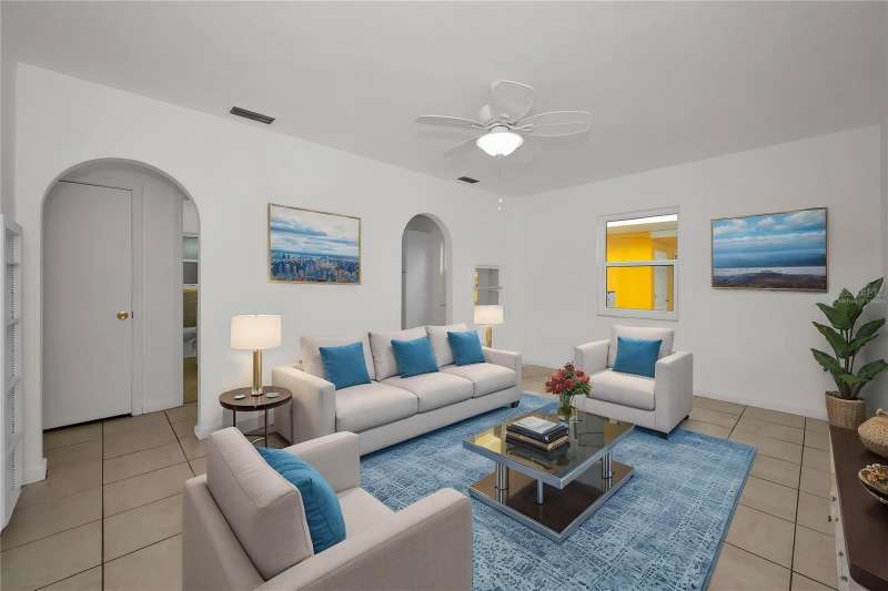 One or more photo(s) has been virtually staged. Step back in time with this Mid-Century Bungalow, perfectly nestled in the bustling heart of the City of Clearwater. Vintage, craftsman style 2 bedroom, 1 bath Florida home with authentic design elements along with an oversized, detached 1 car garage and separate storage/workshop in the convenient and desirable subdivision of Boulevard Heights. Situated in a non-flood zone, unaffected by the recent storms, yet still only minutes to downtown Clearwater, top rated Schools, restaurants, shopping and the Pinellas Beach’s making it an ideal location. This Vintage 2-bedroom home with a large, detached garage features beautiful tile flooring throughout, NEW Windows and Doors, New Interior Paint throughout, Upgraded Kitchen with wood shaker cabinets along with numerous other value-added upgrades makes for a great starter or second home and IDEAL Investment property. With No Rental Minimum Lease Period, this residence can be a wonderful money maker! Enter the home into a large, sun filled living area with classical coved ceilings and arched entry’s – enjoy the ample natural lighting. The living room is adjacent to the efficient kitchen which has been fully updated and with ample cabinet and counter space! The kitchen connects to a wonderful, sunny Family Room which is the perfect place to get away without going away! This Family room has a door to the large backyard and detached garage and storage room / workshop. Both bedrooms are generous in size and share a super clean full bath. The detached garage has a private driveway and an adjoining carport offering plenty of space for parking. Crest Lake Park is one block away with a full walking trail, lake, Playgrounds, and more and the City of Clearwater Golf Course is within walking distance. Local shops and restaurants are all within proximity. Enjoy this conveniently located neighborhood with so much to enjoy and centrally located to everything. Schedule your showing today!