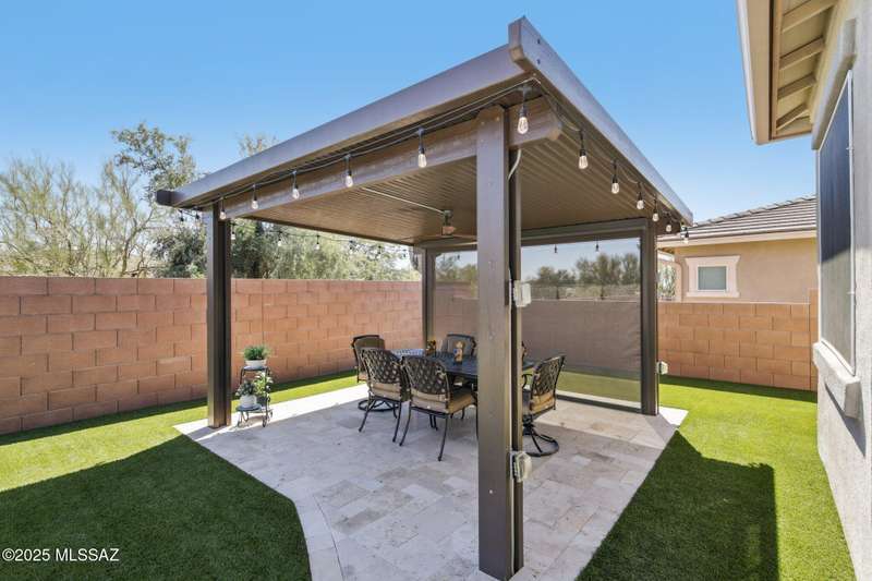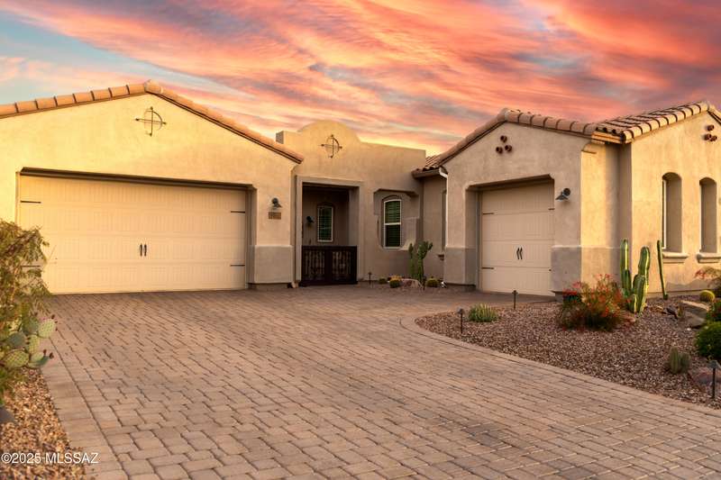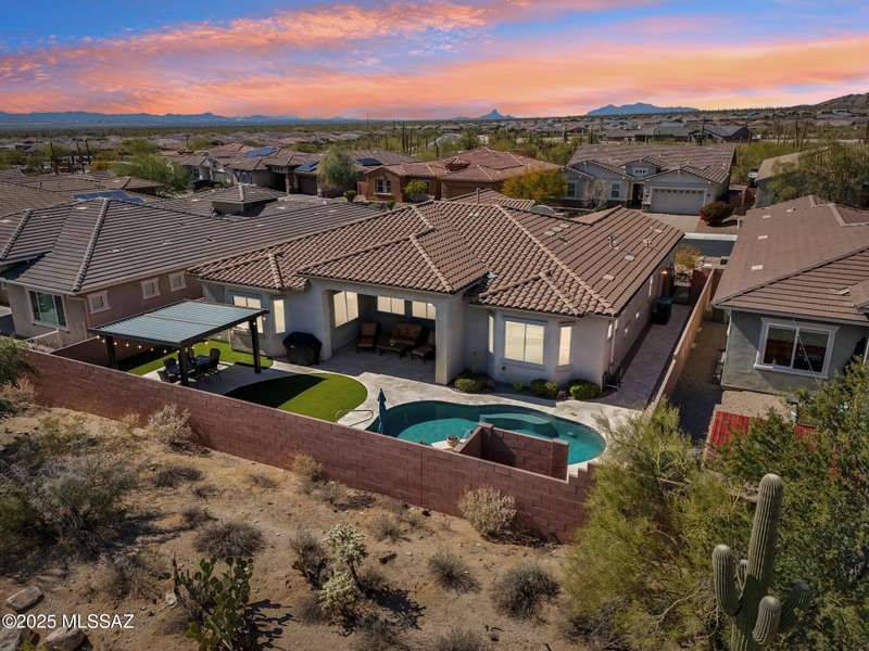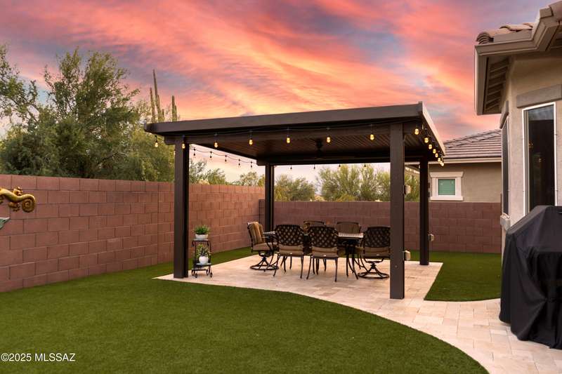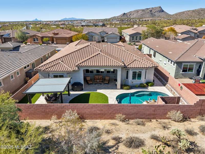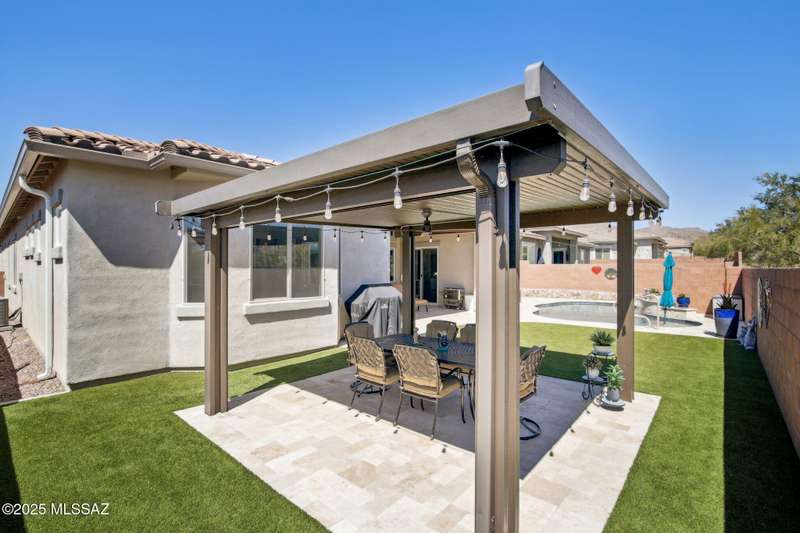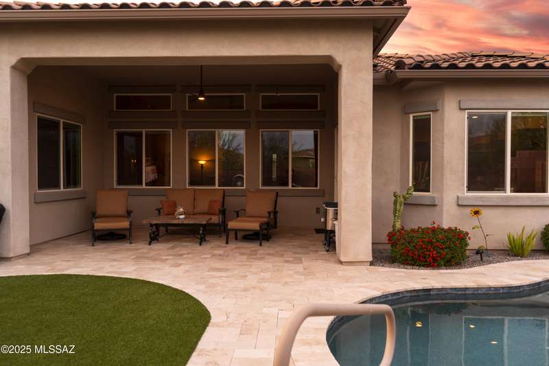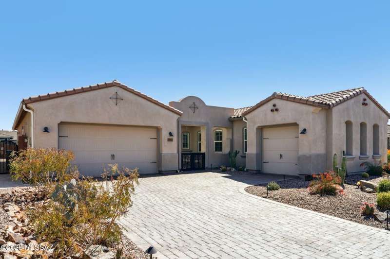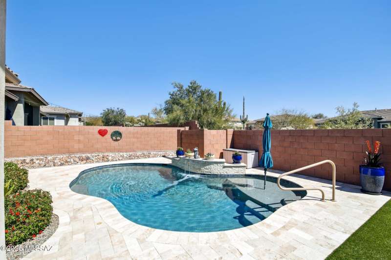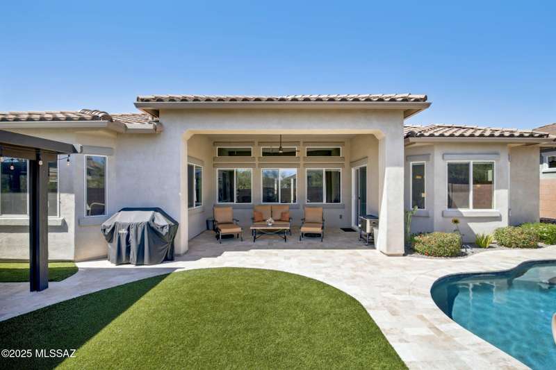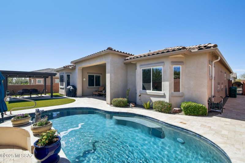 MAJOR PRICE REDUCTION. Cool off in style this summer in this stunning home in gated Golden Barrel at Dove Mountain. The resort-style backyard is built for Arizona living--sparkling pool, covered patio, travertine pavers, artificial turf, Ramada with sun shade, and serene desert views. Inside, enjoy an open great room layout with a chef's kitchen featuring a gas range, double ovens, granite counters, and walk-in pantry. Includes 3 bedrooms, 2.5 baths, and a den with custom French doors. The luxurious primary suite offers dual vanities, a large walk-in shower, and custom closet. 3-car garage, tile floors, and upscale touches throughout. The quiet cul-de-sac location is just steps from trails, a dog park, tot lot, volleyball, and more--everything you need for a perfect summer.