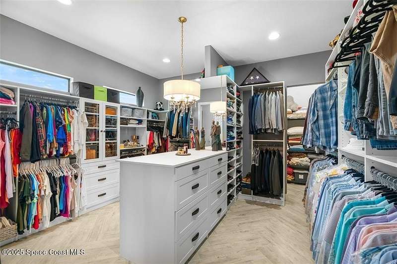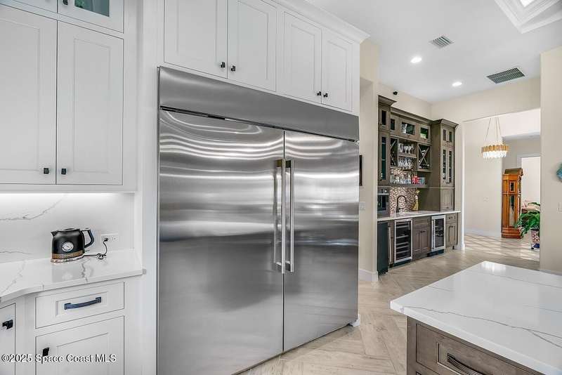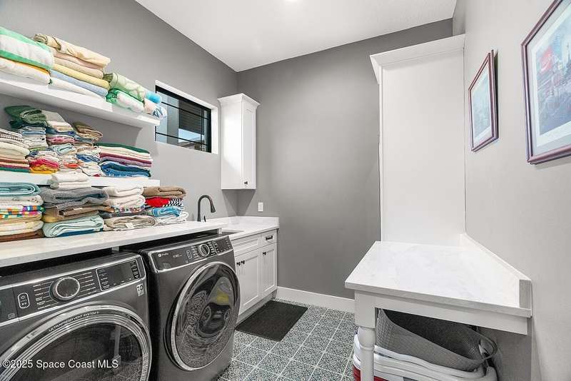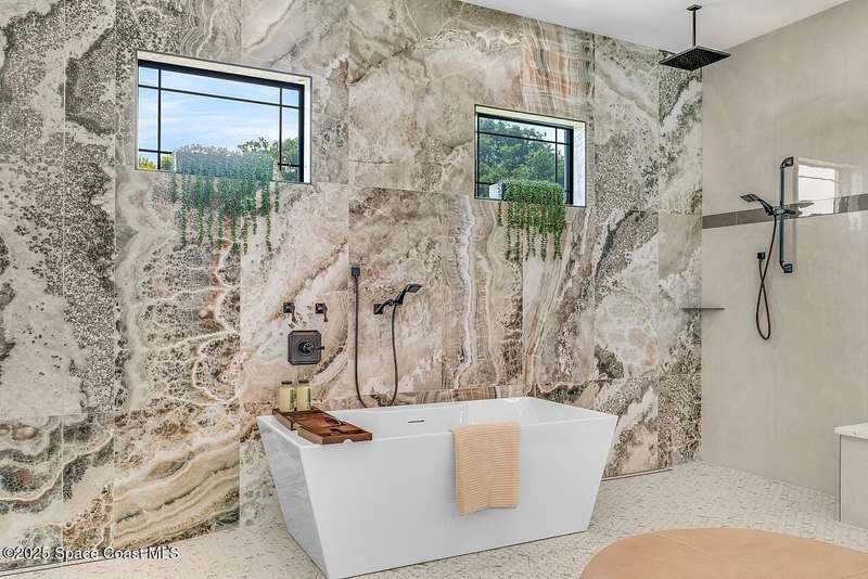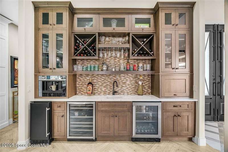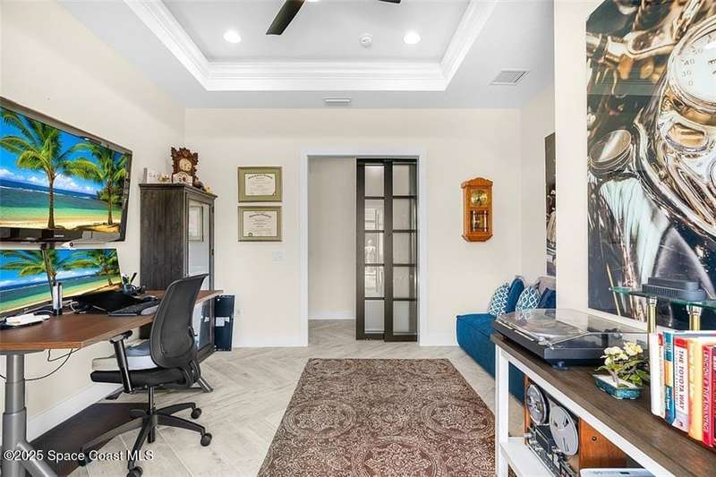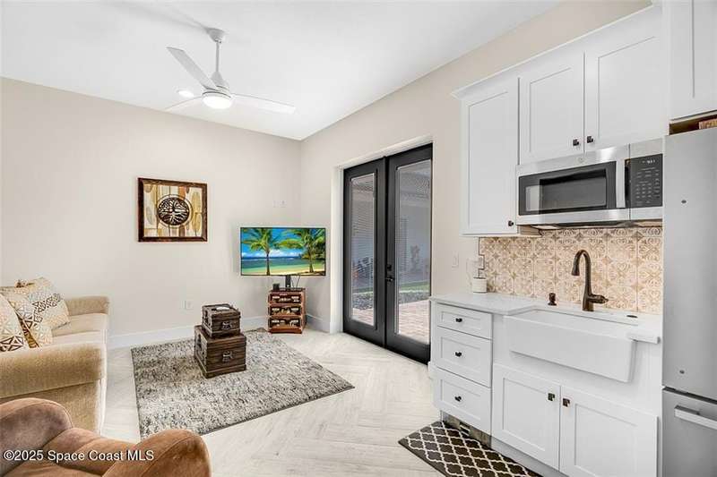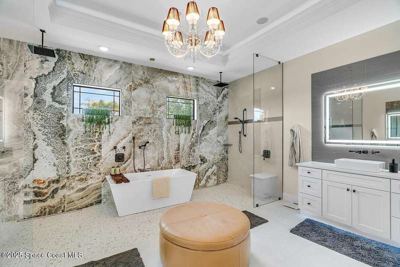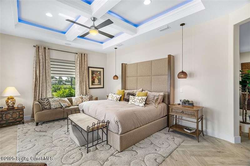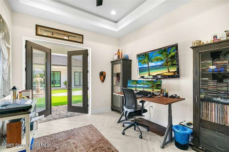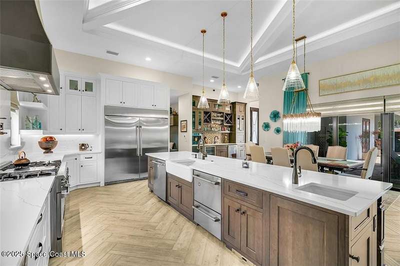 West Indies-style estate on 1.61 acres in Merritt Island! This custom home offers a chef's kitchen with 12-ft island, hidden pantry, wet bar, and luxury finishes. Main house has the primary suite and a private in-law suite with a separate 2-bedroom casita and game room. Solar heated saltwater pool and spa, EV charger, 3-car garage, high impact windows, trey ceilings, and three zoned Sonos audio system. Partial Banana River views, smart lighting, and expansive courtyard create the perfect indoor-outdoor lifestyle. Ideal for entertaining or multigenerational living. RMSZAPP/SUB2ERR.