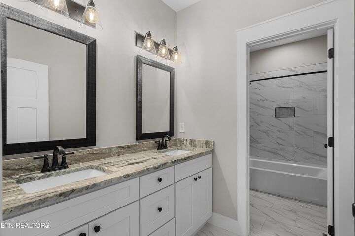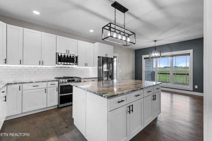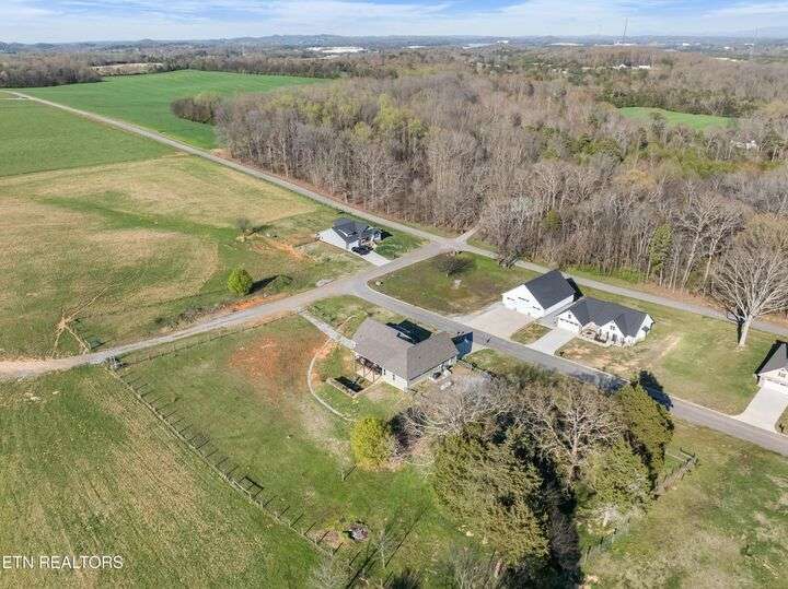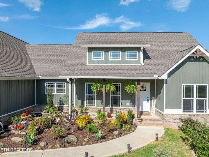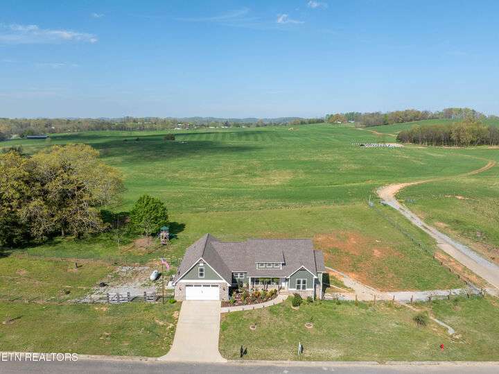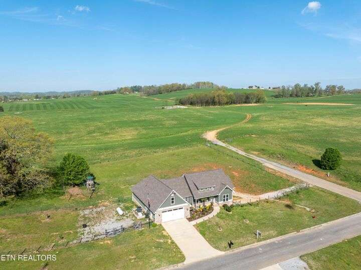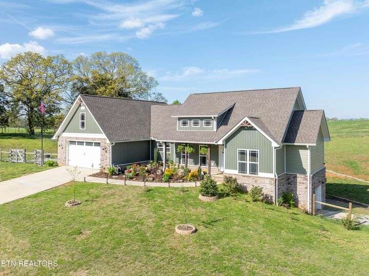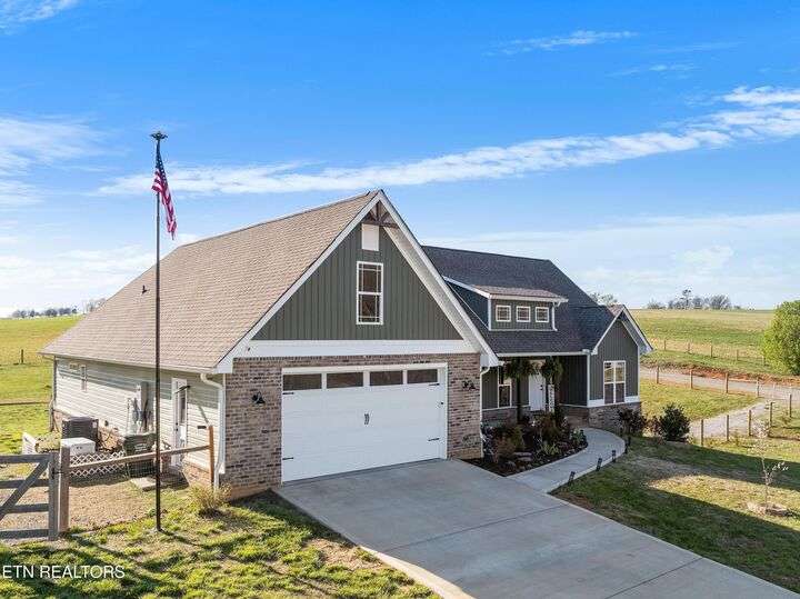 Luxury Living Without the HOA Fees - Craftsman Basement Rancher on a Double Lot Set on a desirable double lot totaling 1.63 acres, this 4 bedroom, 3 bathroom, 3254 sq ft, Craftsman-style basement rancher offers timeless design, modern convenience, and unmatched space—all in the sought-after Lakeside Meadows community and with no HOA fees. Eligible buyers may also take advantage of an assumable VA loan at just 4.65%—a valuable opportunity in today's market. The open-concept main level is ideal for both everyday living and entertaining. A tray ceiling and striking floor-to-ceiling brick gas fireplace with shiplap detail provide a warm yet elegant focal point in the living room. Just off the foyer, a versatile flex room can serve as a home office, dining room, or study. The gourmet kitchen shines with stainless steel appliances, a gas range, soft-close cabinetry, and an oversized marble-granite island that offers abundant workspace, storage, and seating. The Owner's Suite is a relaxing retreat, complete with a tray ceiling, spacious walk-in closet, and spa-inspired ensuite featuring dual vanities, a tiled shower, and sleek Euro glass door. Two additional bedrooms—each with walk-in closets—share a well-appointed bathroom with dual vanities and tiled tub/shower combo. A laundry room with built-in cabinetry, utility sink, and included washer and dryer makes daily living easy. Step outside to the expansive covered porch and enjoy wide-open countryside views with no backyard neighbors—perfect for quiet mornings, sunset evenings, or hosting friends. The finished basement adds over 1,200 sq ft of flexible space, ideal for a media room, in-law suite, or multi-generational living. Built on a poured-wall foundation, this level also includes a covered patio for outdoor enjoyment. Additional highlights include a whole-home Generac generator, security system, two-car main-level garage, plus a separate one-car basement garage—great for a workshop, extra storage, or a boat. Recent interior updates, including fresh paint, enhance the move-in-ready appeal. With 1.63 acres, the double lot offers extraordinary opportunities—whether for added privacy, a guest home, large garage, or future plans. Located just minutes from Tellico Lake, golf, marinas, shopping, and restaurants—with easy access to I-75, Maryville, Turkey Creek, and McGhee Tyson Airport—this home blends peaceful living with everyday convenience. Schedule your private showing today and experience the value of a double lot in East Tennessee.
