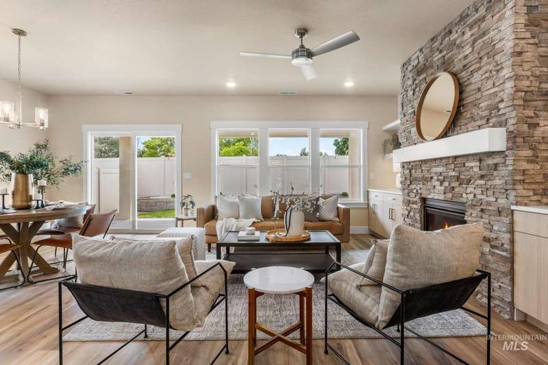 HUGE PRICE DROP! This charming 3-bedroom, 2-bath home offers a perfect blend of style and function. The open kitchen features quartz countertops, a gas range, and luxury vinyl plank flooring. The living area is warm and welcoming, complete with a cozy fireplace and custom built-in cabinetry. The guest bathroom, situated between two spacious guest bedrooms, includes quartz countertops, a tiled shower/bath, and upscale tile floors. The private primary suite provides a peaceful retreat with dual vanities, a fully tiled step-in shower, quartz countertops, and luxury tile floors. Large windows fill the home with natural light, highlighting designer finishes and beautiful trim throughout. Conveniently located near the freeway, Albertsons Marketplace, the YMCA, and Meridian’s bustling shopping and dining area! Plus, enjoy low-maintenance living with HOA-provided front and back lawn care.