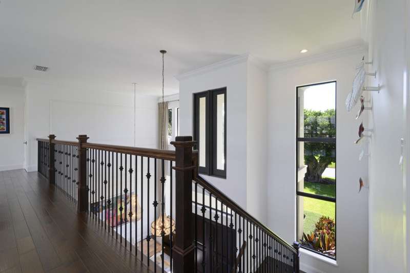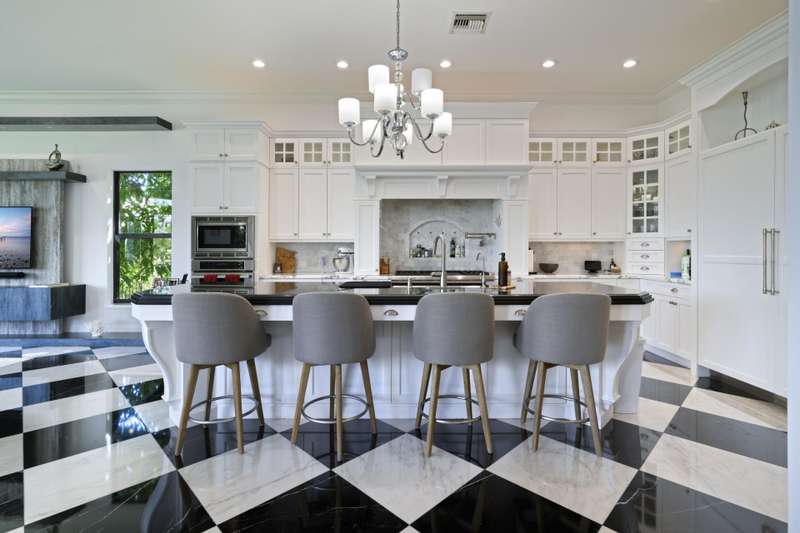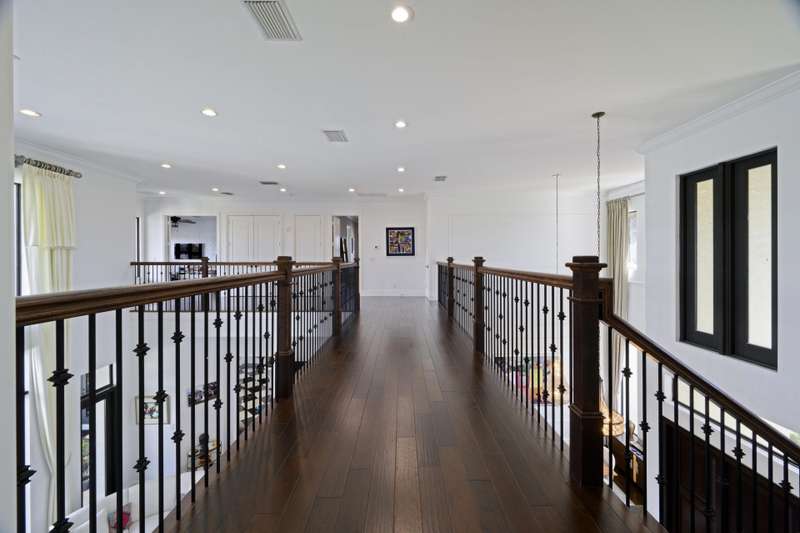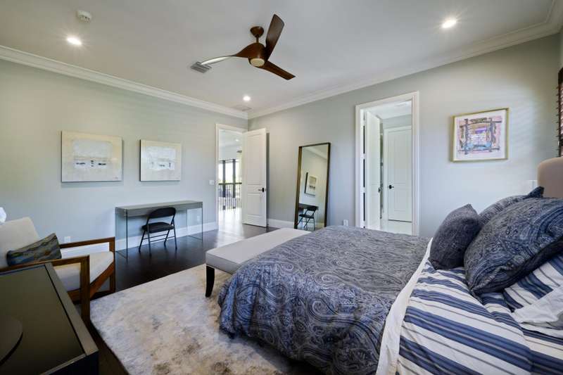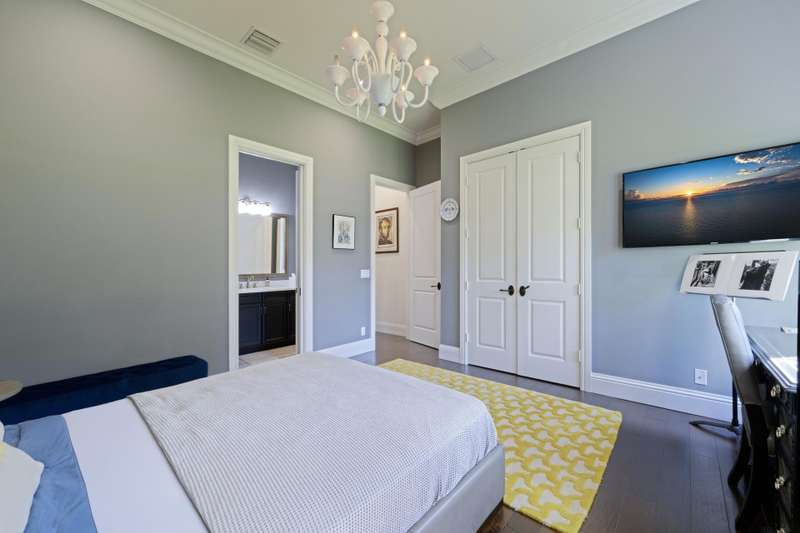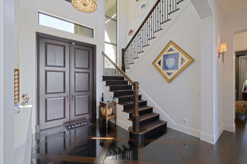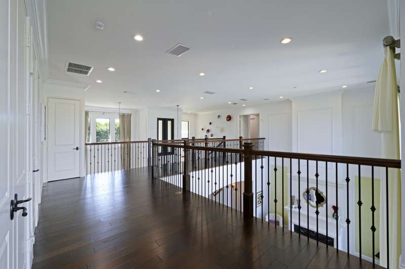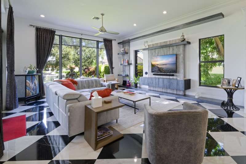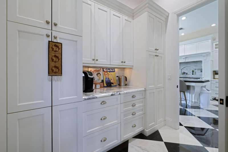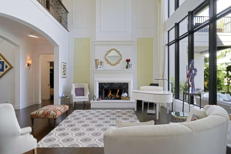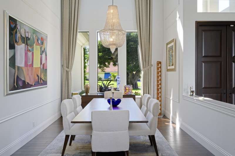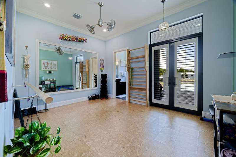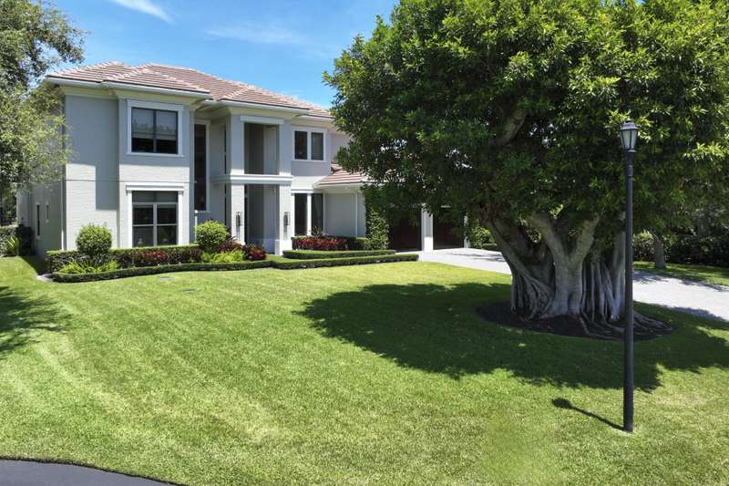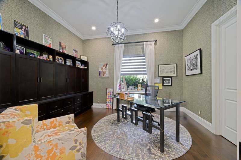 Discover timeless elegance in this stunning two-story waterfront estate located in the gated community of Portage Landing. Designed for both comfort and sophistication, this home offers 6 bedrooms (office and gym options) 4.5 baths, and exquisite craftsmanship throughout.Enter to soaring 22 ceilings, cast stone fireplace, and custom millwork. The chefs kitchen features marble floors, Thermador professional appliances, dual ovens, gas range with griddle and pot filler, butlers pantry, and granite wet bar with wine cooler. Expansive formal and casual living spaces are enhanced with marble inlays, engineered walnut wood flooring, custom drapery, and designer chandeliers--all of which convey. Retreat to the luxurious primary suite with private balcony, custom closets, and spa-like