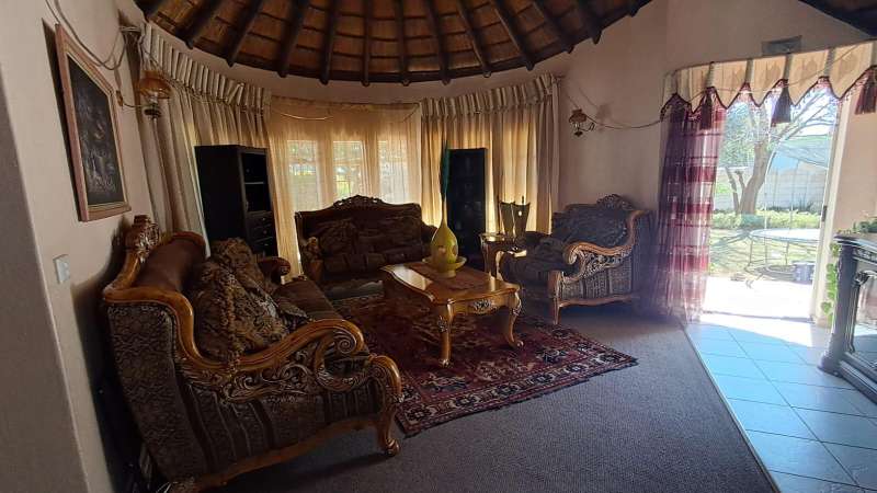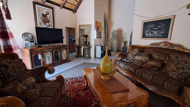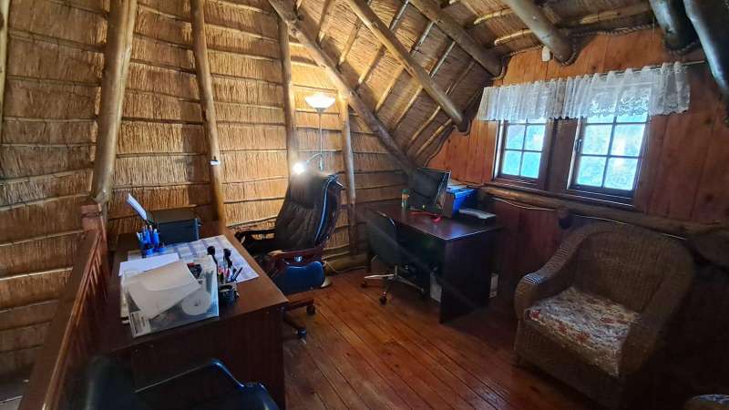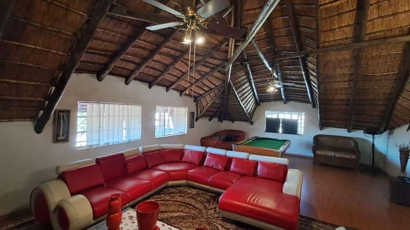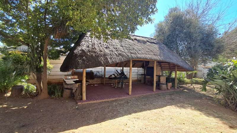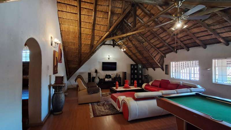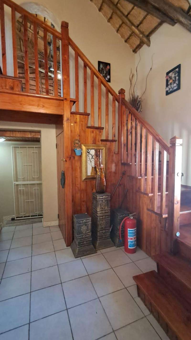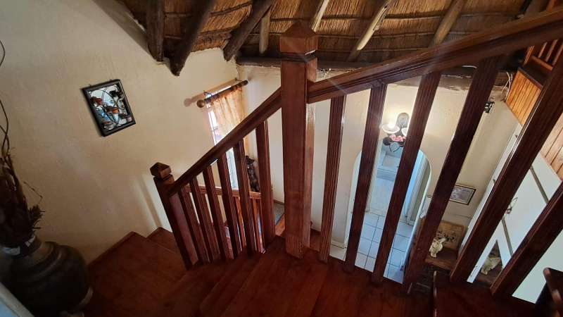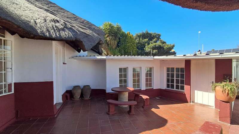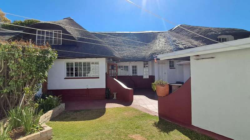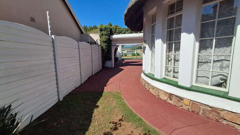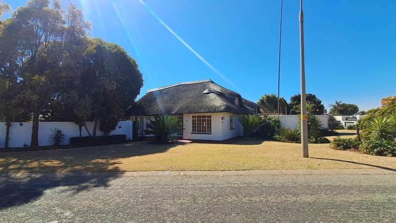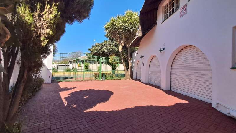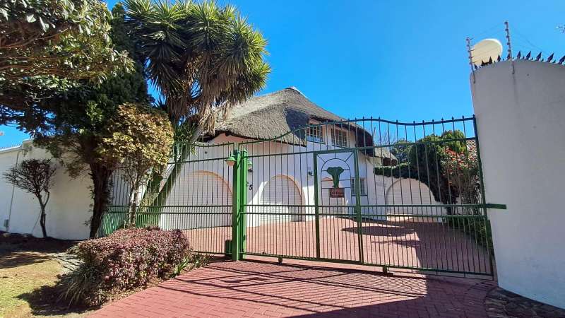 Inside the boomed off area of Randhart, on the corner stands this delightful family home full of character and charm with a thatched roof. Around the corner is the automated gate to the secured parking area. Plenty of space for parking of numerous cars, and children to play freely on the lawns. Enter the house through the reception area, and move to the formal lounge. Spacious dining room with lovely embossed ceilings. Guest toilet is available. The kitchen is neat with lots of packing space, granite tops, glass top stove. Separate scullery that leads to the outside courtyard area. Outside staff toilet. There are three spacious bedrooms, but the main bedroom with its special bay window shape gives you added space for creating dreamy times. The main en-suite bathroom has a corner bath-tub. The central bathroom includes a shower, too. Upstairs the wooden staircase, on the landing is the study. There is a large 55 sqm family/ all purpose room. This area can also be used as a fourth bedroom with windows for warmth and serenity. The automated garage offers three door entrance and ample space for cars to be parked. Additional features on the outside is the thatched lapa with a built in braai, irrigation system for this well established garden. For security there is electric fencing, burglar radio is in place, the Estate's security company offers their services. There is a levy fee for these services. Fiber is available. Contact me for a viewing appointment and to discuss the price.