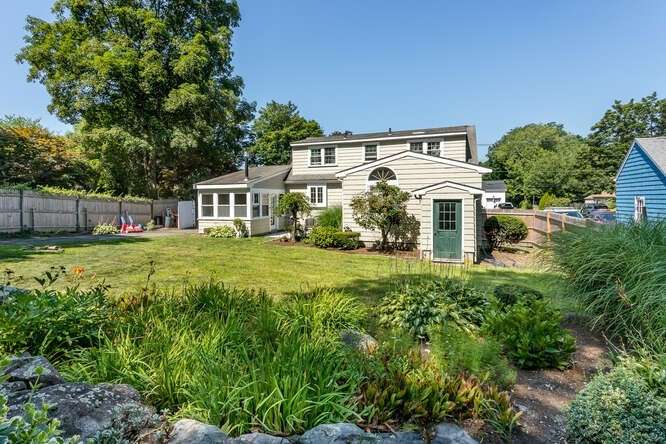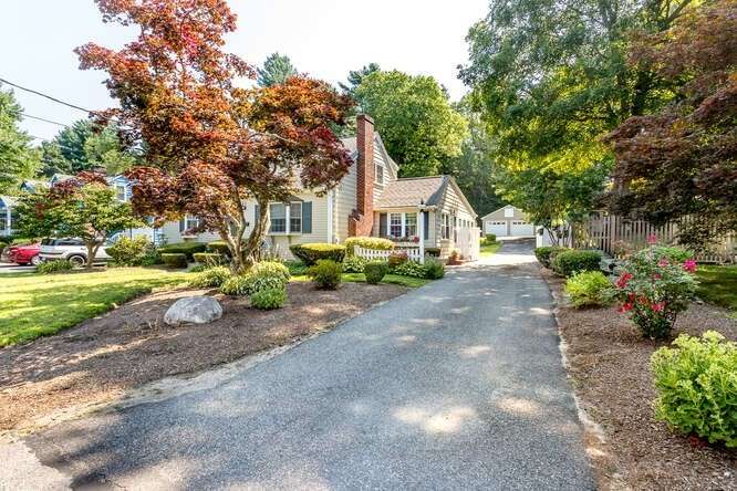 Expanded Cape offering 3 beds, 2.5 baths, and 2,100 sq ft on a beautifully landscaped 0.57-acre lot. Features include hardwood floors, 5-zones of baseboard heat, and 200-amp electric. The inviting living room has a wood-burning stove and exposed beams. The spacious kitchen offers solid wood cabinetry, center island, and stainless appliances, opening to a vaulted bonus room with great flow for entertaining. A sun-filled 3-season room with wood stove provides year-round comfort. The first-floor primary suite includes vaulted ceilings, a sliding barn door, and updated bath. Two oversized bedrooms and a full bath complete the second floor. Exterior features include a detached 2-car garage, fenced yard, and shed. Convenient to schools, train, shopping, and highways this home blends charm, space, and location.