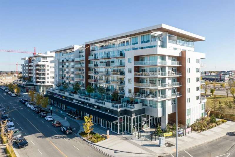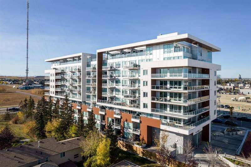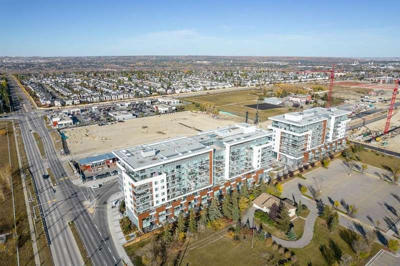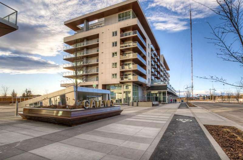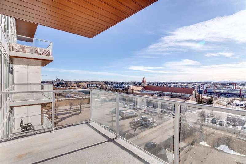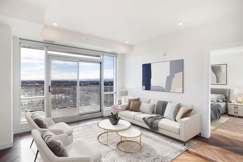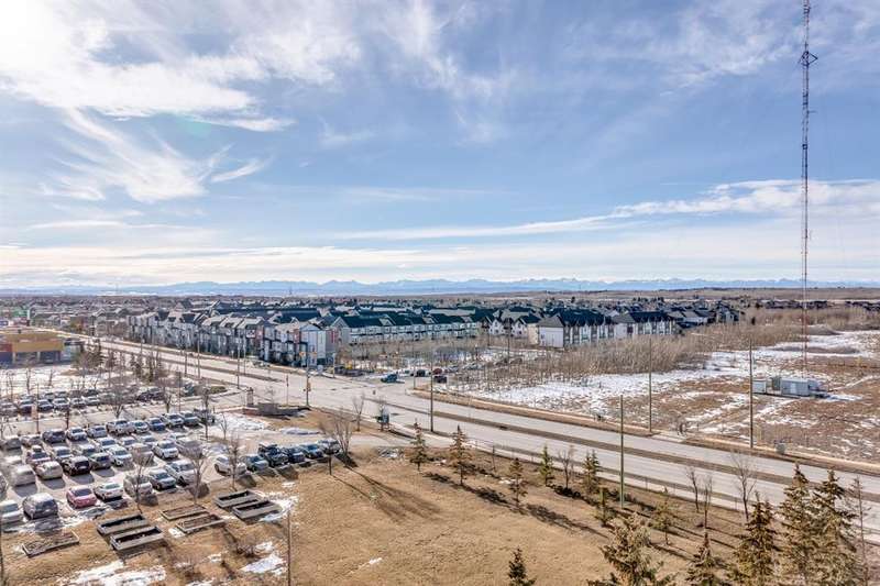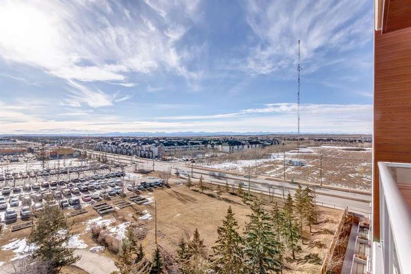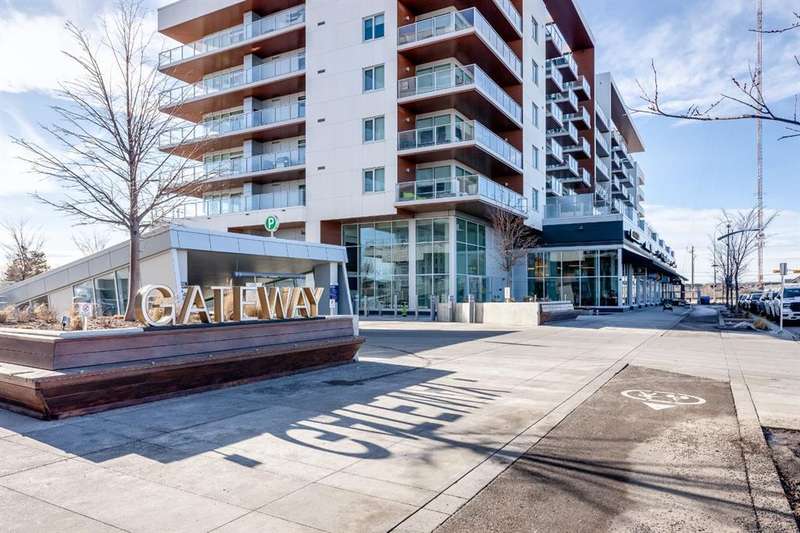 Welcome to the prestigious Concrete Constructed Gateway Condo on Broadcast Avenue, nestled in the highly sought-after community of West Springs. This immaculate 2-bed, 2-bath residence is a haven of contemporary elegance, with an exceptional outdoor patio space with desirable west and south exposures. Meticulously designed with fresh paint and a contemporary aesthetic, this unit offers a versatile nook perfect for a dining area or an office space, catering to your lifestyle needs. Upon entering, you'll be greeted by an abundance of natural light streaming through 9ft ceilings and floor-to-ceiling windows in the dining room and living room. The kitchen is a culinary enthusiast's dream, featuring a large island, full-height cabinetry, soft-close doors and drawers, gold-accented hardware, a black matte faucet with a pull-down sprayer, quartz countertops with a full-height backsplash, LED pot lights, gas cooktop, and top-of-the-line appliances, including a stove, fridge, dishwasher, and built in microwave. The private quarters are thoughtfully designed, with the primary bedroom featuring the convenience of a walk-through closet leading into the master ensuite , complete with built-in closet organization and a glass-enclosed shower for a touch of sophistication. Both bathrooms feature tasteful tiled flooring, adding a luxurious touch to the space. The second bedroom is conveniently located across from the 4-piece main bath. The entire unit boasts herringbone-style flooring, providing a seamless and elegant aesthetic throughout. A separate laundry room with stacked washer and dryer completes this well-planned living space. Enjoy the comfort of your own furnace within the unit, providing personalized climate control. As a south-facing unit, revel in the warmth of the sun streaming in all evening, creating a bright and inviting living space. Marvel at breathtaking mountain views visible right from the comfort of your home. The living experience is elevated by the gas line on the patio, offering the convenience of outdoor grilling or option to add a heater for cooler evenings making your patio your private oasis. The Gateway Building provides added convenience with underground visitor parking stalls and a secured bike storage room. Residents can also enjoy the 8th-floor sundeck and 2nd-floor owner's lounge, perfect for socializing or unwinding in style. Indulge in the finer details of this home. Convenience meets lifestyle with easy access to the new Stoney Trail addition, less than 5 minutes away, providing seamless connectivity to various parts of the city. Additionally, shops located below the condo offer a wealth of amenities, ensuring that daily necessities and indulgences are just steps away. With 1,033 square feet of well-utilized space, embrace the opportunity to call Gateway your home and experience the perfect blend of comfort, style, and functionality. This is your invitation to a lifestyle where mountain views, sunset hues, and personalized comfort combined.