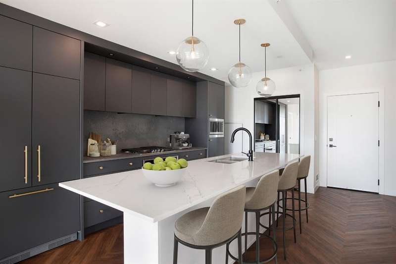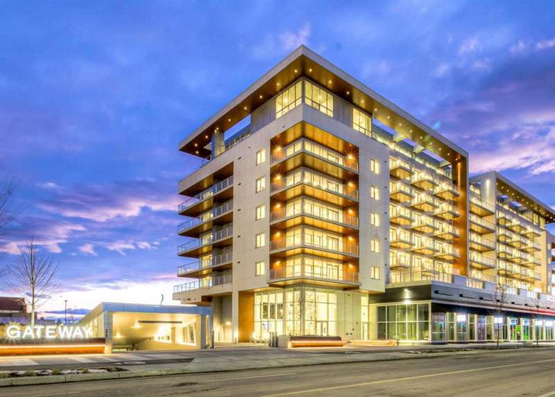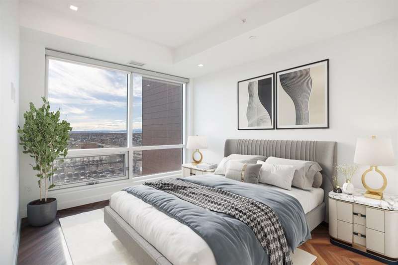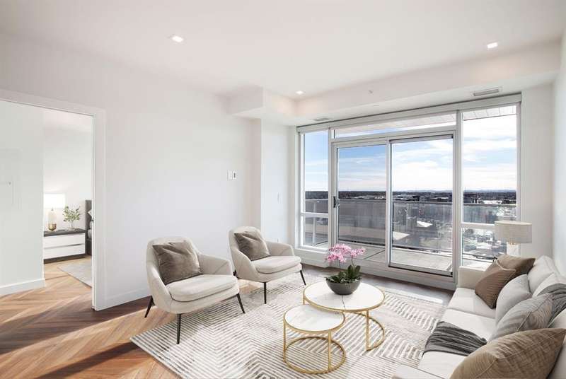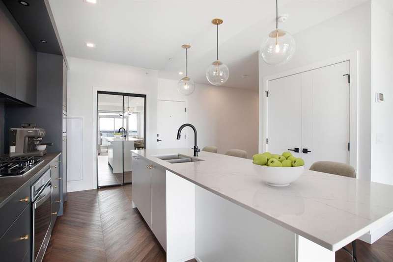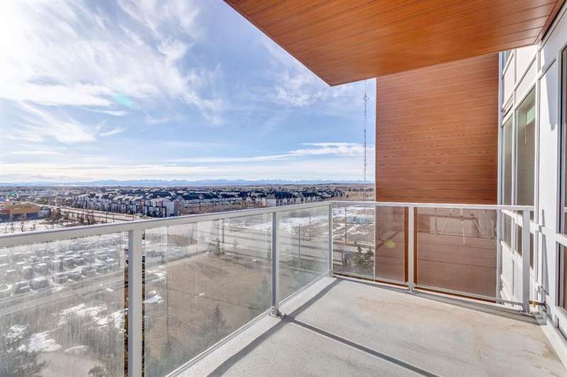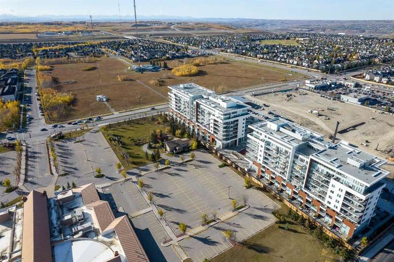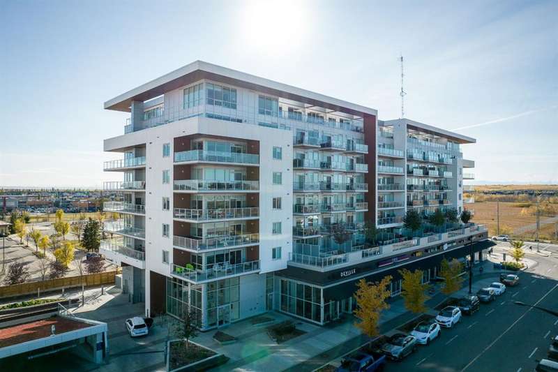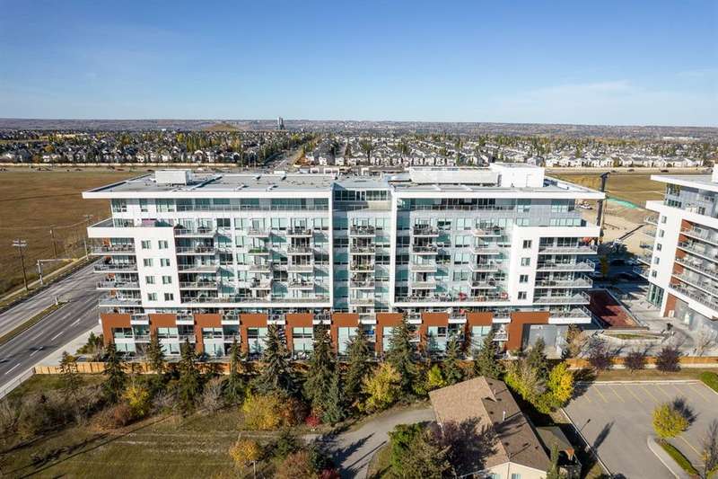 Welcome to the prestigious Concrete Constructed Gateway Condo on Broadcast Avenue, nestled in the highly sought-after community of West Springs. This immaculate 2-bed, 2-bath residence is a haven of contemporary elegance, with an exceptional outdoor patio space with desirable west and south exposures. Meticulously designed with fresh paint and a contemporary aesthetic, this unit offers a versatile nook perfect for a dining area or an office space, catering to your lifestyle needs. Upon entering, you'll be greeted by an abundance of natural light streaming through 9ft ceilings and floor-to-ceiling windows in the dining room and living room. The kitchen is a culinary enthusiast's dream, featuring a large island, full-height cabinetry, soft-close doors and drawers, gold-accented hardware, a black matte faucet with a pull-down sprayer, quartz countertops with a full-height backsplash, LED pot lights, gas cooktop, and top-of-the-line appliances, including a stove, fridge, dishwasher, and built in microwave. The private quarters are thoughtfully designed, with the primary bedroom featuring the convenience of a walk-through closet leading into the master ensuite , complete with built-in closet organization and a glass-enclosed shower for a touch of sophistication. Both bathrooms feature tasteful tiled flooring, adding a luxurious touch to the space. The second bedroom is conveniently located across from the 4-piece main bath. The entire unit boasts herringbone-style flooring, providing a seamless and elegant aesthetic throughout. A separate laundry room with stacked washer and dryer completes this well-planned living space. Enjoy the comfort of your own furnace within the unit, providing personalized climate control. As a south-facing unit, revel in the warmth of the sun streaming in all evening, creating a bright and inviting living space. Marvel at breathtaking mountain views visible right from the comfort of your home. The living experience is elevated by the gas line on the patio, offering the convenience of outdoor grilling or option to add a heater for cooler evenings making your patio your private oasis. The Gateway Building provides added convenience with underground visitor parking stalls and a secured bike storage room. Residents can also enjoy the 8th-floor sundeck and 2nd-floor owner's lounge, perfect for socializing or unwinding in style. Indulge in the finer details of this home. Convenience meets lifestyle with easy access to the new Stoney Trail addition, less than 5 minutes away, providing seamless connectivity to various parts of the city. Additionally, shops located below the condo offer a wealth of amenities, ensuring that daily necessities and indulgences are just steps away. With 1,033 square feet of well-utilized space, embrace the opportunity to call Gateway your home and experience the perfect blend of comfort, style, and functionality. This is your invitation to a lifestyle where mountain views, sunset hues, and personalized comfort combined.