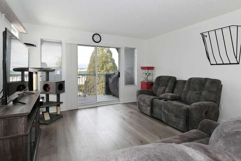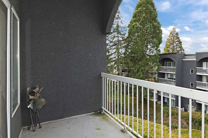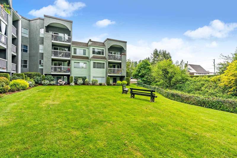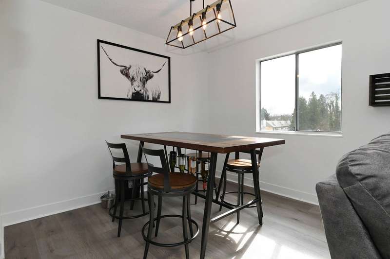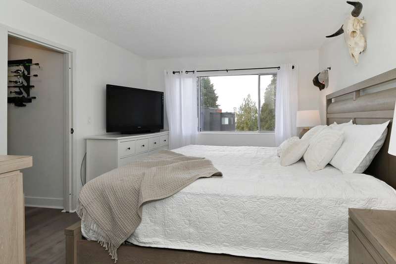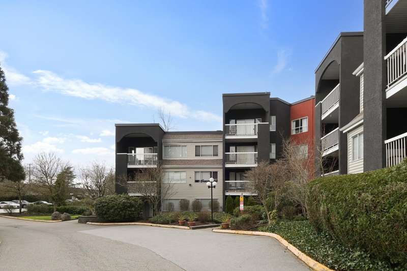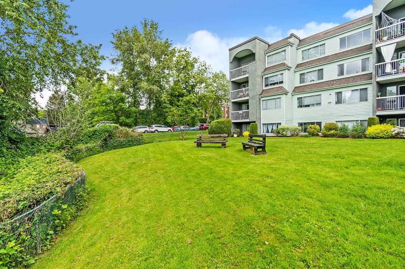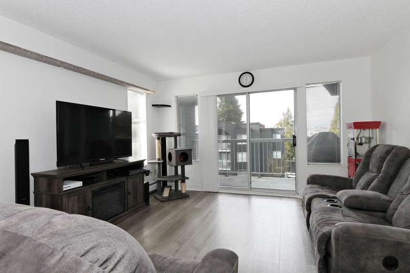 Welcome to LANGLEY VILLAGE! This beautifully updated 2-bedroom & DEN, top-floor CORNER UNIT is perfectly positioned on the southwest corner of the building, bringing in tons of natural light! Featuring all-new flooring, baseboards, designer paint, and stylish lighting, this home has a fresh, modern feel throughout. The spacious primary bedroom features his & hers closets with a cheater ensuite, 2nd bedroom plus den - perfect for a home office or storage. The open-concept living/dining area leads to a west-facing patio, ideal for BBQs. Enjoy a full-height storage locker on the same floor, 1 parking stall (extra available for $45/month), plus a gym and amenity room. Steps to shopping, parks, and transit, in a pet- and rental-friendly building!