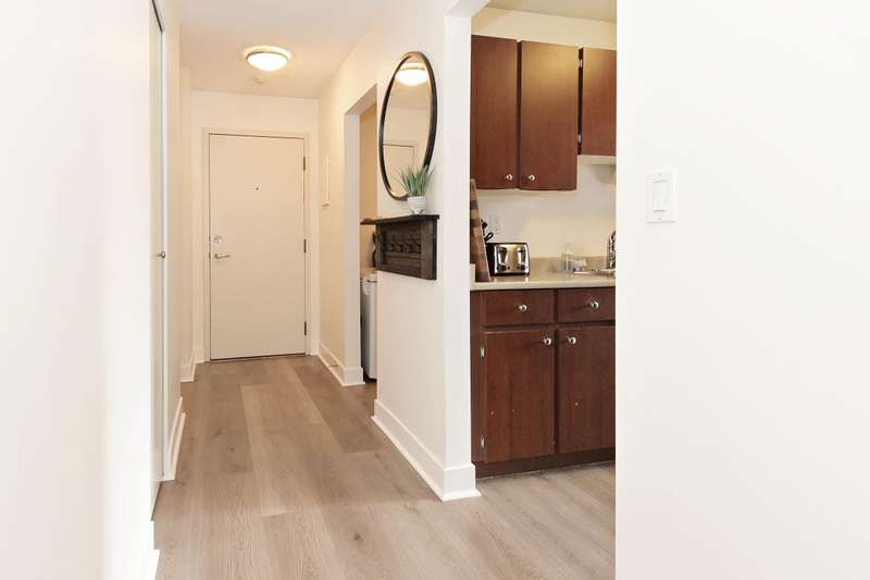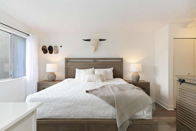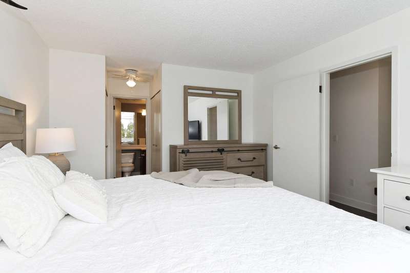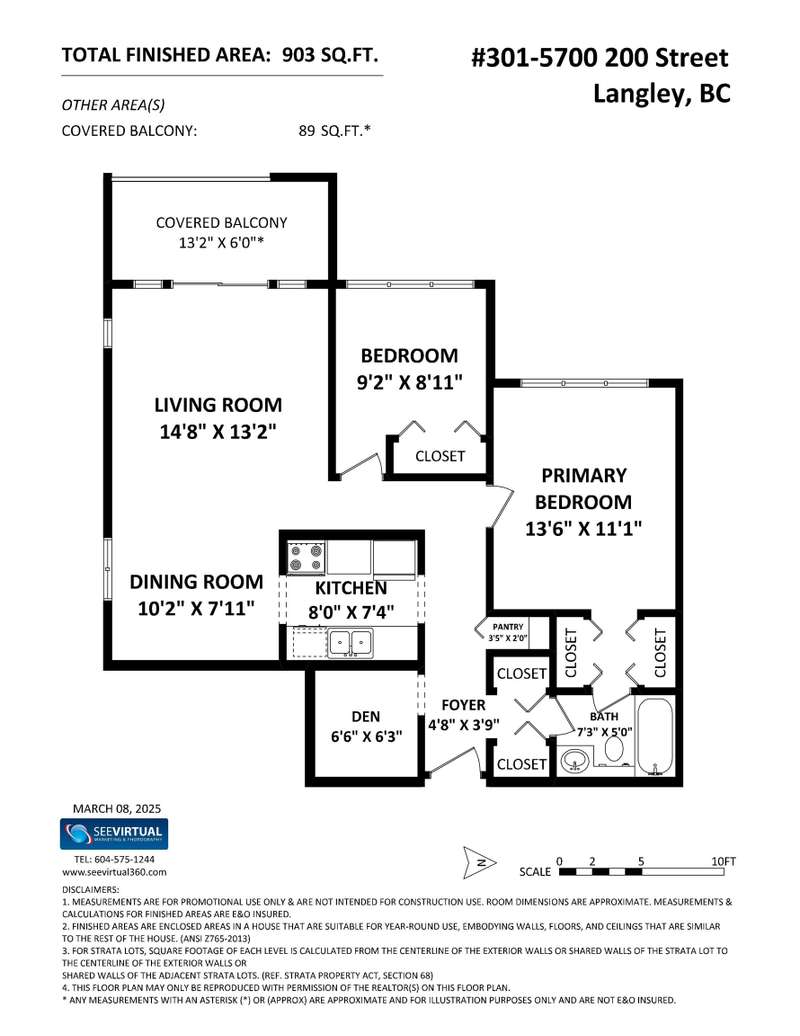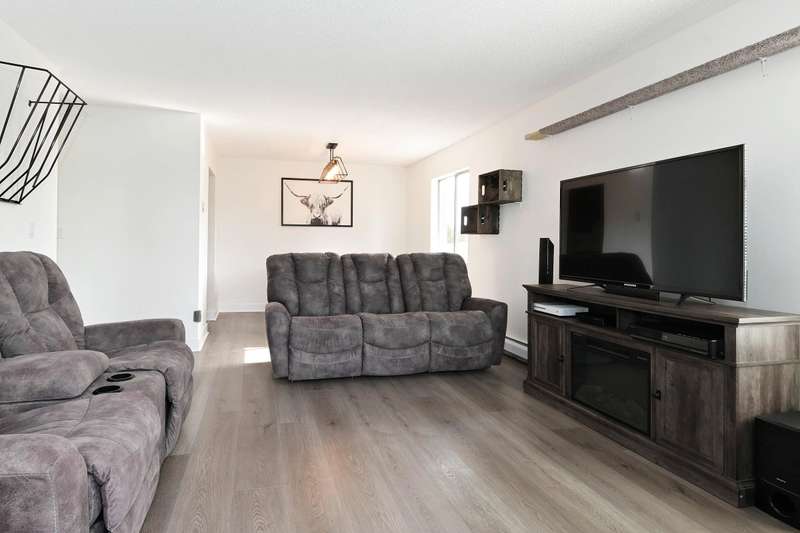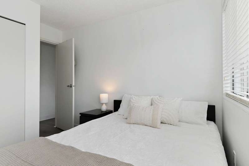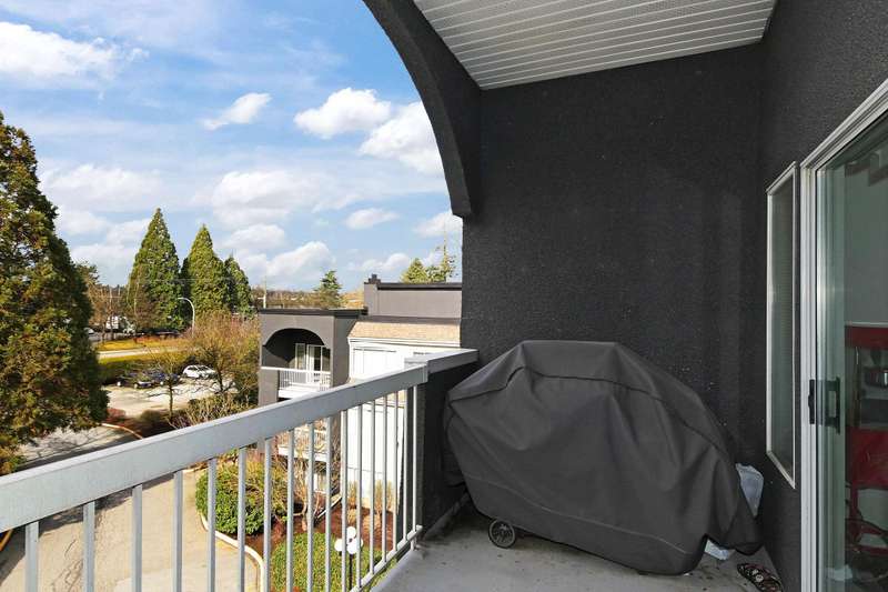 Welcome to LANGLEY VILLAGE! This beautifully updated 2-bedroom & DEN, top-floor CORNER UNIT is perfectly positioned on the southwest corner of the building, bringing in tons of natural light! Featuring all-new flooring, baseboards, designer paint, and stylish lighting, this home has a fresh, modern feel throughout. The spacious primary bedroom features his & hers closets with a cheater ensuite, 2nd bedroom plus den - perfect for a home office or storage. The open-concept living/dining area leads to a west-facing patio, ideal for BBQs. Enjoy a full-height storage locker on the same floor, 1 parking stall (extra available for $45/month), plus a gym and amenity room. Steps to shopping, parks, and transit, in a pet- and rental-friendly building!