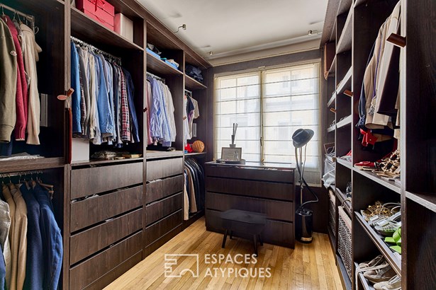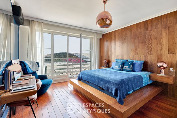 On the sleeping side, a first bedroom of over 19 sqm with built-in dressing room closets benefits from a custom-designed raised bed, and a third balcony without vis-a-vis.