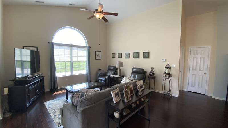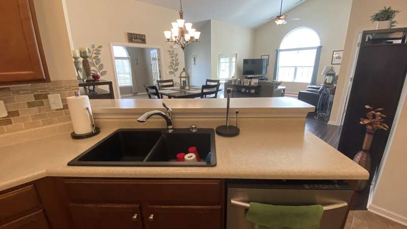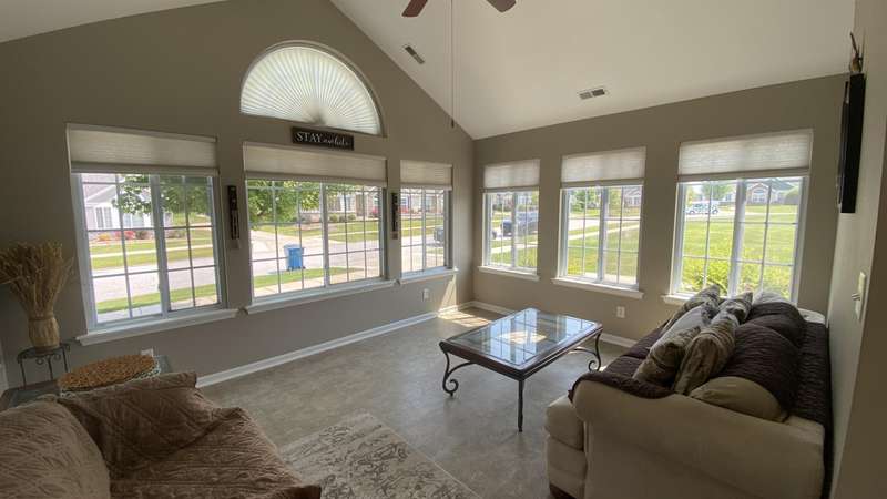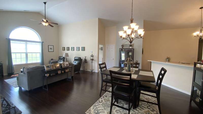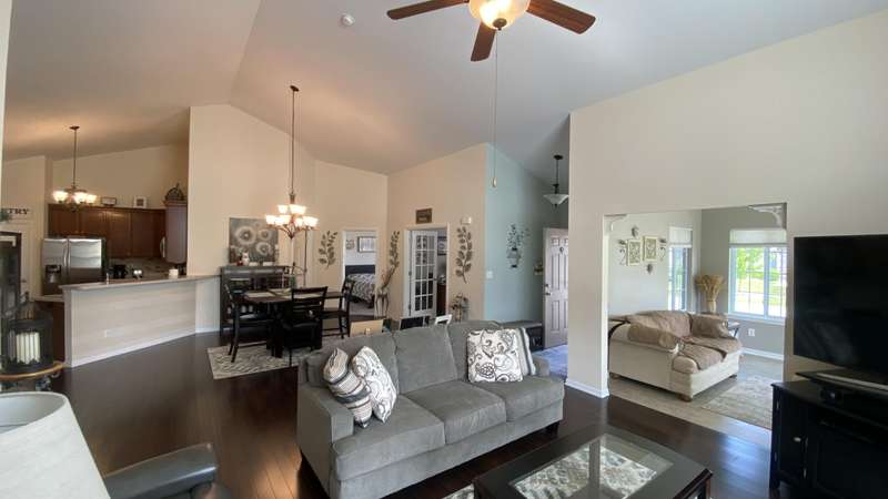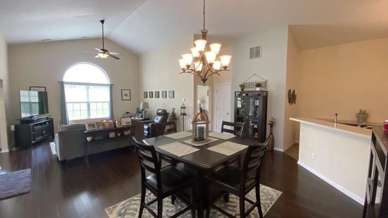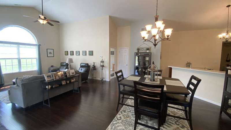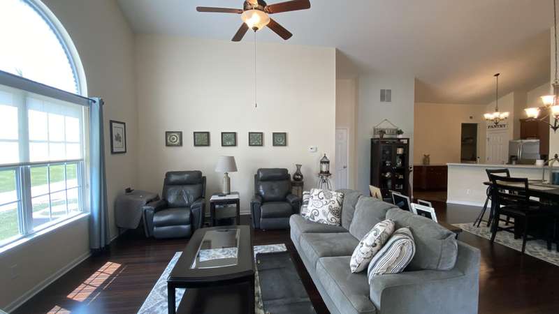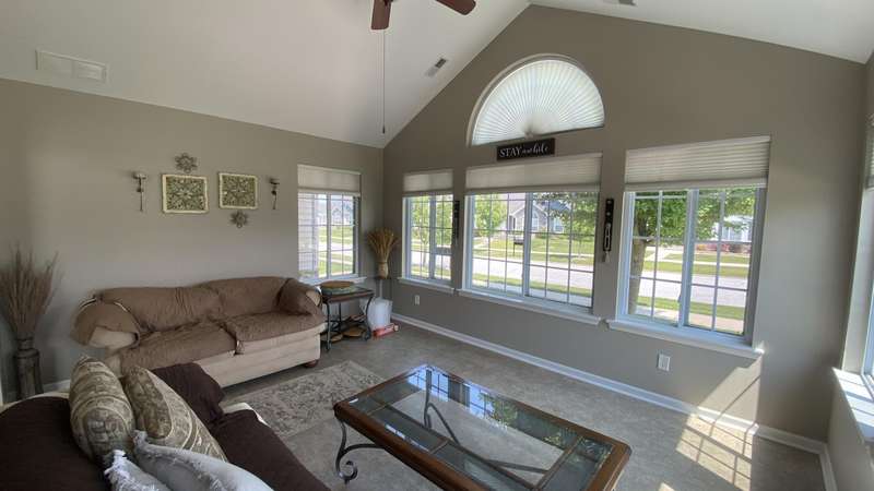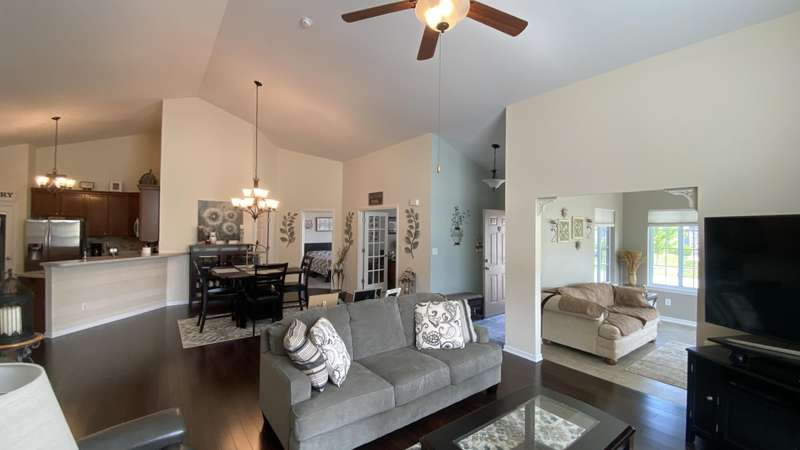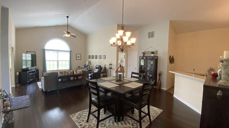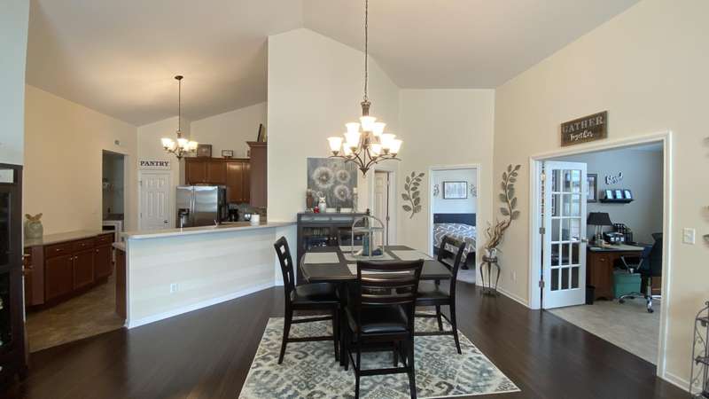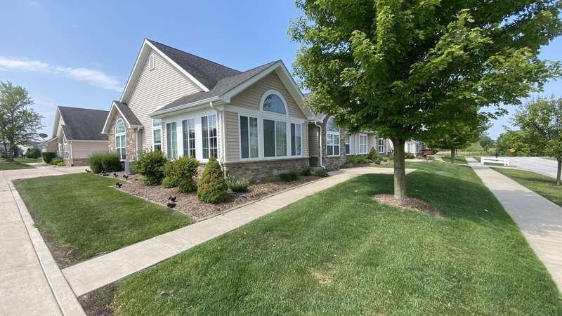 Welcome home! Ranch style villa in 4 plex building with 2 bedrooms, 2 bathrooms, an office, and a Sunroom! Plus a two car garage and private entrance. Once inside you will be dazzled! Soaring ceilings and wide open concept allow for free flow traffic from room to room. Bright and airy living room, dining room and kitchen flow together. The kitchen features tall cabinets, breakfast island, pantry, bonus buffet cabinet- perfect for coffee or wine bar ! A mudroom/laundry room with laundry tub and shelving that leads from the garage (with pull down attic stairs for more storage) The office has French doors offering privacy or can be converted to use as 3rd bedroom. The bright sunroom has 1/2 circle windows and walls of windows! The Main Bedroom has ensuite bath and walk in closet., plus a 2nd bedroom! Easy maintenance free living with landscaping, lawn care, and snow removal included in HOA fee! Located in a well established community complete with beautiful tree lined heavily landscaped entrance, sitting park, tot park, and ponds and sought after Crown Point schools. Water heater is only 1 year old an a new microwave was just installed.