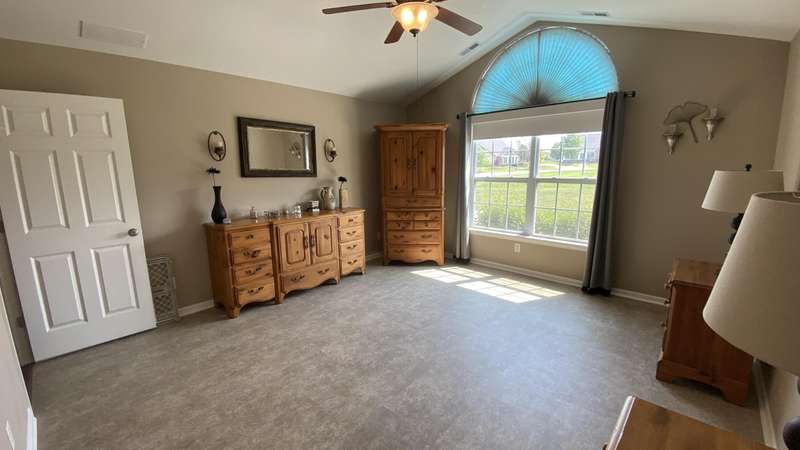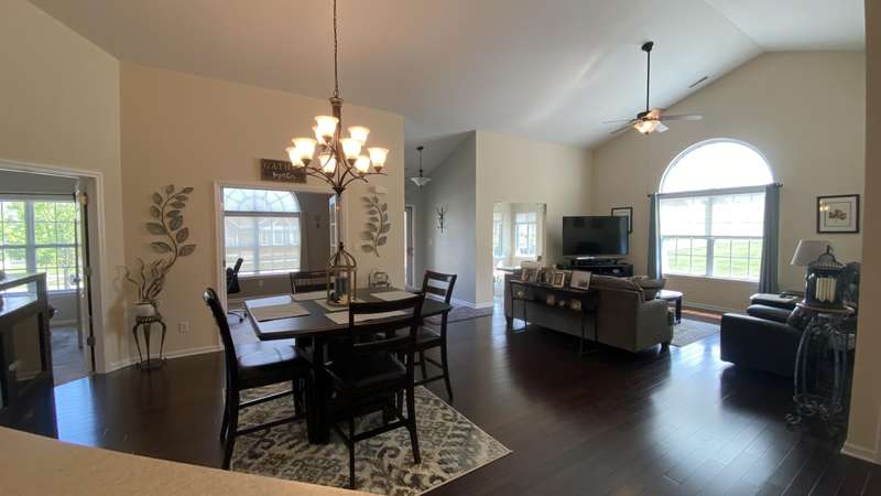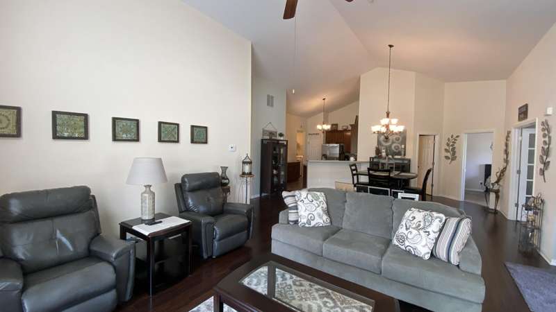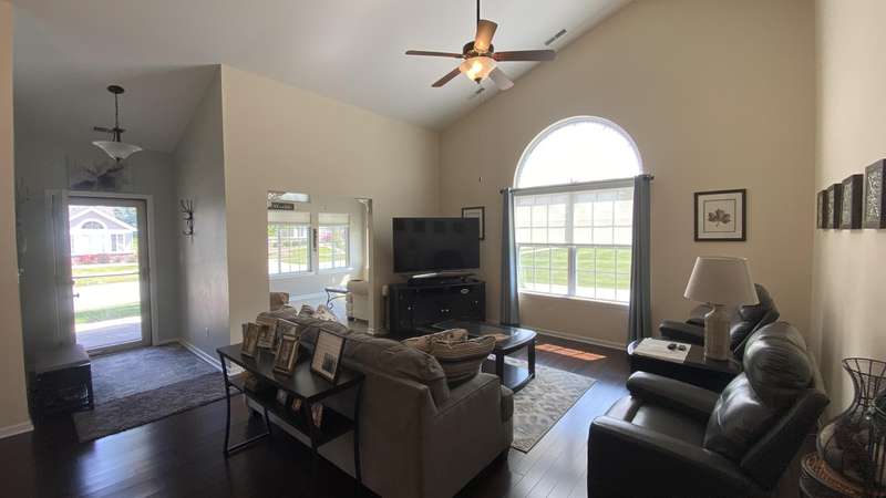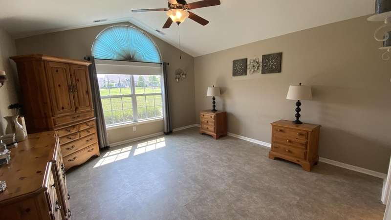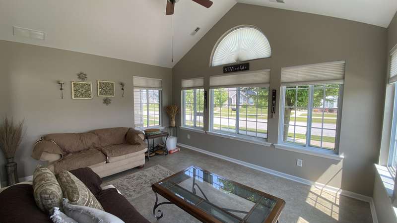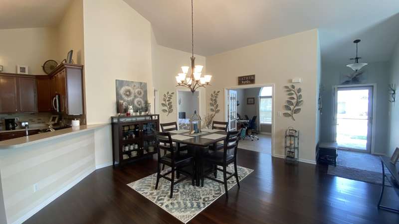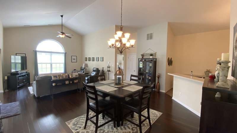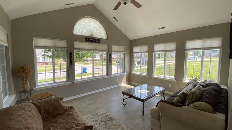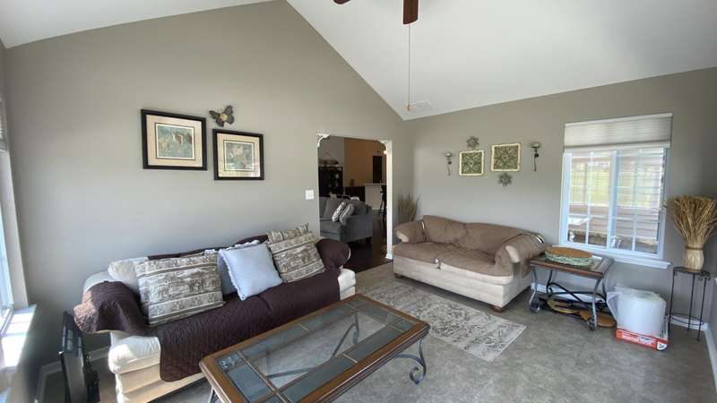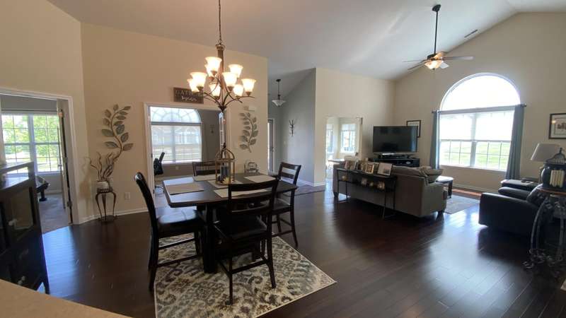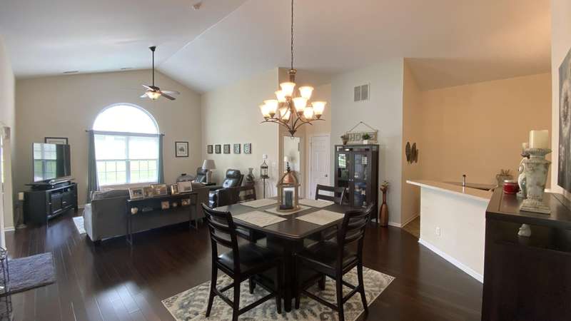 Welcome home! Ranch style villa in 4 plex building with 2 bedrooms, 2 bathrooms, an office, and a Sunroom! Plus a two car garage and private entrance. Once inside you will be dazzled! Soaring ceilings and wide open concept allow for free flow traffic from room to room. Bright and airy living room, dining room and kitchen flow together. The kitchen features tall cabinets, breakfast island, pantry, bonus buffet cabinet- perfect for coffee or wine bar ! A mudroom/laundry room with laundry tub and shelving that leads from the garage (with pull down attic stairs for more storage) The office has French doors offering privacy or can be converted to use as 3rd bedroom. The bright sunroom has 1/2 circle windows and walls of windows! The Main Bedroom has ensuite bath and walk in closet., plus a 2nd bedroom! Easy maintenance free living with landscaping, lawn care, and snow removal included in HOA fee! Located in a well established community complete with beautiful tree lined heavily landscaped entrance, sitting park, tot park, and ponds and sought after Crown Point schools. Water heater is only 1 year old an a new microwave was just installed.