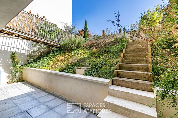 The dry garden of this bio-climatic house with extraordinary energy performance has been designed to provide a pleasant and rational outdoor space requiring little maintenance. It is also accessible from the main living room and from the kitchen via a staircase and a walkway made of wood and metal with the most beautiful effect, giving this house a unique architectural signature.