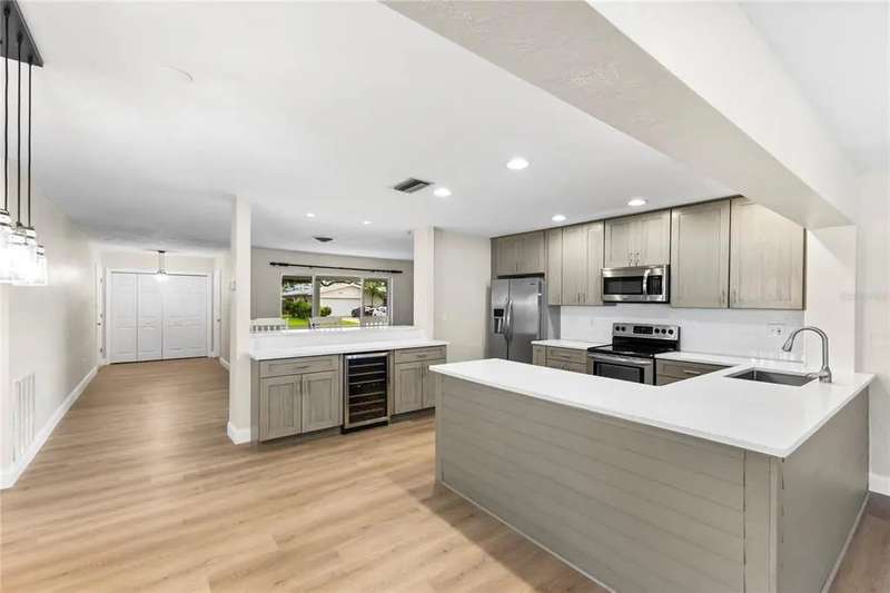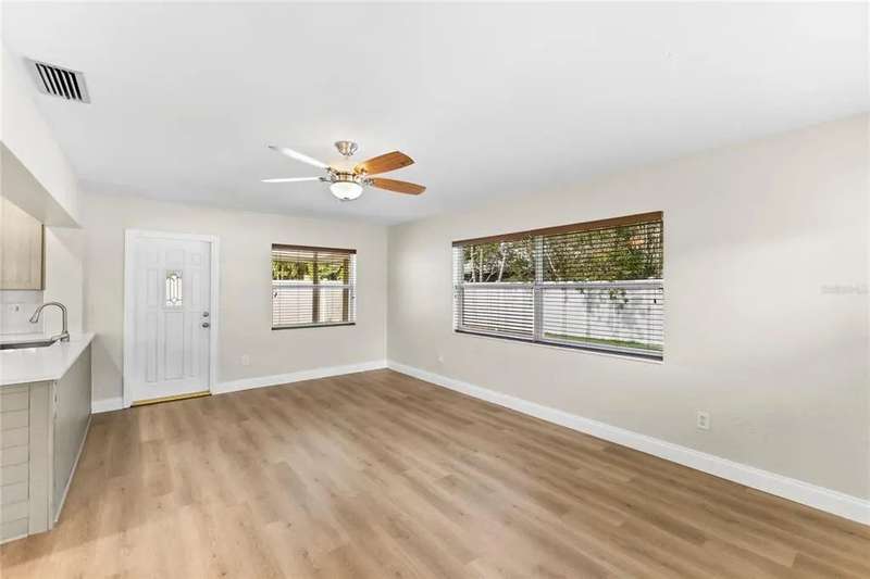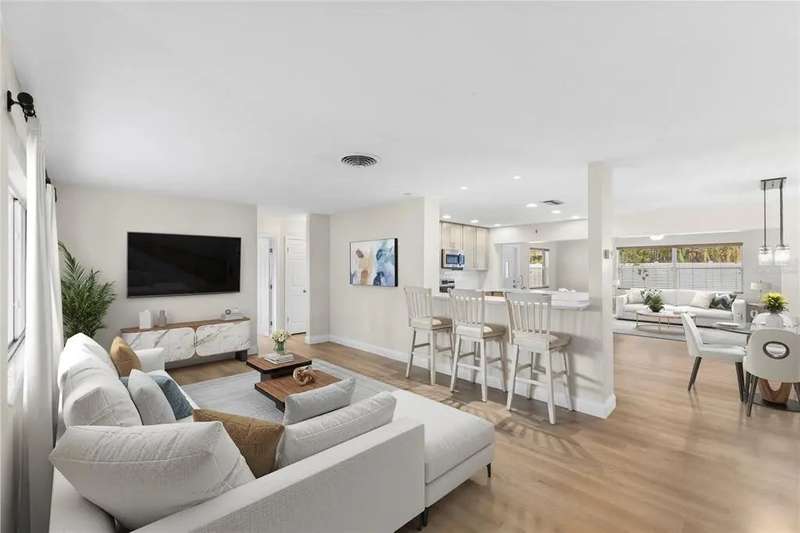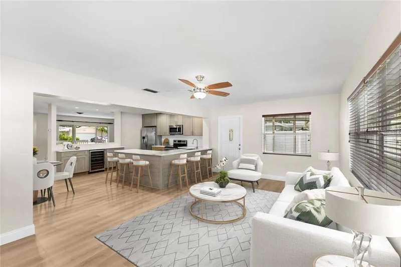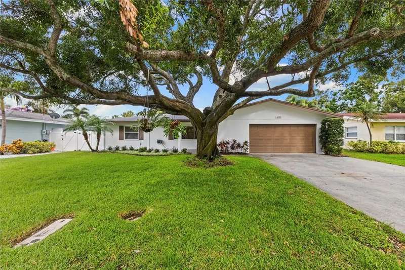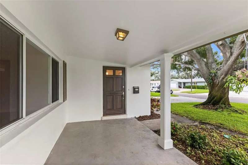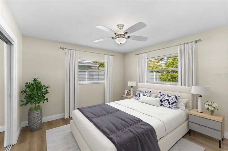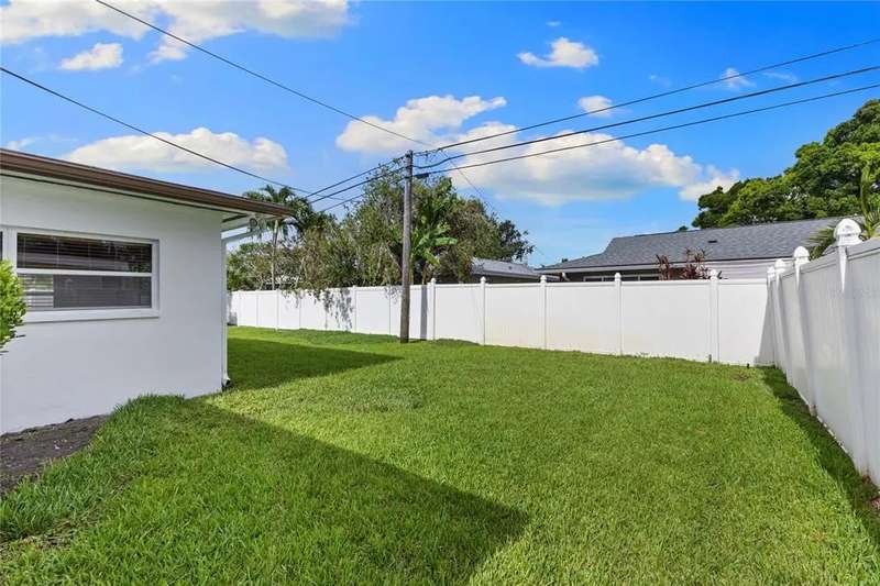 One or more photo(s) has been virtually staged. Located under the canopy shade of a majestic oak in the highly desirable neighborhood of Patrician Point, this beautifully updated 1960s block ranch combines timeless charm with modern living. Just minutes from downtown St. Pete and popular spots like Crisp Park, Trader Joe’s, Whole Foods, and the waterfront shops & restaurants of popular Beach Drive & Central Ave, this home offers both convenience and lifestyle. Inside, you're welcomed by brand new white oak luxury vinyl plank flooring that flows seamlessly throughout the entire home. The open concept layout is perfect for entertaining, centered around a chef-inspired kitchen featuring quartz countertops, coastal shaker cabinetry, a subway tile backsplash, breakfast bar with built in beverage fridge and abundant storage. The smart split bedroom floor plan provides privacy and comfort with a spacious primary suite featuring a fully renovated en-suite bath complete with dual marble-topped vanities, a walk-in tiled shower and glass enclosure. Step outside to enjoy true Florida living in the large fenced backyard with new PVC fencing, a covered patio ideal for BBQs, room for a pool and space for pets or little ones to play. Additional upgrades include a tankless gas water heater (2019) and attic insulation (2019) for improved energy efficiency. Located in a non-HOA, golf-cart-friendly community, this move-in-ready home is perfect for those seeking the ultimate St Pete lifestyle. Don’t miss your chance to own a piece of St. Petersburg paradise!