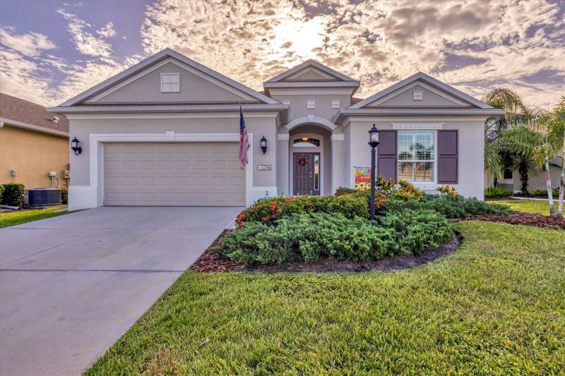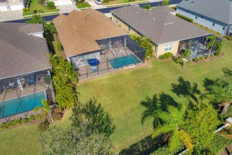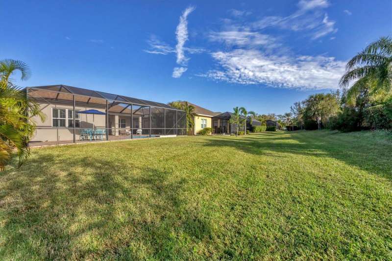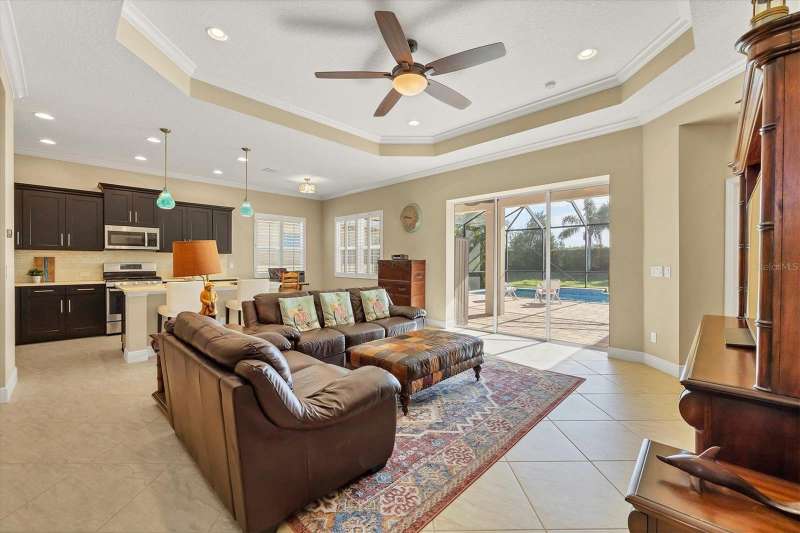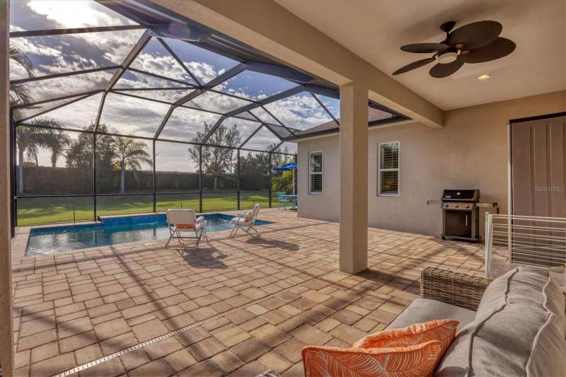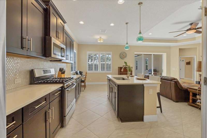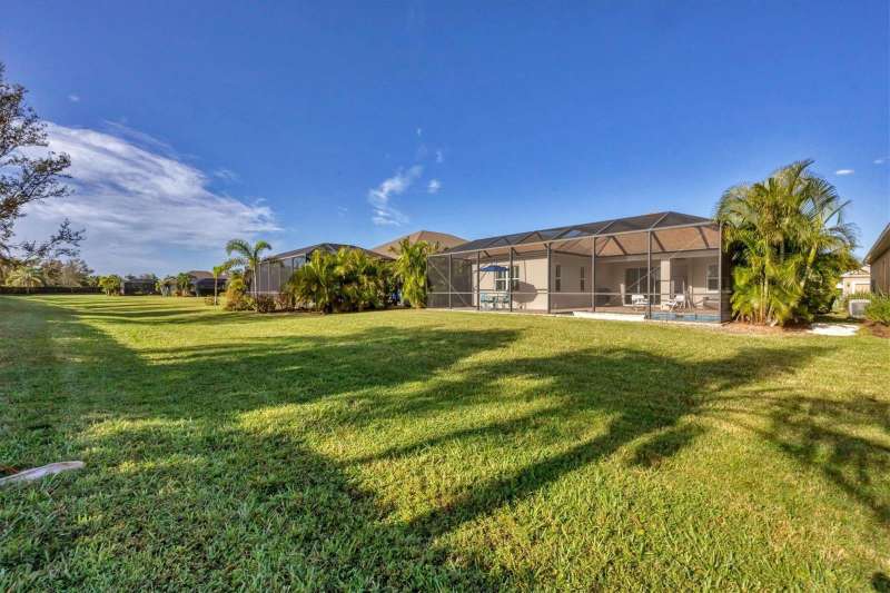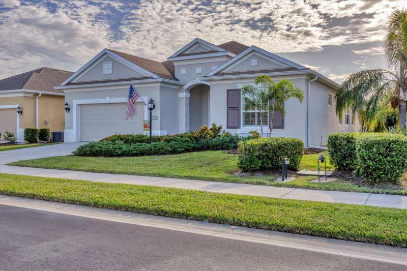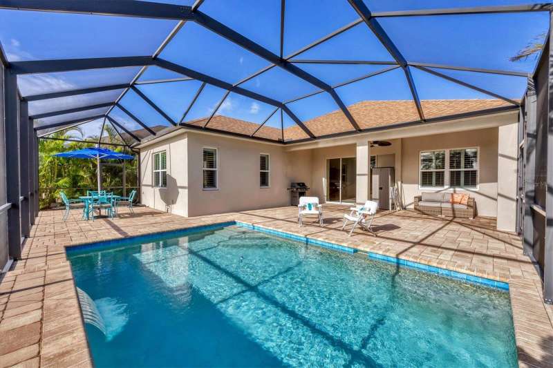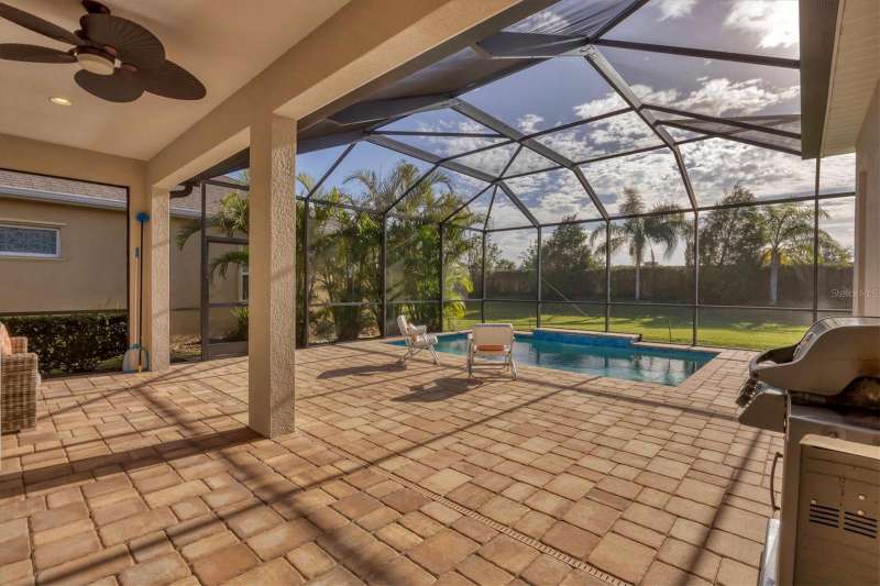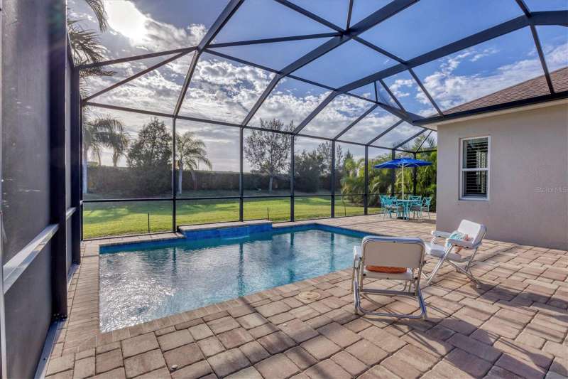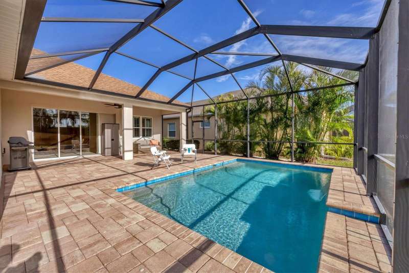 Welcome to the gated, maintenance-free community of Eagle Trace. This three bedroom, two bathroom pool home features a den, open floor plan and 10 foot ceillings framed by crown molding. The great room floor plan is perfect for entertaining or family gatherings with a separate dining room and large family room all open to the kitchen. The kitchen boasts quartz countertops, stainless steel appliances, a gas stove, a breakfast area, large pantry and cabinets with pull out drawers. The triple pocketing sliding doors in the family room frame your extended paver patio and sparkling, heated, salt water pool as well as your large private backyard. The flex room located off the family room can be used as a home office, den or, with the addition of a closet, a fourth bedroom. The primary bedroom is a private and relaxing retreat with coffered ceilings, two large closets, with custom built ins, and an en-suite bath making it the perfect place relax at the end of the day. The primary bathroom offers a zero entry shower, dual sinks and soaking tub. Two other bedrooms are located toward the front of the home on opposite sides of the hallway with a guest bath located conveniently between. An indoor laundry room, extended insulated garage, radiant barrier, smart house lighting, gas plumbed area on patio for ourdoor kitchen and extra attic space for storage are some of the many additional upgrades. This home also has over three years remaining on the structural and AC waranties. The community amenities include tennis/pickle ball courts, restort-style community pool and spa with covered sitting and grill area for gatherings, two dog parks and a playground. Located in an A rated school district and close to all the conveniences of Lakewood Ranch with no CDD fees this home is the perfect place to call home!