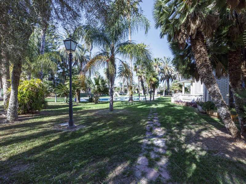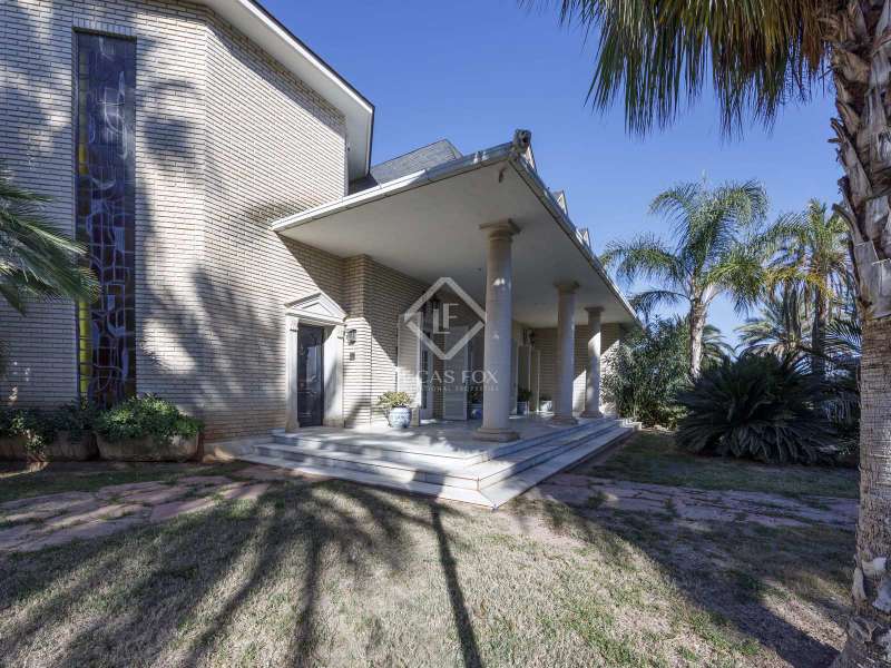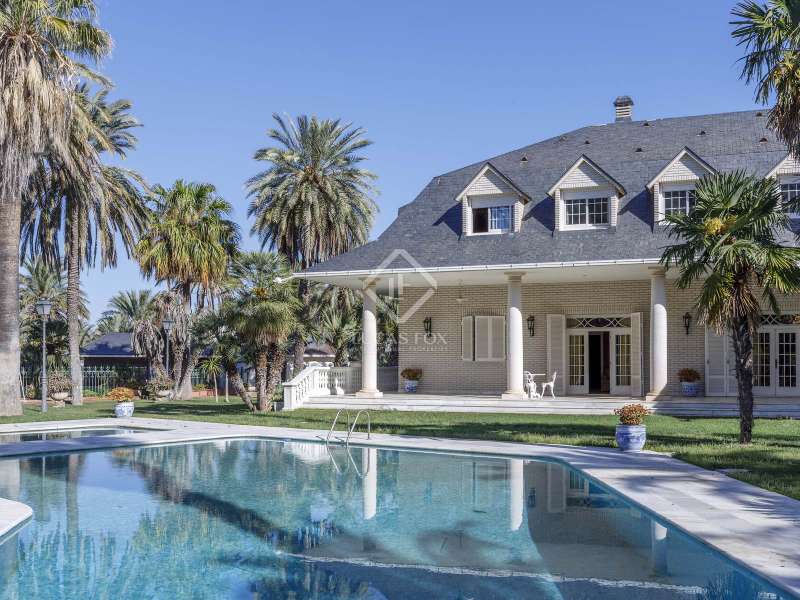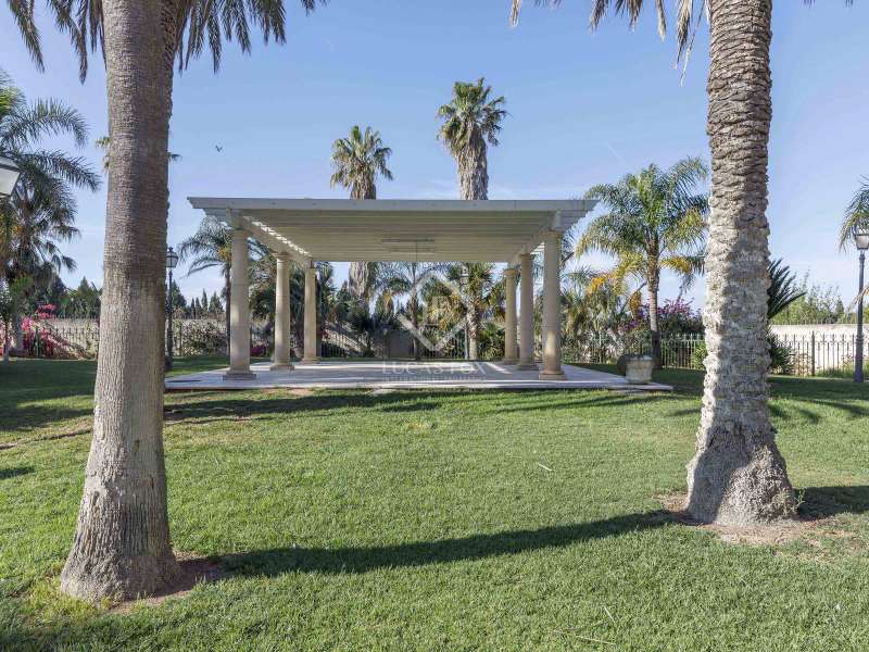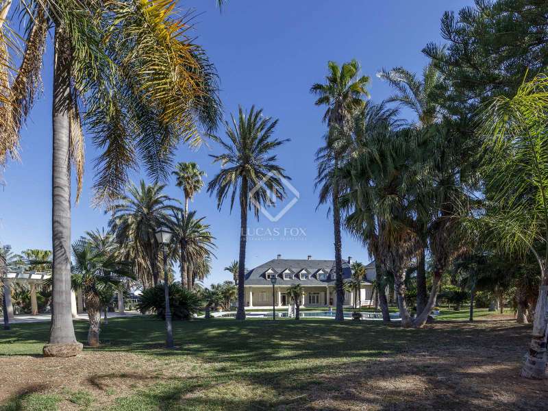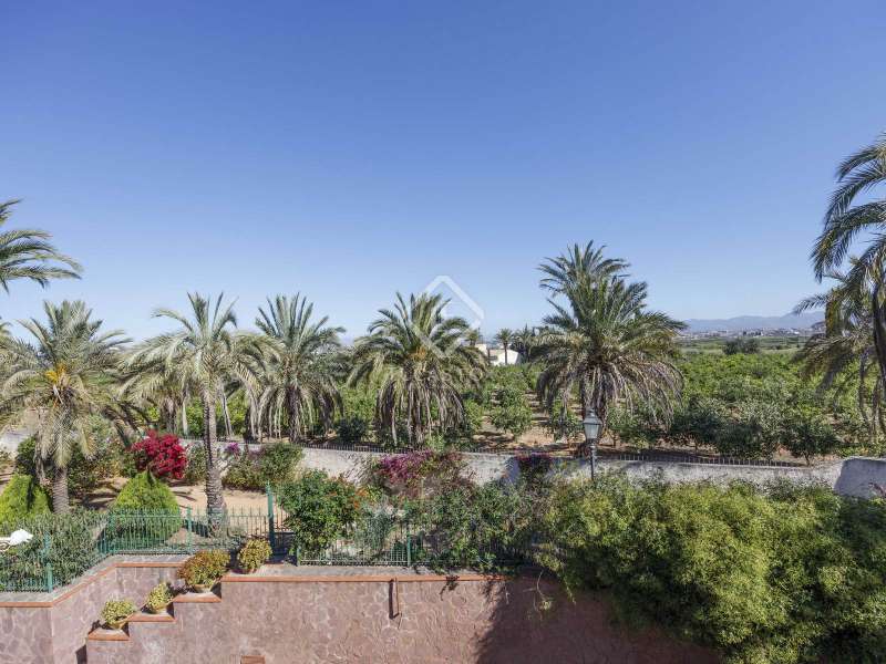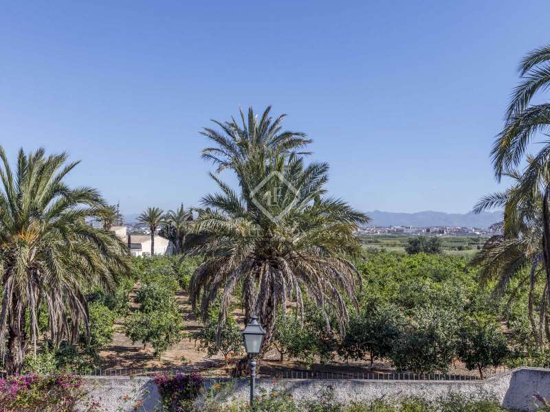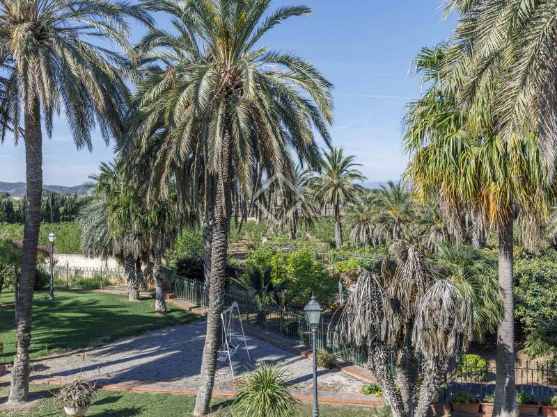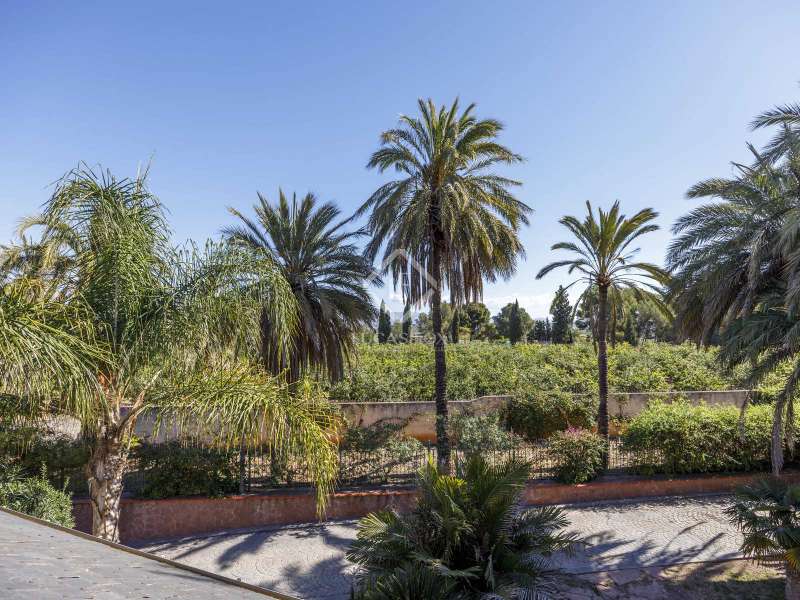 Lucas Fox presents this luxurious house with a high construction quality and a careful selection of materials for sale in La Eliana. The exclusive villa stands out for being located on a plot of almost 40,000m2, surrounded by extensive orange groves and multiple palm trees of different species. It is located in a natural environment, away from the hustle and bustle of the city, but excellently connected and only 25 kilometers from Valencia. In fact, less than a kilometer away, there is a metro station and less than three kilometers away, the towns of La Eliana and Pobla de Vallbona. The house itself has an integrated auxiliary property , of more than 70m2, which also has independent access from the exterior. A private driveway lined with palm trees and greenery that runs through the orange groves leads us to the house. At the entrance, we are welcomed by a spectacular entrance hall with marble floors, high ceilings and stained glass windows with a beautiful staircase that leads us to the upper floor . Access to the main rooms of the house is on the right. Each room is spectacular for its spacious size and the quality of its elements. The layout of the main floor includes a large living room with a fireplace, a dining room also with a fireplace and a lounge with views of the garden and pool. Next is the kitchen with a charming wooden beamed ceiling. It is also well-sized and has a utility room area and access to the exterior, near the barbecue area. Going up the stairs we reach the night area with five large bedrooms with private bathrooms, dressing rooms and fantastic views of the horizon of the orange and palm groves from their windows. On this floor we also have another double bedroom with private bathroom, a twin bedroom and a full bathroom . The ground floor has a large room with a barbecue where you can enjoy parties with friends, a wine cellar, a bathroom and a spacious study-library. This floor connects with the garage, with capacity for more than four vehicles and with several storage rooms and the technical area. All floors of the house are also connected by elevator. The exterior is truly spectacular, offering large spaces and areas with grass, vegetation and palm trees. In addition, it benefits from having two swimming pools, a barbecue area and a giant pergola; all surrounded by the large expanse of orange groves that surround the house. We invite you to arrange a personalized visit to this special property so you can enjoy and appreciate it in every detail.