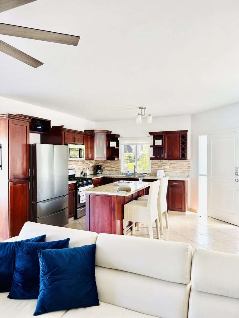 The interior of the Cabarete two-bedroom villa seamlessly blends with the exterior through large glass doors and open floor plans, allowing natural light and breezes to flow through the living spaces. The interior is adorned with tropical-themed decor, including colorful textiles, tropical artwork, and indoor plants, creating a cohesive and inviting atmosphere.