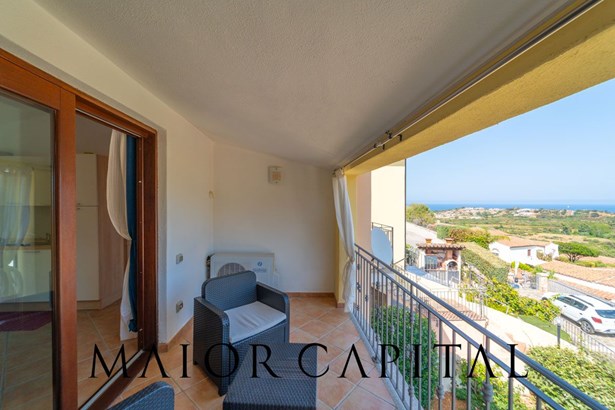 The flat, accessible via a private external staircase, leads directly to a bright living room with open kitchen, a cosy and well-distributed ambience, made unique by the exit onto the covered veranda. The gaze opens onto a wide view of the sea and the green Mediterranean vegetation, offering an ideal space for outdoor dining or relaxing moments in any season.