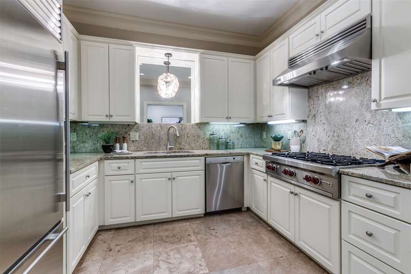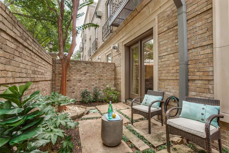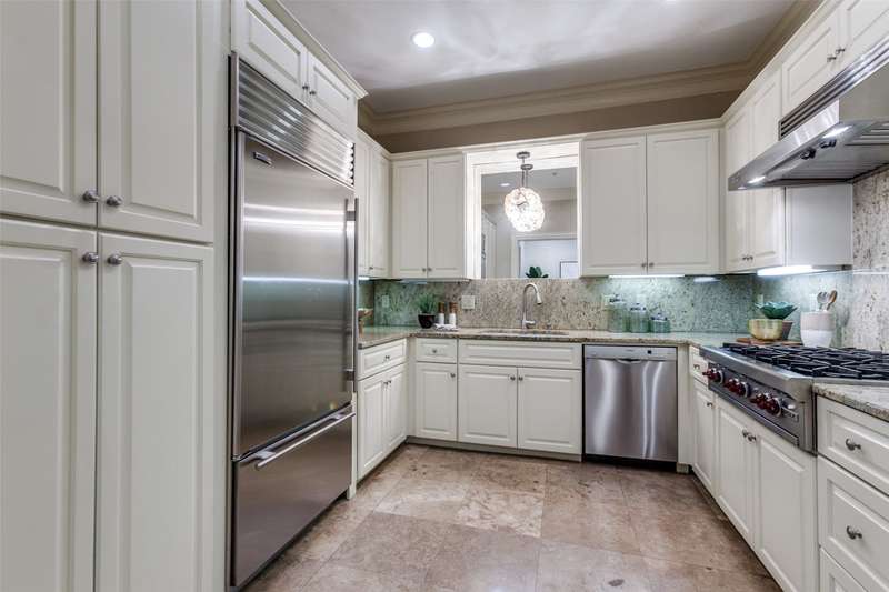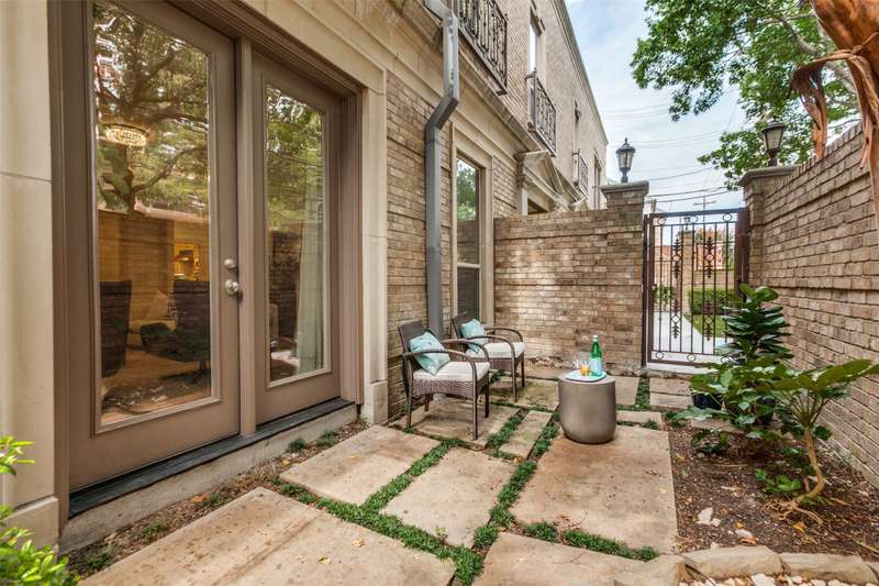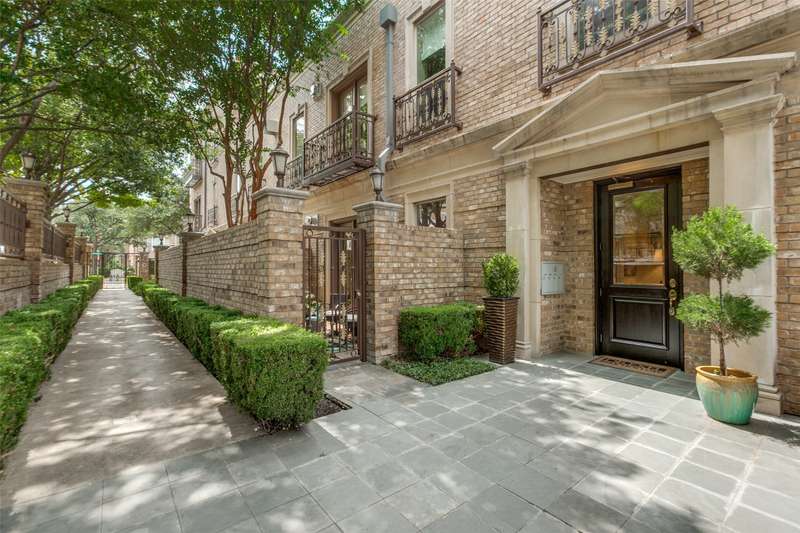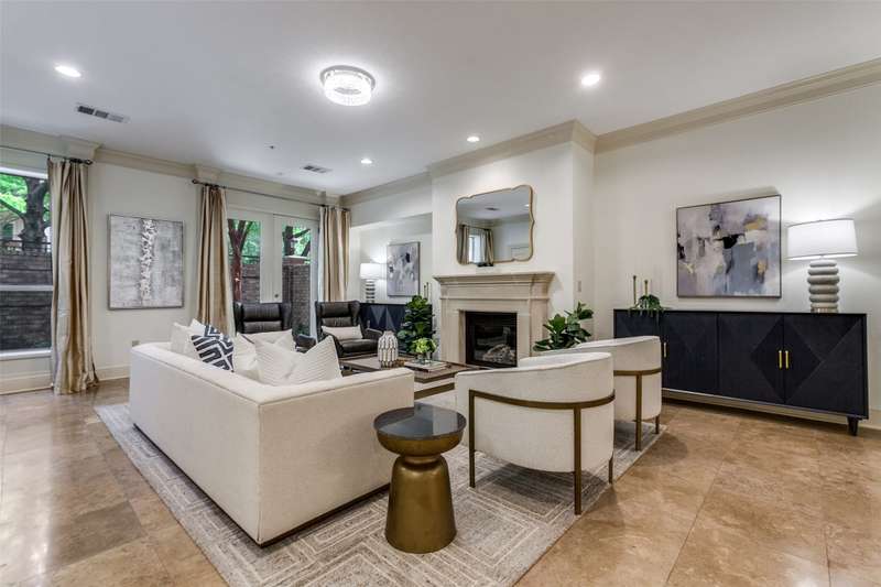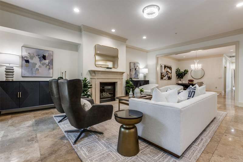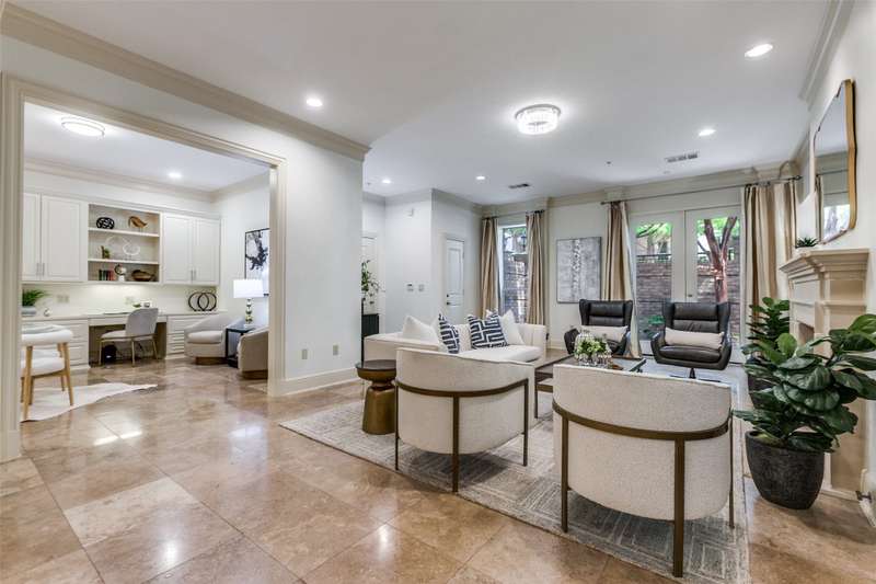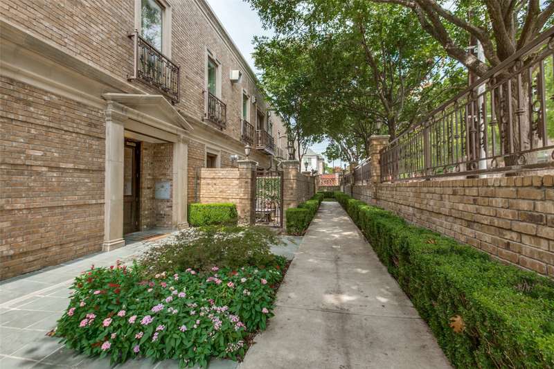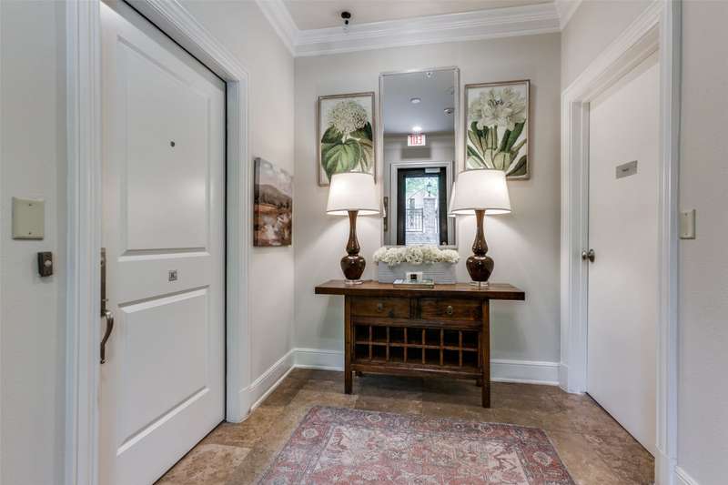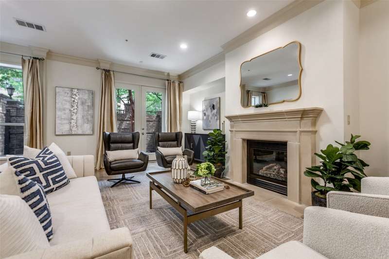 Luxury living in Preston Hollows finest condo development, the Drexel Park Hollow. This ground floor unit lives like a townhouse with private courtyards. Surrounded by an attractive brick wall, the secured courtyard entrance provides easy come & go. Or use the underground secured garage with elevator access to the entrance of the unit. The stunning interior offers wide open, generous proportions with 10 foot ceilings, travertine floors, and abundant natural light. The main living area enjoys a cast stone fireplace and access to your private terrace for morning coffee or evening relaxation. The versatile second living area provides a built-in office space with storage and file drawers, while also allowing space for a breakfast table and casual lounge area. The fully equipped kitchen offers granite counters and top appliances including Wolf gas range top, Thermador double ovens, Sub-Zero, Bosch DW, and microwave. Fabulous primary suite offers a sitting area, access to rear patio, and luxurious bath with double vanities, shower with frameless glass, jetted tub, and a closet requiring its own zip code! Perfect location near park + Preston Hollow and Park Cities restaurants and shopping. Easy to lock & leave accommodating a versatile lifestyle!