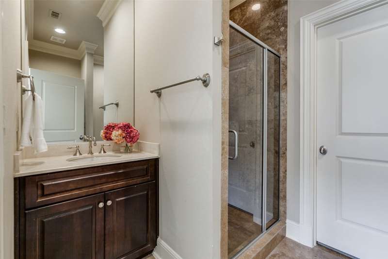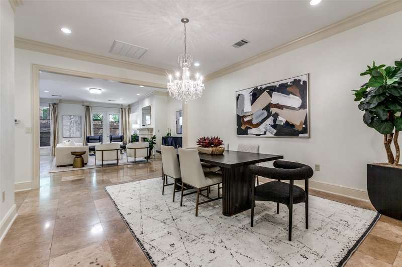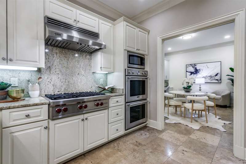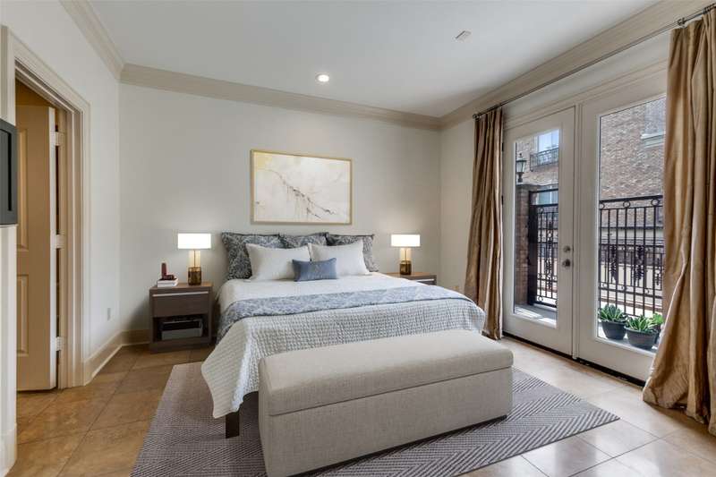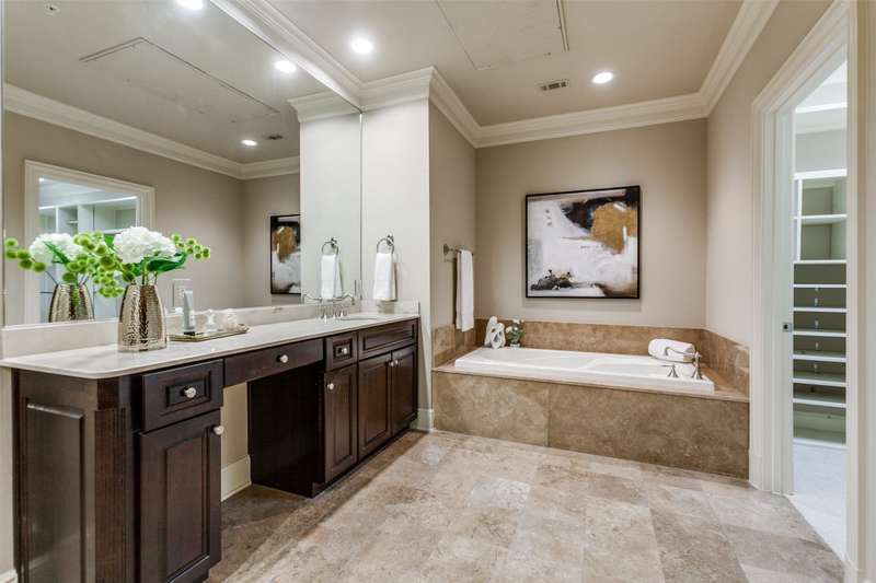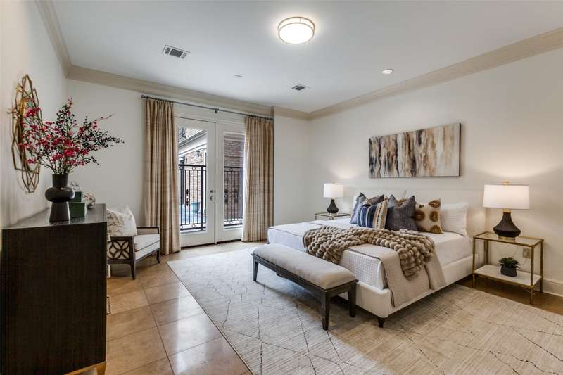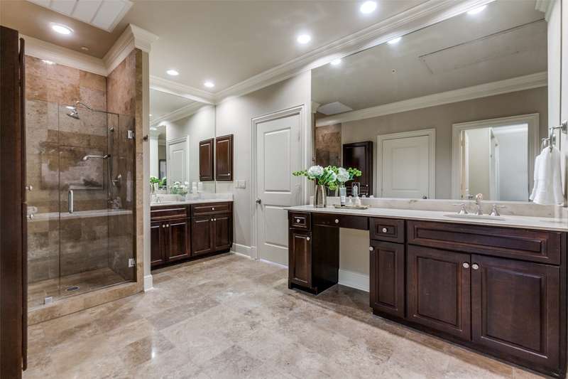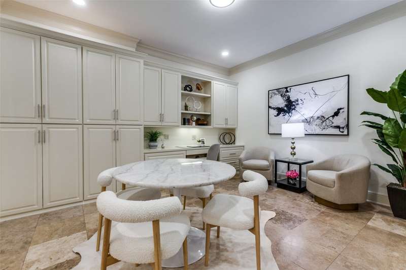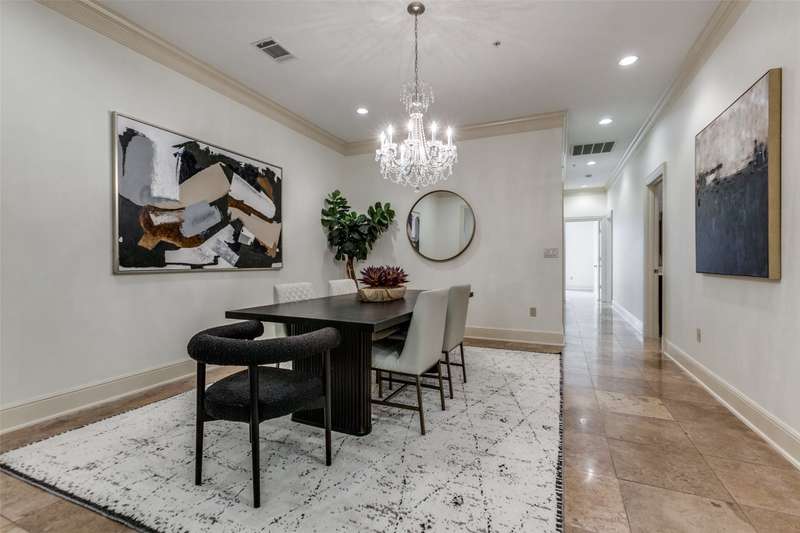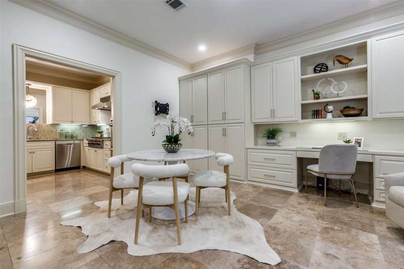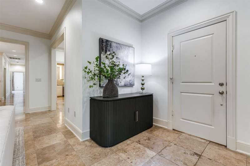 Luxury living in Preston Hollows finest condo development, the Drexel Park Hollow. This ground floor unit lives like a townhouse with private courtyards. Surrounded by an attractive brick wall, the secured courtyard entrance provides easy come & go. Or use the underground secured garage with elevator access to the entrance of the unit. The stunning interior offers wide open, generous proportions with 10 foot ceilings, travertine floors, and abundant natural light. The main living area enjoys a cast stone fireplace and access to your private terrace for morning coffee or evening relaxation. The versatile second living area provides a built-in office space with storage and file drawers, while also allowing space for a breakfast table and casual lounge area. The fully equipped kitchen offers granite counters and top appliances including Wolf gas range top, Thermador double ovens, Sub-Zero, Bosch DW, and microwave. Fabulous primary suite offers a sitting area, access to rear patio, and luxurious bath with double vanities, shower with frameless glass, jetted tub, and a closet requiring its own zip code! Perfect location near park + Preston Hollow and Park Cities restaurants and shopping. Easy to lock & leave accommodating a versatile lifestyle!