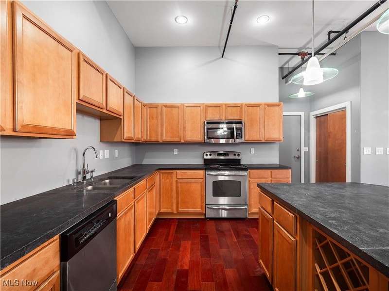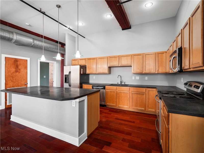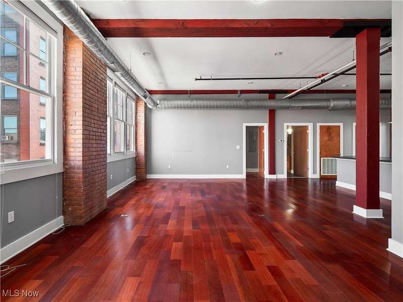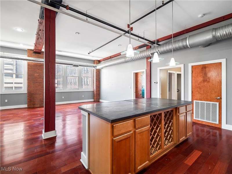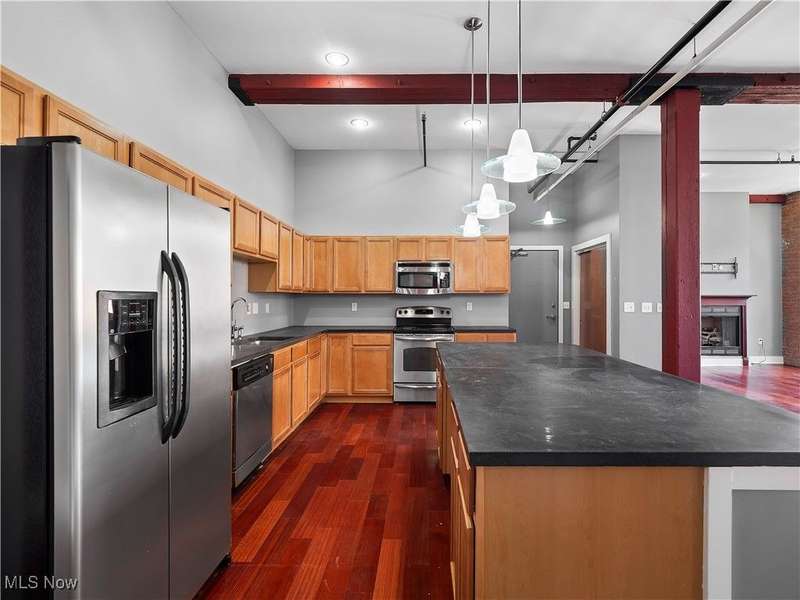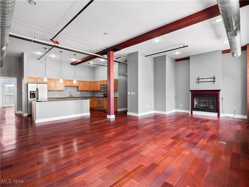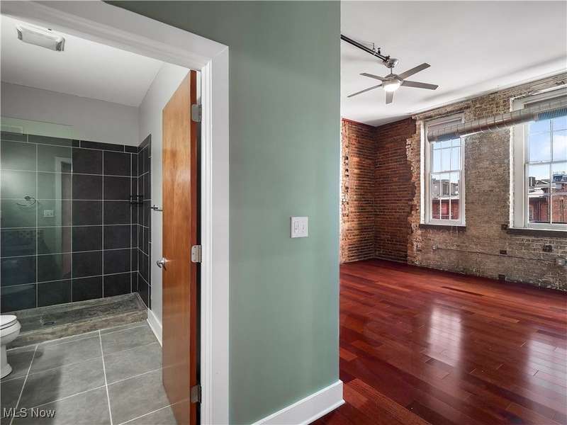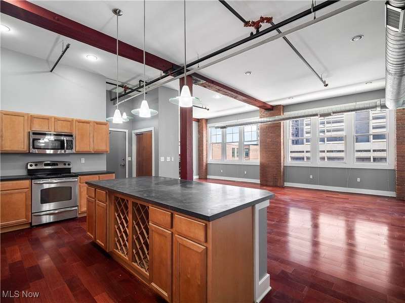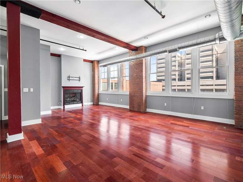 Extraordinary home in the City. Rare for Downtown Cleveland, this condominium has three-bedrooms and is just over 1,800 square feet. With the best floorplan in the building, residence #401 has windows on both sides of the building facing West Third and West Sixth Streets. Soaring ceilings, hard surface flooring throughout, and exposed brick are some of this light-filled home's fabulous features. The spacious living room - with a fireplace and wall of windows - seamlessly flows into the kitchen featuring a large island, stainless appliances, and lots of cabinet space. The principal suite has an en suite bath with large walk-in shower. A guest bedroom, second full bath with a bathtub, in-unit laundry, and THIRD bedroom with balcony completes this home! The Erie Building is tucked away on a one-way street in the Warehouse District and is just steps from nightlife, all major sports venues, fine dining, new Sherwin Williams HQ.