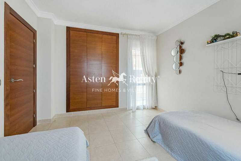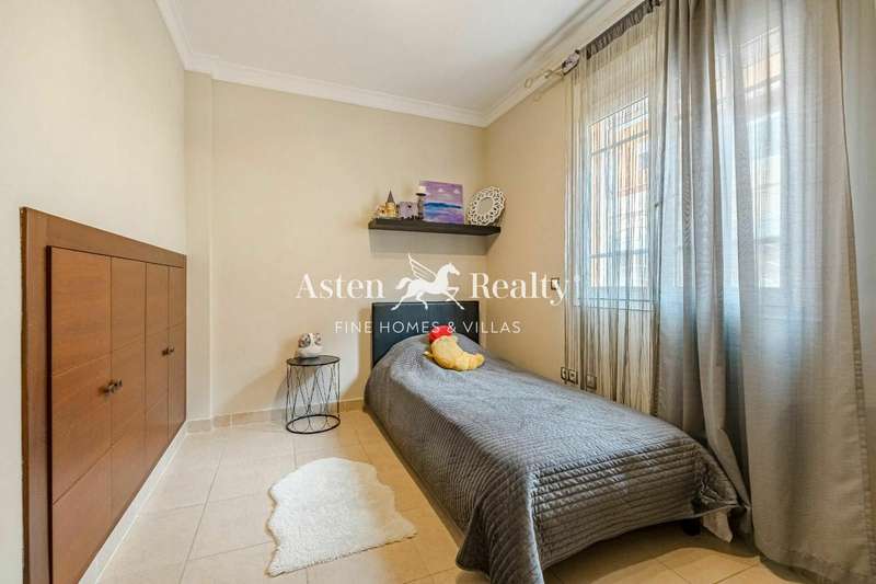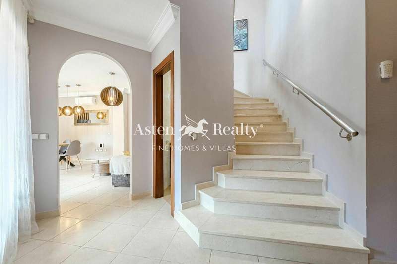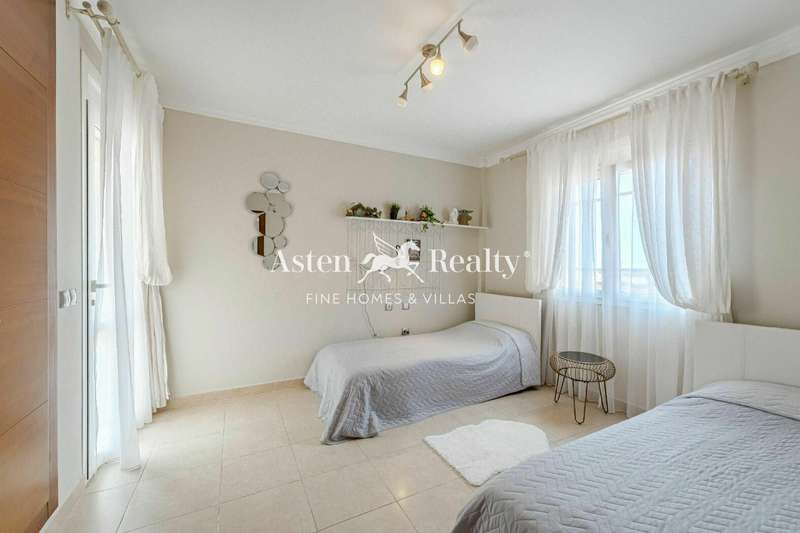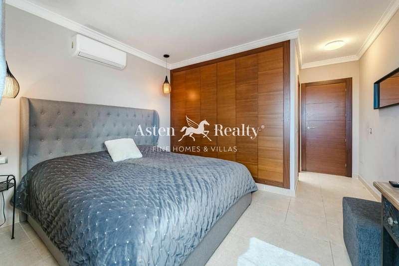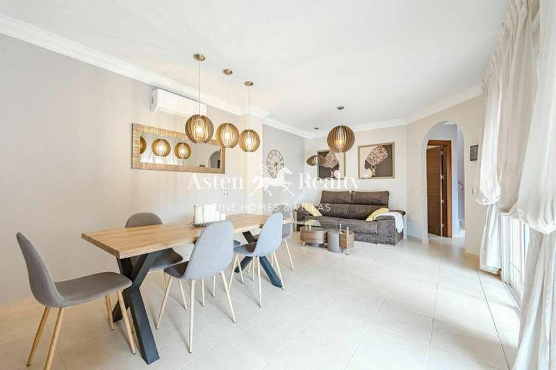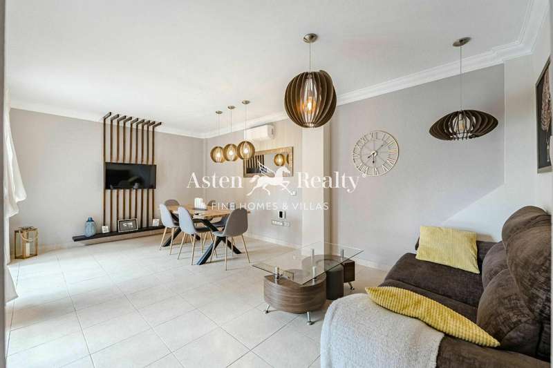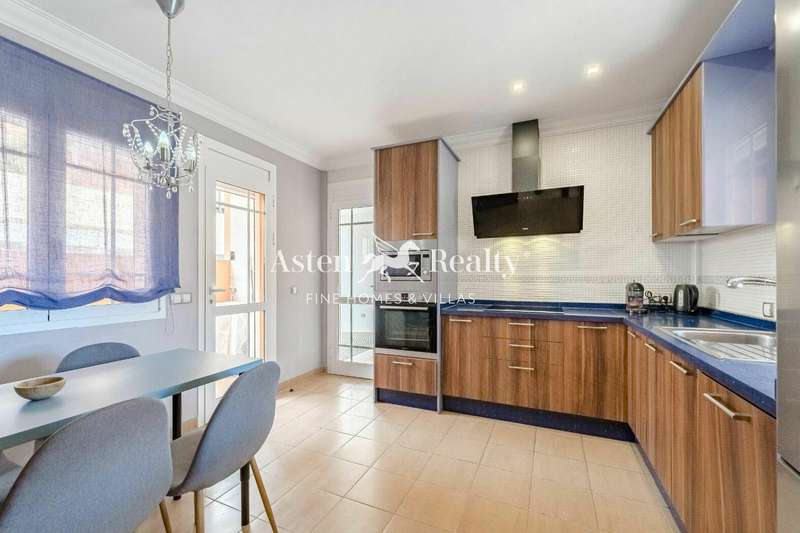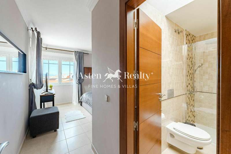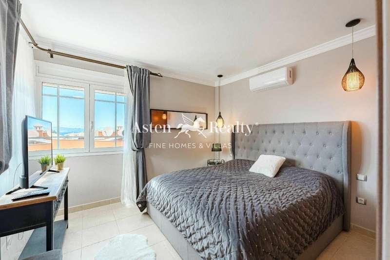 Fantastic detached villa for sale at the entrance to Los Cristianos in the Mesetas del Mar complex. 200 m2 inside distributed in 4 bedrooms, 3 bathrooms, a spacious living room, separate kitchen, a terrace with a partial ocean view, a terrace with swimming pool and a spacious garage for two cars.