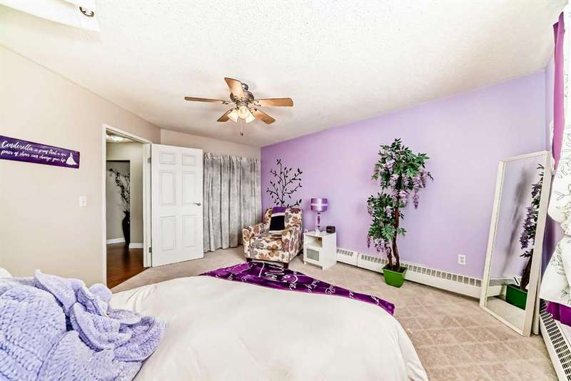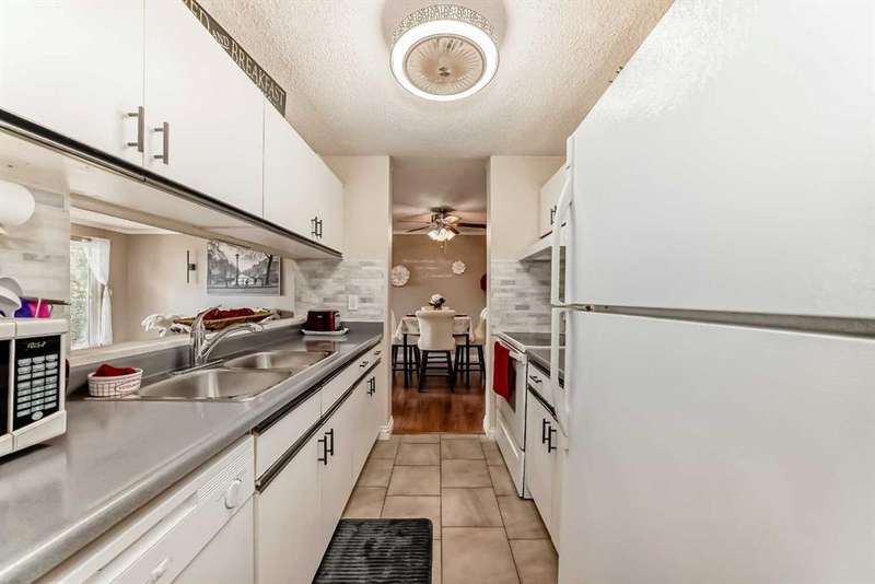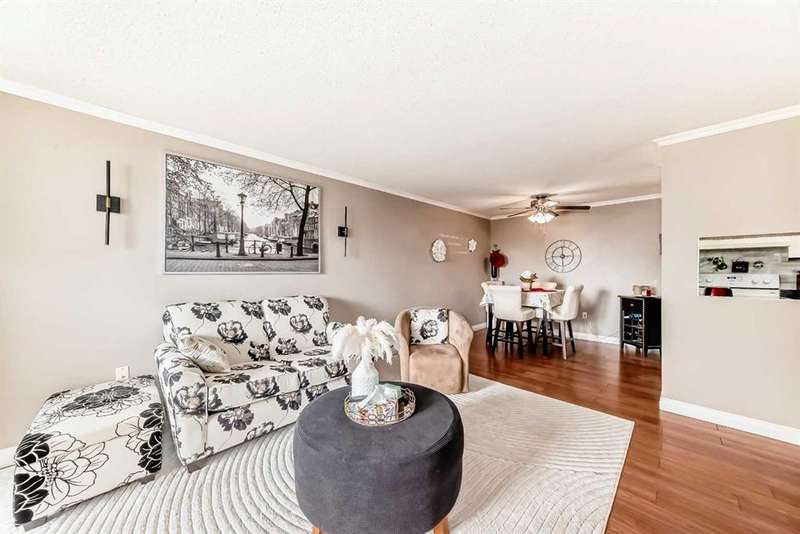 Enjoy effortless connectivity with quick access to Downtown, Deerfoot Trail, and Stoney Trail — a truly prime location. Start Building Equity in Dover Pointe! Step confidently into homeownership with this bright and beautifully refreshed two-bedroom, one-bath condo in the heart of Dover. Perched on the third floor, this spacious unit welcomes you with sunny southwest views from your private balcony — the perfect spot for your morning coffee or after-work unwind. Inside, you’ll find a functional galley kitchen featuring NEW tiles, NEW ceiling fan, NEW hood fan, and a newer stove — blending practicality with a fresh modern touch. The open dining area flows easily into a large, light-filled living room, ideal for hosting friends or relaxing solo. Throughout the home, stylish laminate flooring, crown mouldings, and NEW carpet in both bedrooms add comfort and polish. Each bedroom offers excellent closet space, while in-suite laundry keeps everyday life simple and convenient. This well-maintained, pet-friendly complex includes heat and water in your condo fees, plus one assigned outdoor parking stall. Your furry friend will love the Southview Off-Leash Park just a short 13-minute walk away, and your inner foodie will appreciate being steps from community restaurants — with Deerfoot Meadows (IKEA, Costco, Walmart & more) just minutes away. Commuting is effortless, with quick access to downtown by car or transit. Why rent when you can own your own place — comfort, convenience, and value all in one!