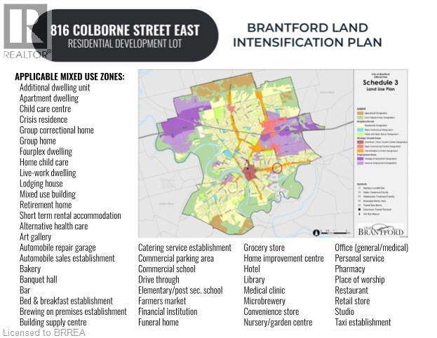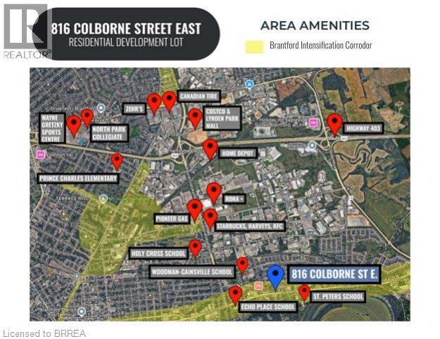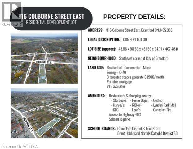ATTENTION DEVELOPERS! Welcome to 816 Colborne Street, Brantford! Nestled in the desirable and family-friendly Echo Place neighbourhood, this property offers the perfect blend of convenience and potential. Situated on an impressive lot measuring approximately 43.86ft x 90.63ft x 451.59ft x 94.71ft x 407.48ft, this residential gem is part of Brantford's Intensification Corridor, providing excellent opportunities for future growth. Under the new zoning by-laws with the City of Brantford, the lot will accommodate a total buildable footprint of 10,167 square feet, with a height of 38 meters. Amenities abound with shopping centres, big-box stores, and a variety of restaurants just moments away along Wayne Gretzky Parkway and Colborne Street. In proximity to schools and parks, as well as easy access to Highway 403! Serviced by the Grand Erie District School Board and the Brant Haldimand Norfolk Catholic District School Board, this property perfectly suits future families seeking a community atmosphere. Build in one of Brantford’s most sought-after locations! (id:7434)