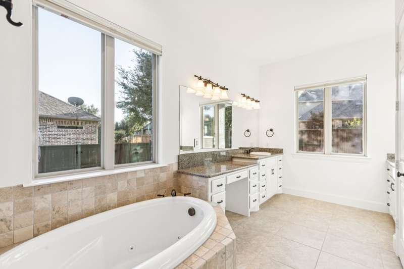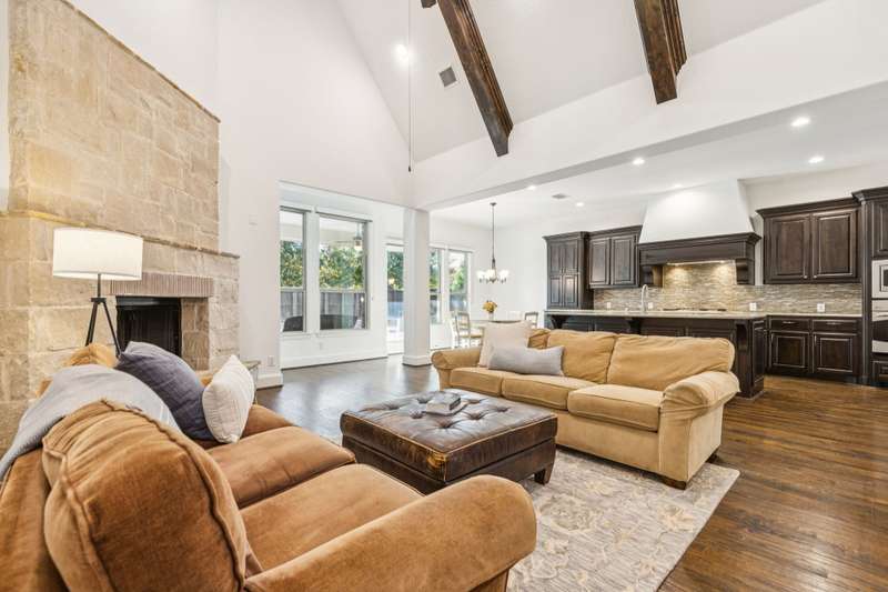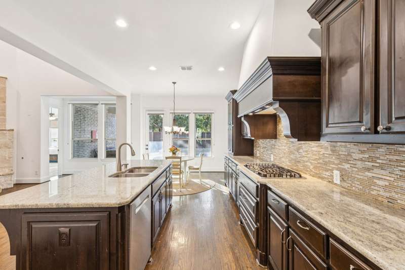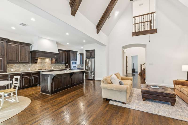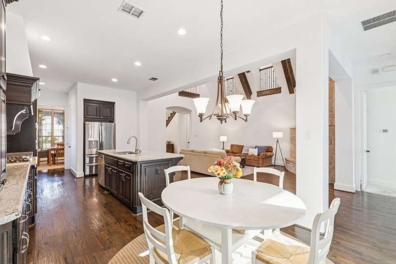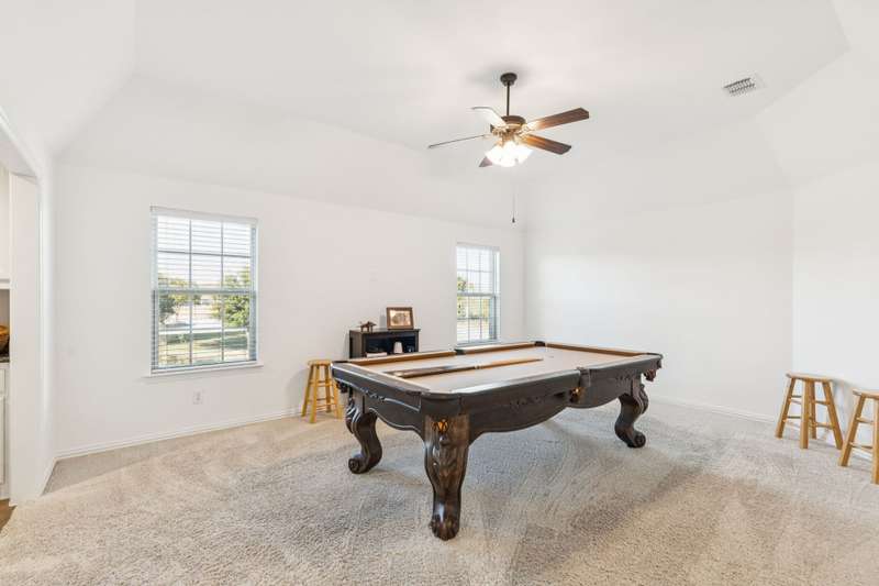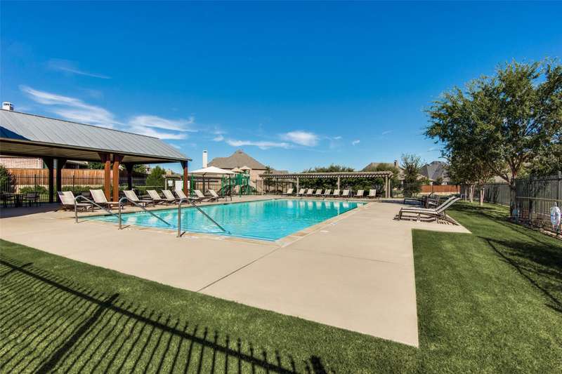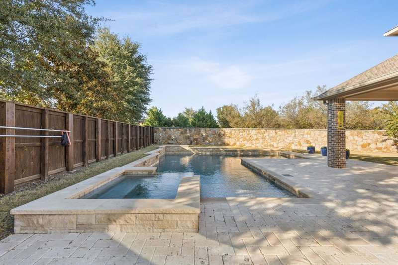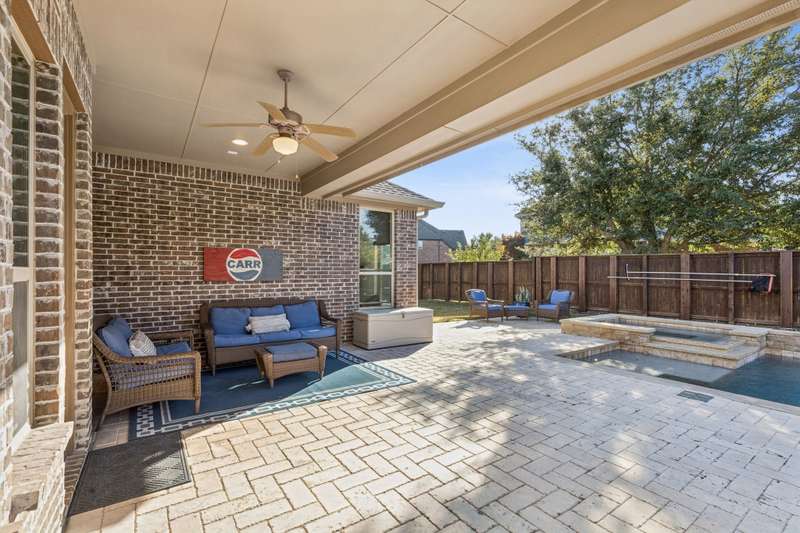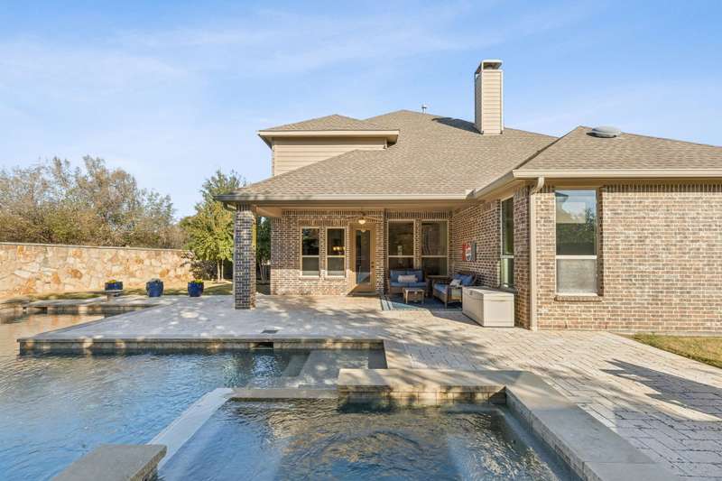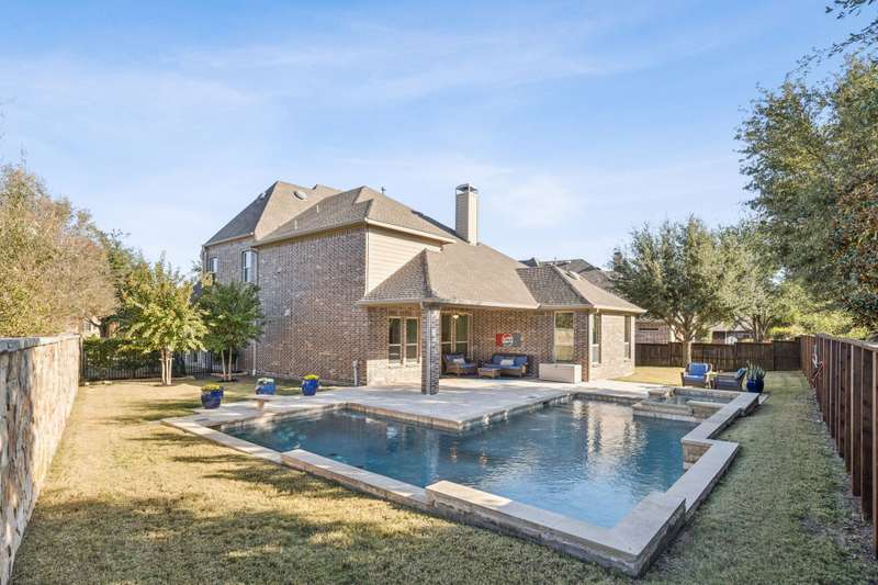 Welcome to 921 Escalante in Whitley Place, a stunning Prosper residence that perfectly blends elegance, comfort and resort-style living! This beautifully crafted home impresses from the moment you arrive with its inviting covered front porch, a perfect place to relax and enjoy the peaceful surroundings. Step inside to find rich hardwood floors that flow seamlessly through the entry, dining, family room, and kitchen, creating warmth and continuity throughout the main living areas. A private study with French doors provides a quiet space for work or reading. The family room is the heart of the home, featuring a striking stone fireplace, soaring vaulted ceilings with wood beams, and large windows that fill the space with natural light. The open-concept design leads effortlessly into the chefs kitchen, complete with a large island, granite countertops, stainless steel appliances, a gas cooktop and an expansive breakfast nook. The luxurious primary suite on the main floor is a true retreat with ample space for a sitting area and an en-suite bath featuring granite countertops, a garden tub, separate shower and a spacious walk-in closet. A secondary bedroom with a full bath downstairs provides excellent flexibility. Upstairs, discover a large game room and a dedicated media room perfect for movie nights. Two additional bedrooms share a stylish Jack-n-Jill bath, offering comfort and privacy. The utility room is well-equipped with space for a freezer and plumbing for a sink, adding to the homes practicality. Step outside to your personal paradise! The covered patio overlooks an incredible backyard oasis complete with a sparkling pool, relaxing spa, and diving board, the ultimate setup for year-round fun and relaxation. Theres plenty of space for outdoor dining, lounging, or hosting unforgettable summer gatherings. Located in the sought-after Whitley Place community, residents enjoy walking trails, ponds, parks, playgrounds and access to top-rated Prosper ISD schools.