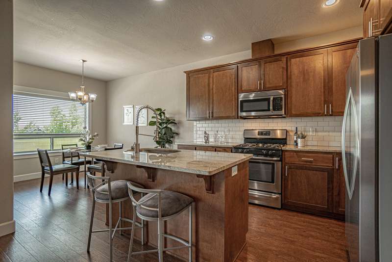 Style, Space & Spectacular Ashland Views! This Meadowbrook Park townhome features main-level living with open-concept design, abundant natural light, and stunning views. Enjoy high-end finishes throughout—corner fireplace, engineered wood floors, stainless steel appliances, granite countertops, and a private covered balcony. The spacious main-level primary suite has a beautifully tiled bath, walk-in shower, and double vanities. The guest level offers two bedrooms, a full bath, extra storage space and more amazing views. A large double garage includes extra storage and workshop space. Elevator-ready for lifelong accessibility. All in Ashland's vibrant Meadowbrook Park at North Mountain!